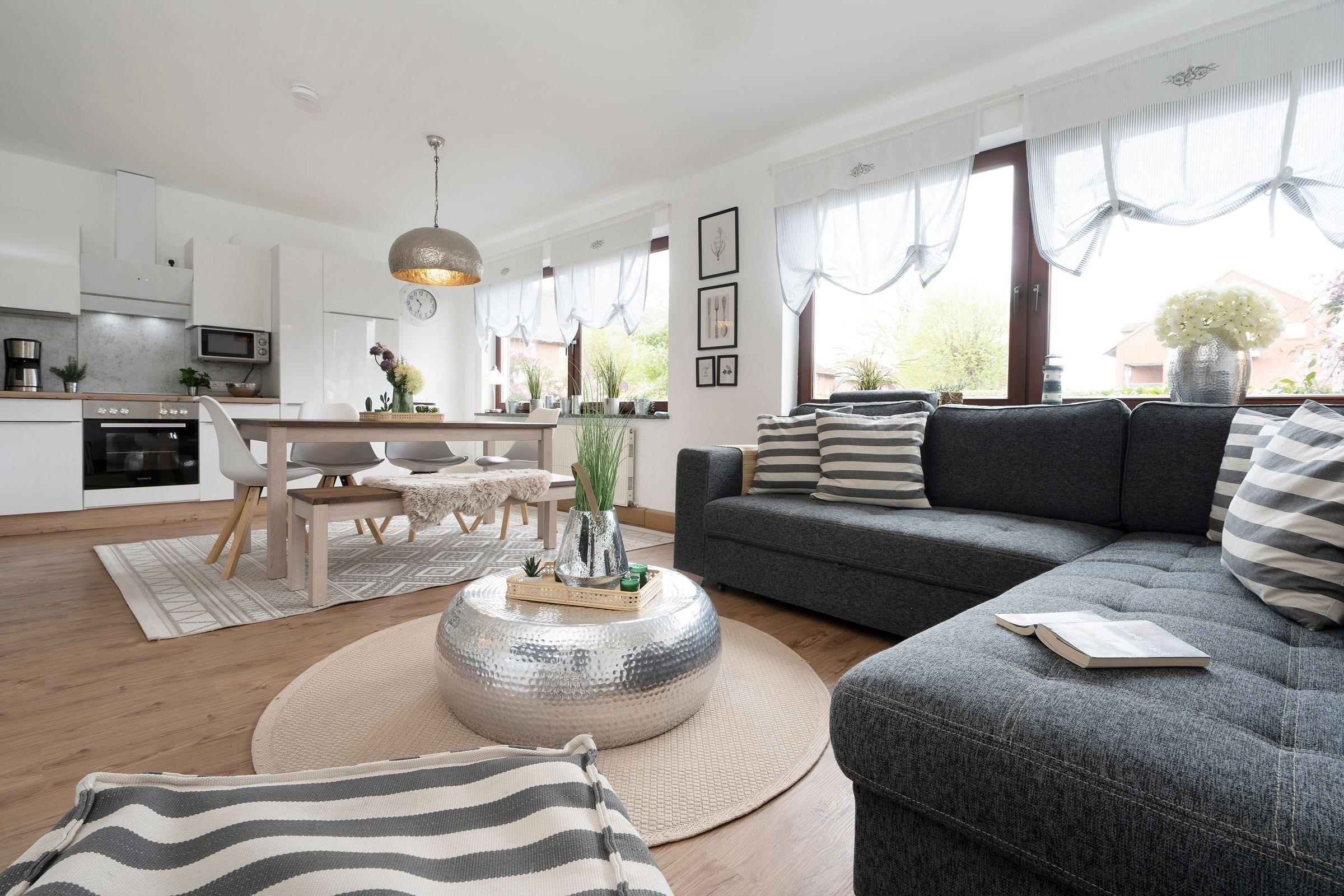 Durch einen kleine Flur gelangen Sie in den geschmackvoll eingerichteten Wohn-, Ess- und Kochbereich. In der gut ausgestatteten Küche können Sie sich austoben, falls Sie mal keine Lust haben, in die umliegenden Restaurants zu essen. Am großen Esstisch sind Sie dann ganz für sich und können ausgiebig über die möglichen Aktivitäten für den kommenden Urlaubstag sprechen. Das gemütliche Sofa ist nicht nur der perfekte Platz für spannende Fernsehabende sondern verwandelt sich zur Nacht auch in eine bequeme Schlafstätte (ca. 150x230 cm). Das separate Schlafzimmer mit Doppelbett (ca. 2x 80x200 cm) und Kleiderschrank liegt direkt nebenan. Zusätzlich verfügt die Wohnung über einen kleinen separaten kuscheligen Rückzugsort mit einem Kojenbett (ca. 120x200 cm) und eigenem Fernseher. Auch das helle Badezimmer mit ebenerdiger Dusche und Waschmaschine wird Sie begeistern. Auf der Terrasse können Sie lauschige Abende bei einem guten Glas Wein ausklingen lassen.