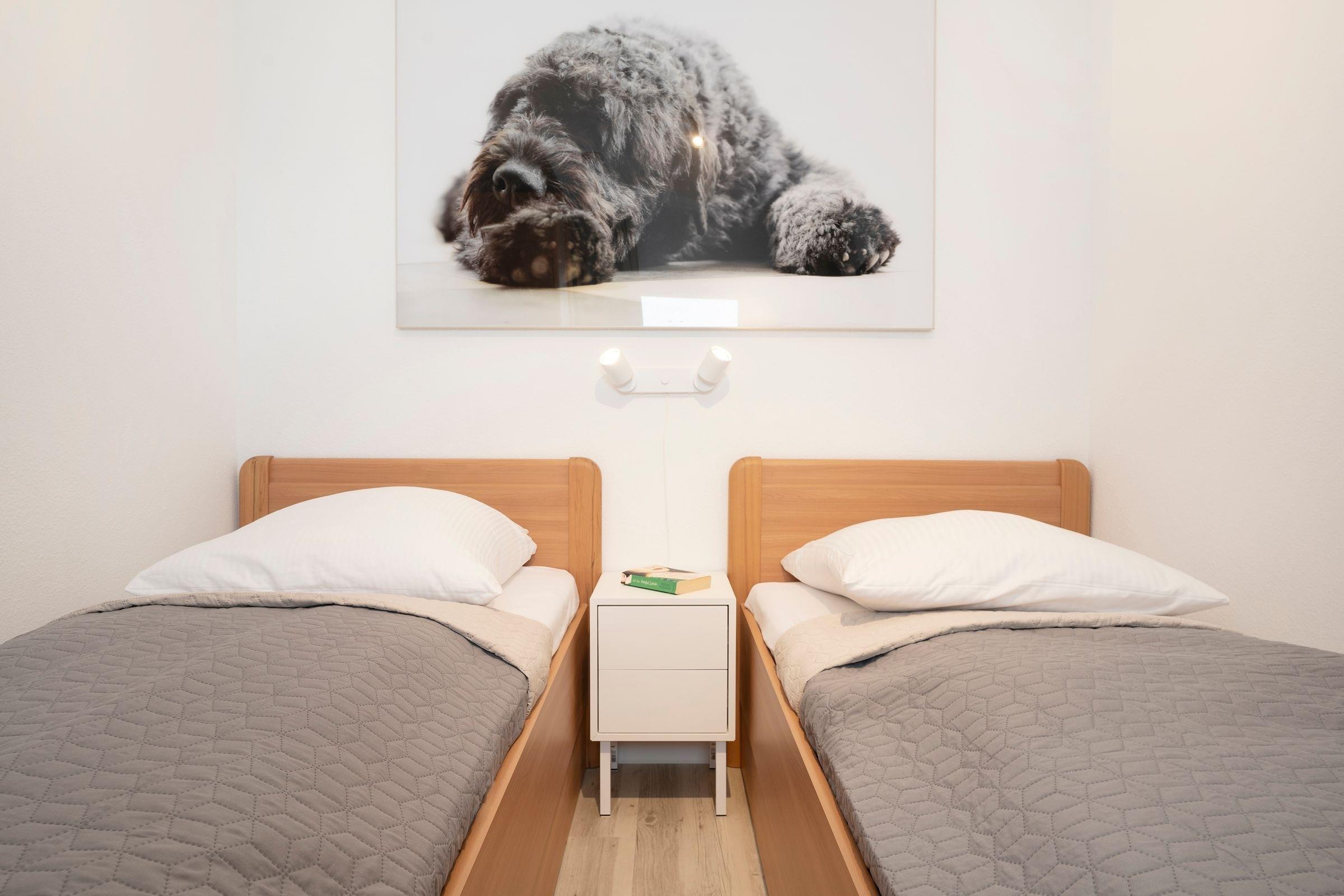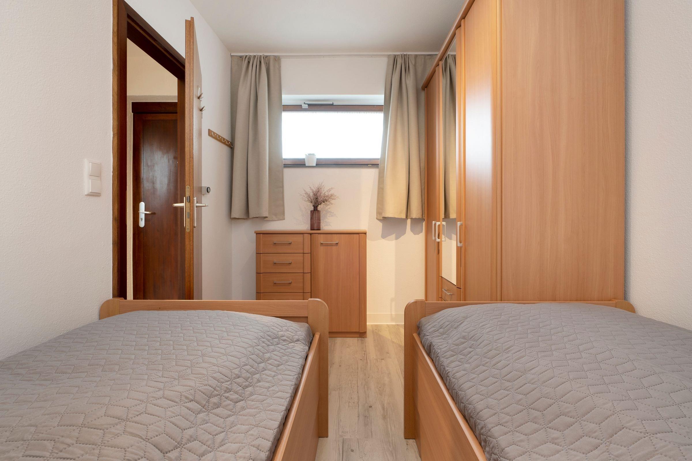 Schlafzimmer: 2x Einzelbett (je 90x200cm), Kleiderschrank, Verdunkelung (Vorhang), kein Platz für Babybett vorhanden