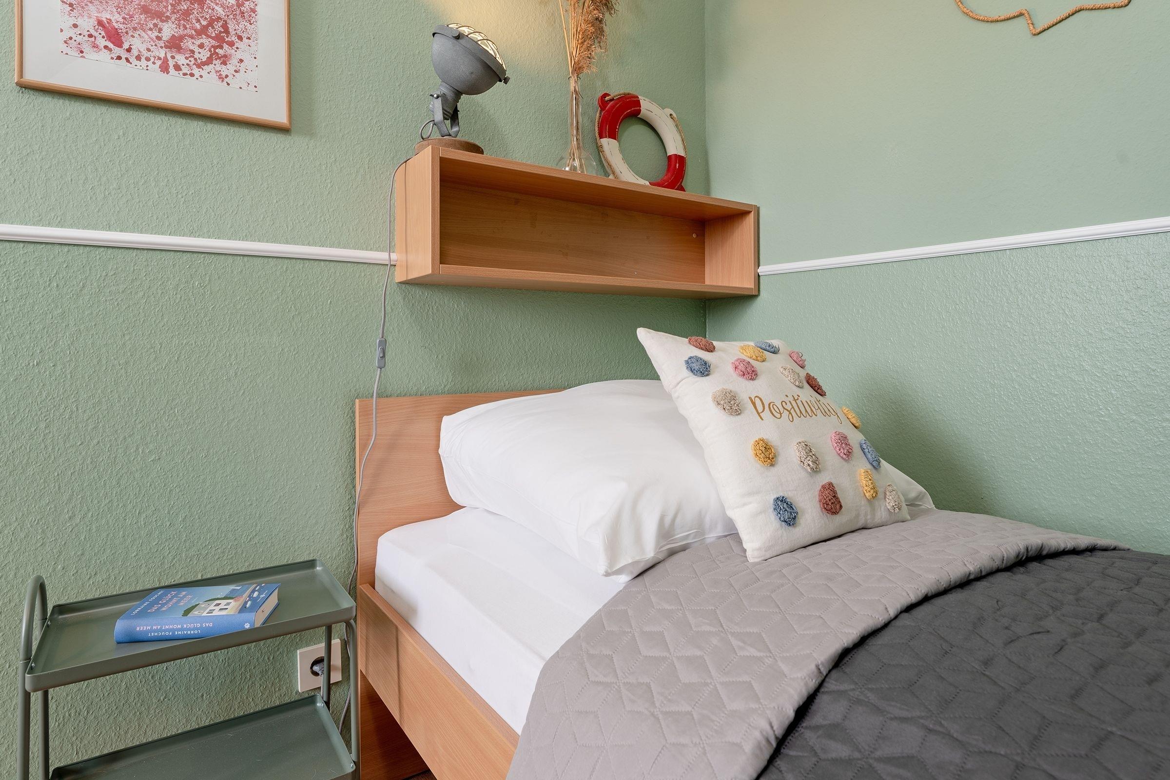 Freundlich und farbenfroh präsentiert sich die Ferienwohnung Wohlfühl-Koje – und der Name ist Programm: Hier werden Sie sich sofort wohlfühlen. Die geschmackvolle, individuelle Einrichtung zaubert sofort gute Laune. Nehmen Sie Platz auf der kuscheligen Sofalandschaft und genießen Sie Ihre Auszeit. Ein Smart-TV sorgt für entsprechende Unterhaltung. Bei schönem Wetter lockt der gemütlich möblierte Süd-West-Balkon gleich nebenan – sicher Ihr neuer Lieblingsplatz, von dem Sie sogar einen seitlichen Blick in Richtung Ostsee genießen können. Freuen Sie sich über die schöne Aussicht und stoßen Sie auf Ihren Urlaub an. Sie haben es sich verdient. Die Küche ist mit einem 2-Platten-Induktionskochfeld, Espressomaschine und Geschirrspüler gut ausgestattet. Bereiten Sie sich hier Ihr leckeres Frühstück zu und schlemmen Sie anschließend in der Ess-Ecke. Für die Nacht steht Ihnen in einer geschützten Nische im Wohn-/Essbereich ein bequemes Doppelbett (160x200 cm) zur Verfügung. Weiterhin befinden sich im separaten Schlafzimmer 2 Einzelbetten (je 90x200 cm). Hier werden Sie garantiert wundervoll von der tollen Ostseeküste träumen. Beide Zimmer bieten übrigens genug Platz, um ein Kinderreisebett aufzustellen. Das bunte Duschbad mit Handtuchwärmer garantiert einen munteren Start in den neuen Urlaubstag.