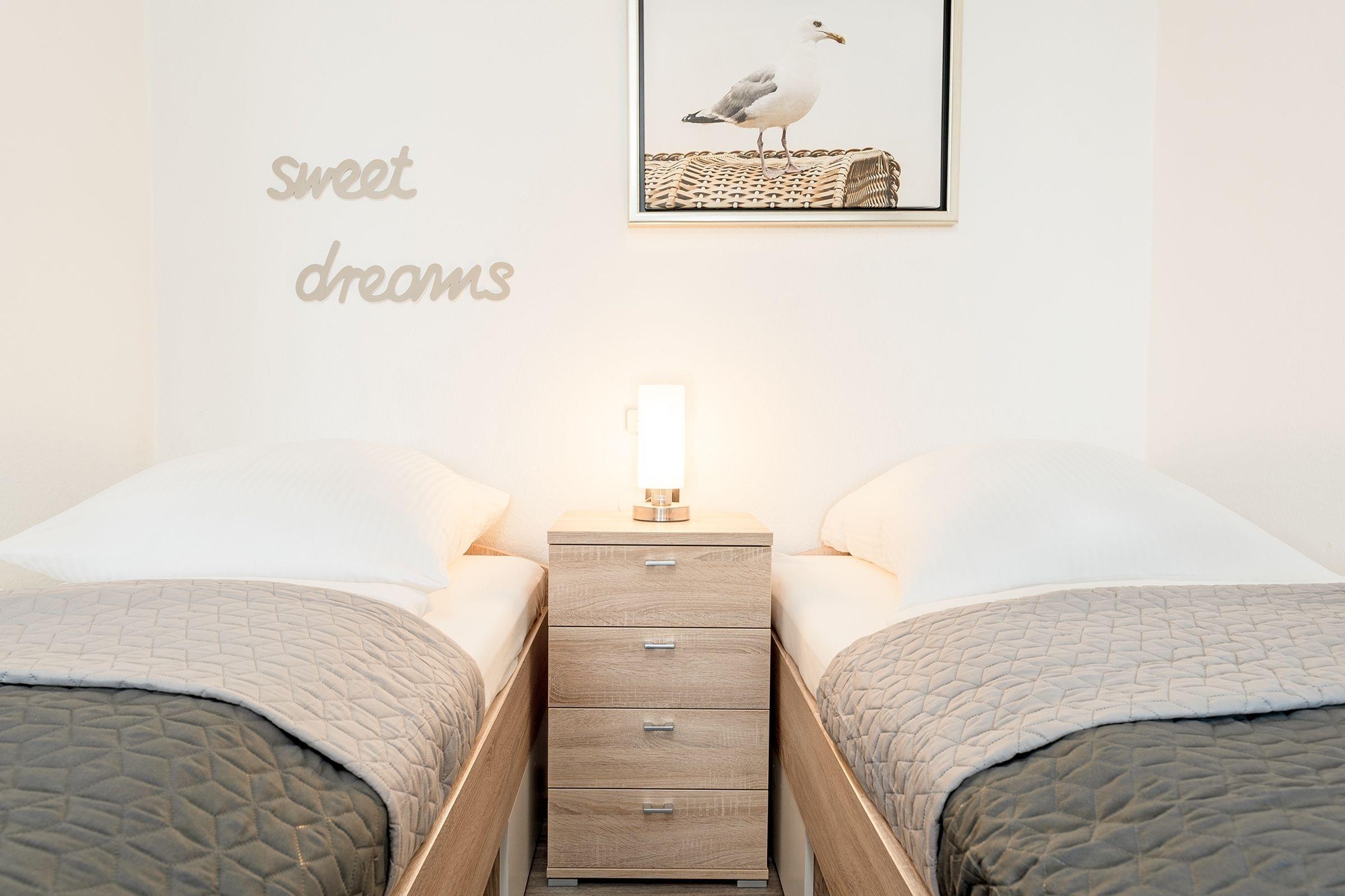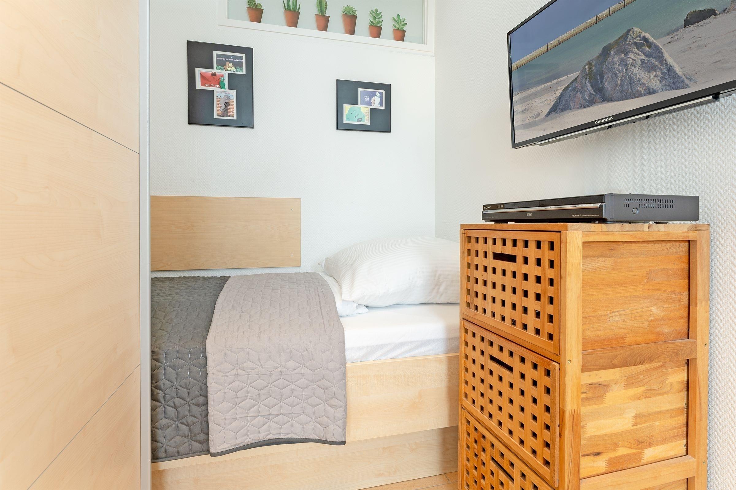 Schlafzimmer: 2 Einzelbetten (je ca. 90x190cm), Kleiderschrank, Verdunkelung (Rollos), TV, kein Platz für Kinderreisebett vorhanden