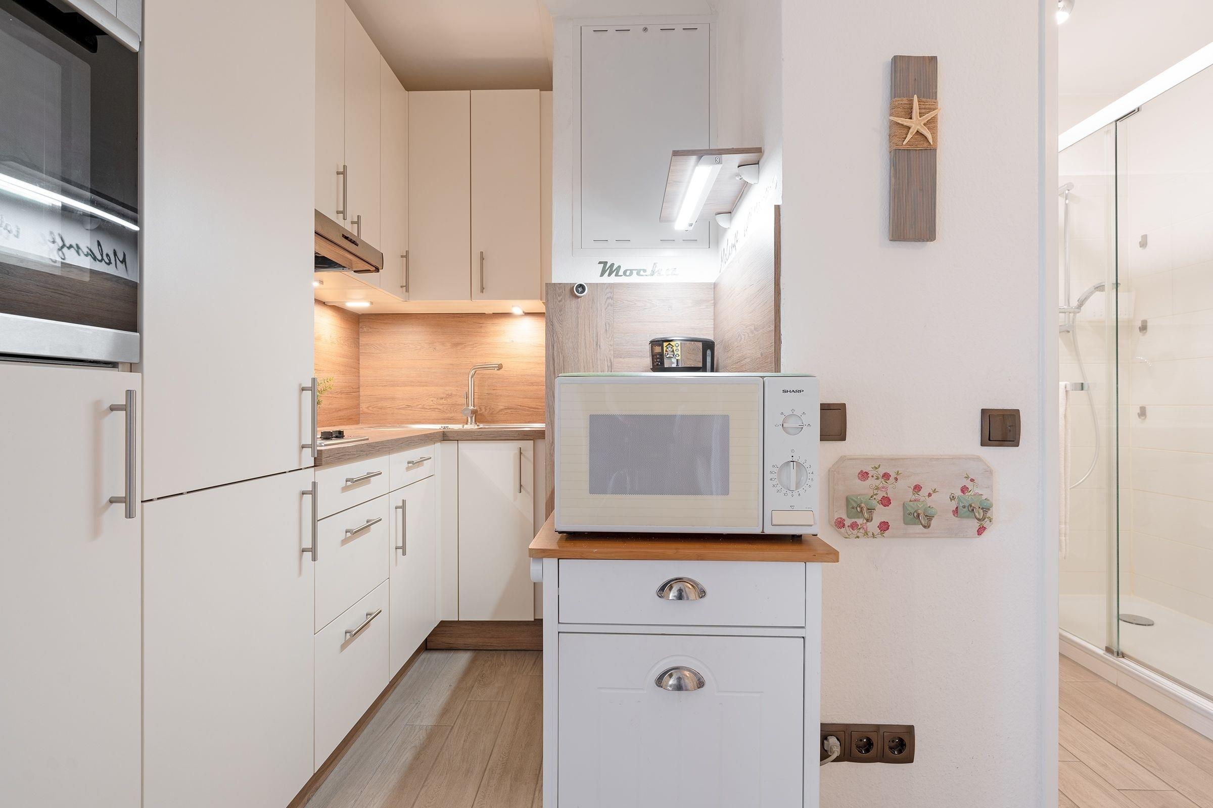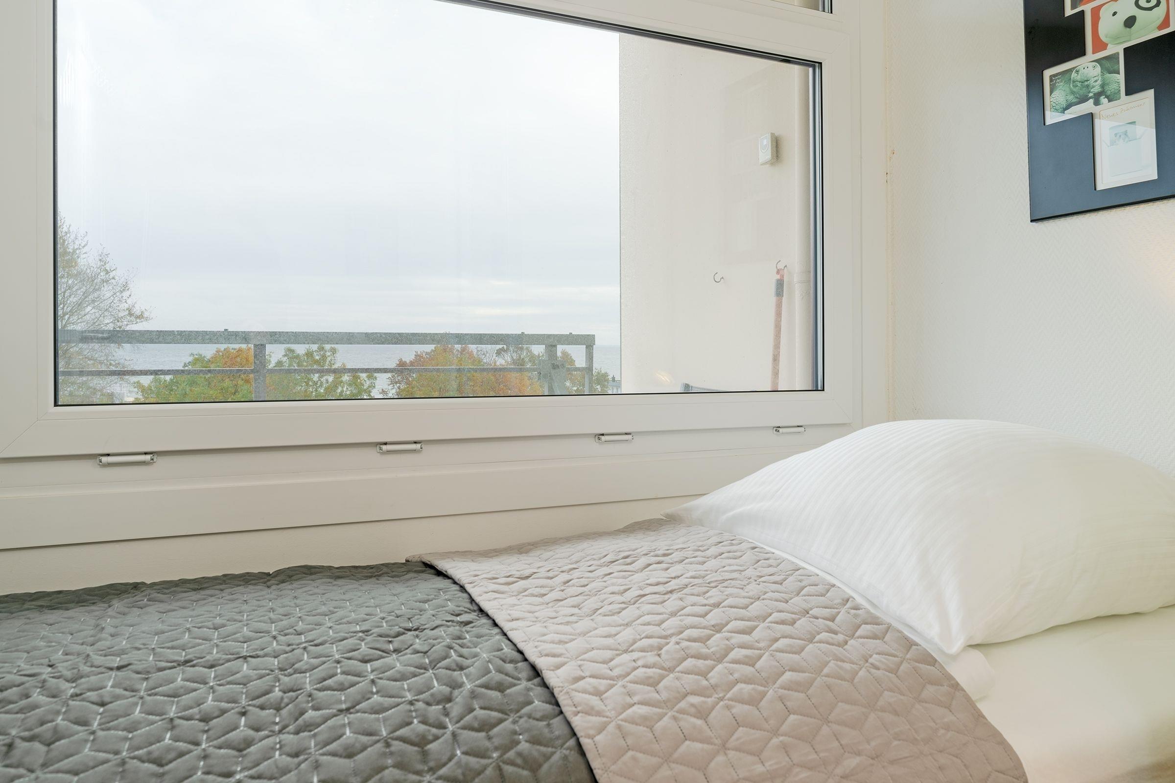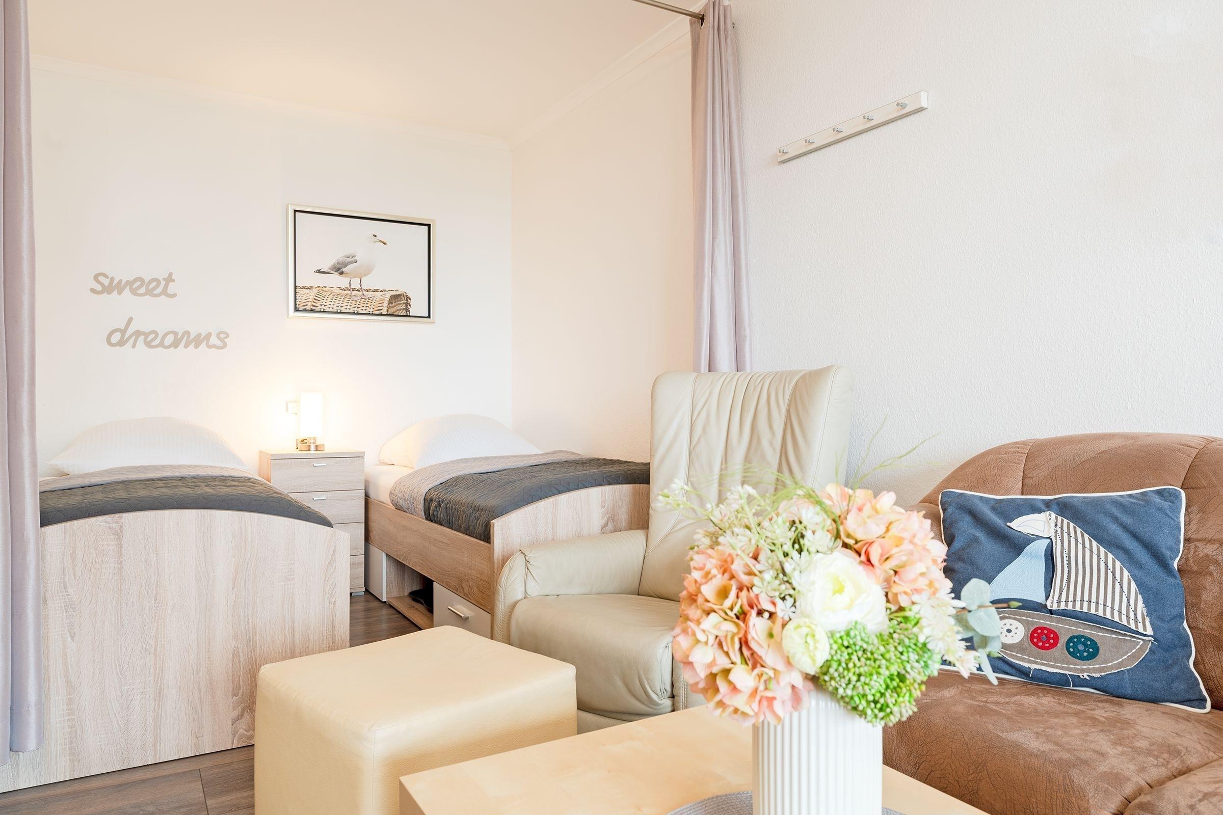 Stellen Sie sich vor, Sie treten auf den Balkon und können einen herrlichen Blick über die Ostsee genießen. Diese gemütliche Wohnung in den Strandappartements am Leuchtturmweg macht dies möglich. Ein Fahrstuhl bringt Sie bequem zum Objekt in den 4. Stock – und wenn Sie eintreten, fühlen Sie sich sicher sofort gut aufgehoben. Die Einrichtung in warmen Erdtönen sorgt für eine angenehme Atmosphäre. Sie haben die Wahl: Verweilen Sie in der bequemen Sitzecke vor dem TV-Gerät oder sitzen Sie am Fenster in der Essecke und lassen den Blick übers Meer schweifen. Oder genießen Sie direkt die frische Seeluft gut geschützt auf dem überdachten Balkon. Der Ostseestrand ist übrigens nur rund 100 Meter entfernt. Nach einem schönen Urlaubstag an der Küste stehen für die Nachtruhe im Wohnbereich zwei Einzelbetten (je 90x200 cm) für Sie bereit. Auch im separaten Schlafzimmer befinden sich zwei Einzelbetten (je 90x190 cm). Zudem gibt es hier einen Kleiderschrank für Ihre Urlaubsgarderobe sowie ein weiteres TV-Gerät. Die kleine, aber feine Küche ist zum Wohnraum hin offen und hat eine gute Ausstattung, die eine angenehme Verpflegung im Urlaub verspricht. Das moderne, innenliegende Duschbad bietet Extras wie Föhn, Kosmetikspiegel und Handtuchwärmer.