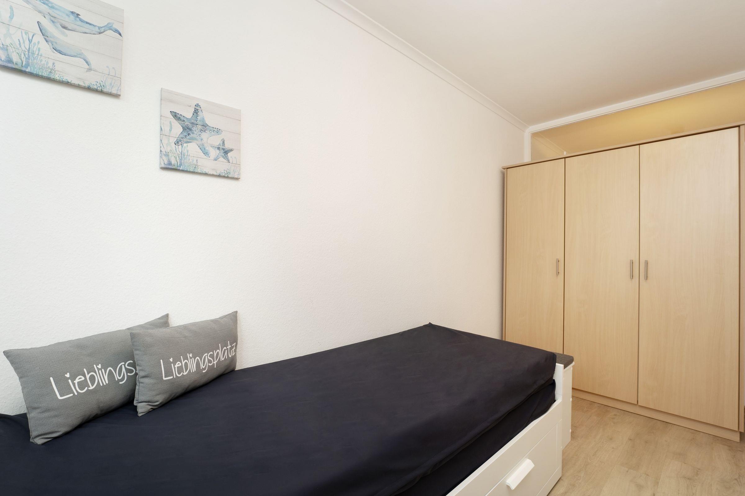 Schlafzimmer: Einzelbett (80x200 cm), Kleiderschrank, Verdunkelung (Gardine), kein Platz für Kinderreisebett