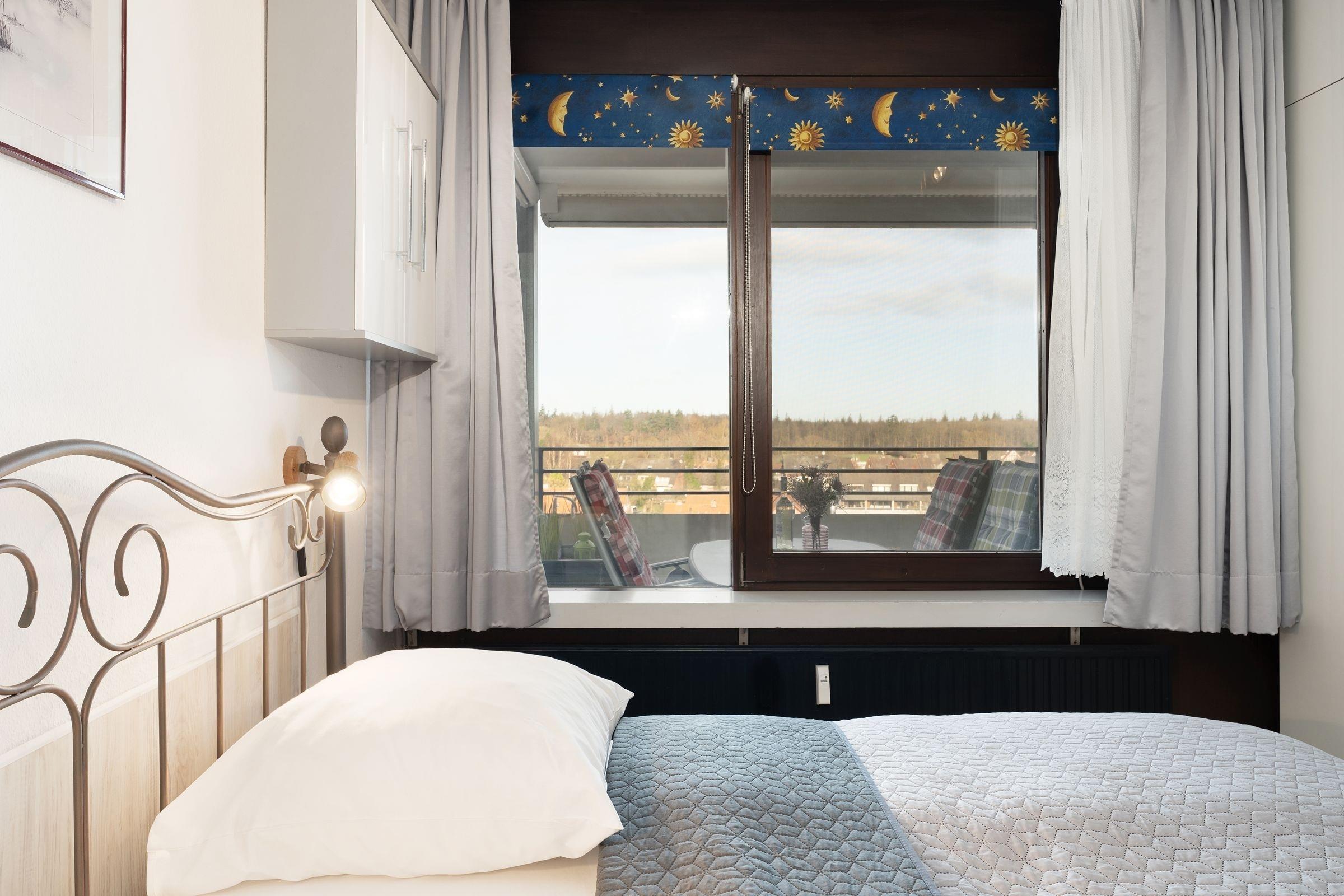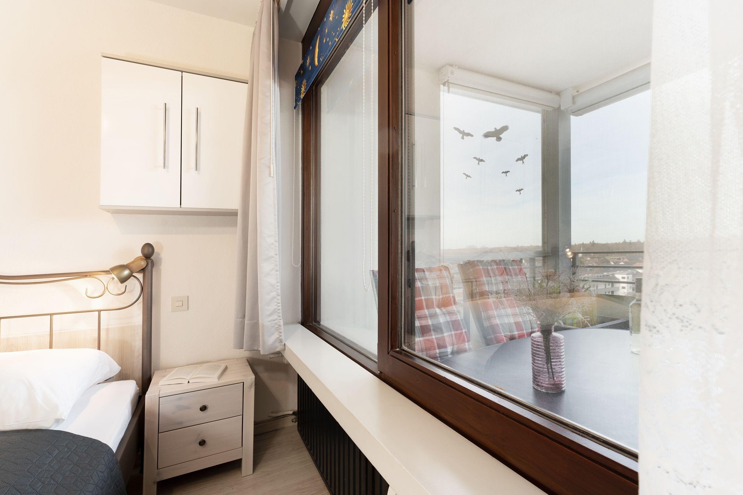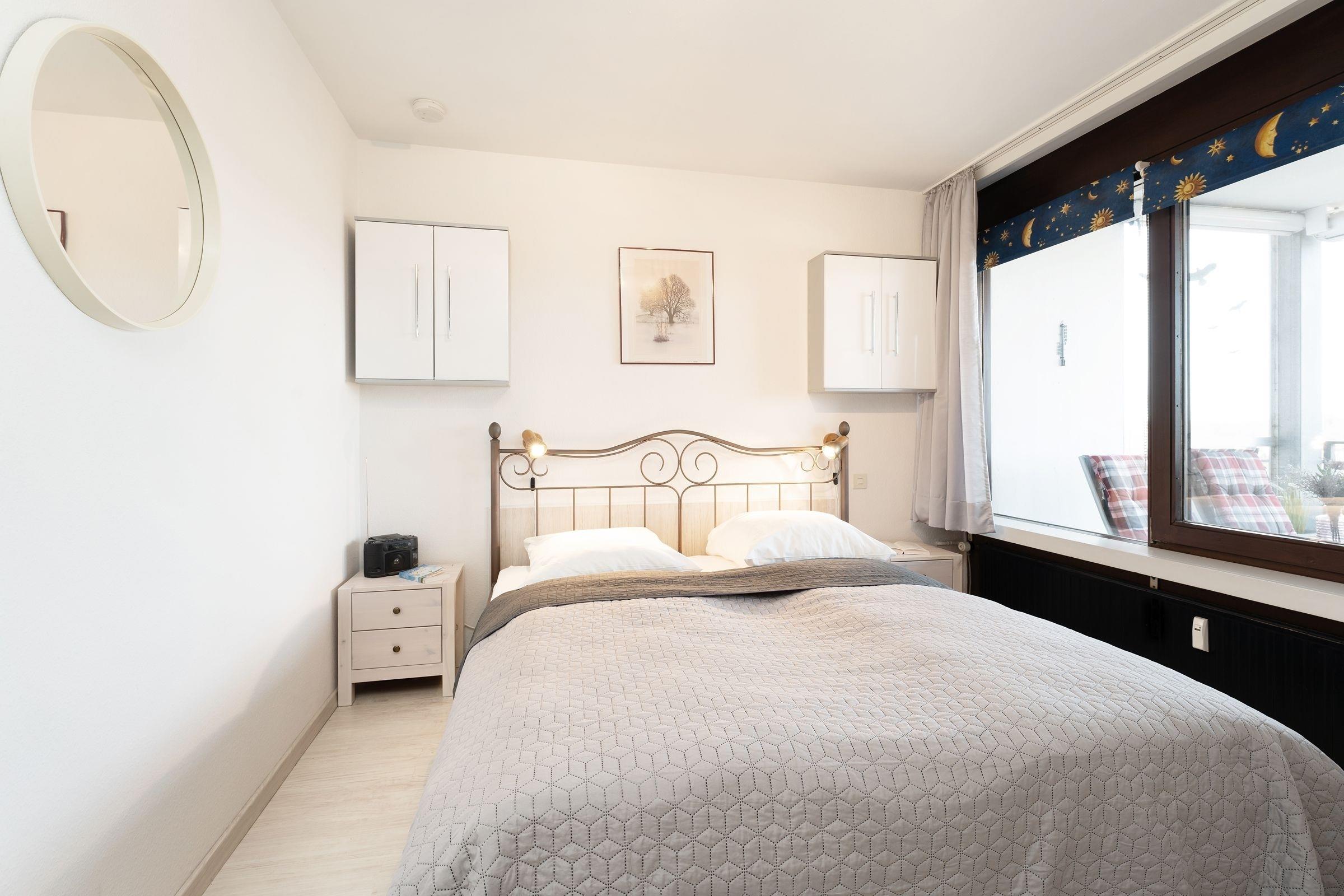 Schlafzimmer: 1 Doppelbett (2x 90x200cm), Kleiderschrank, Verdunkelung: Rollo, kein Platz für ein Babybett vorhanden