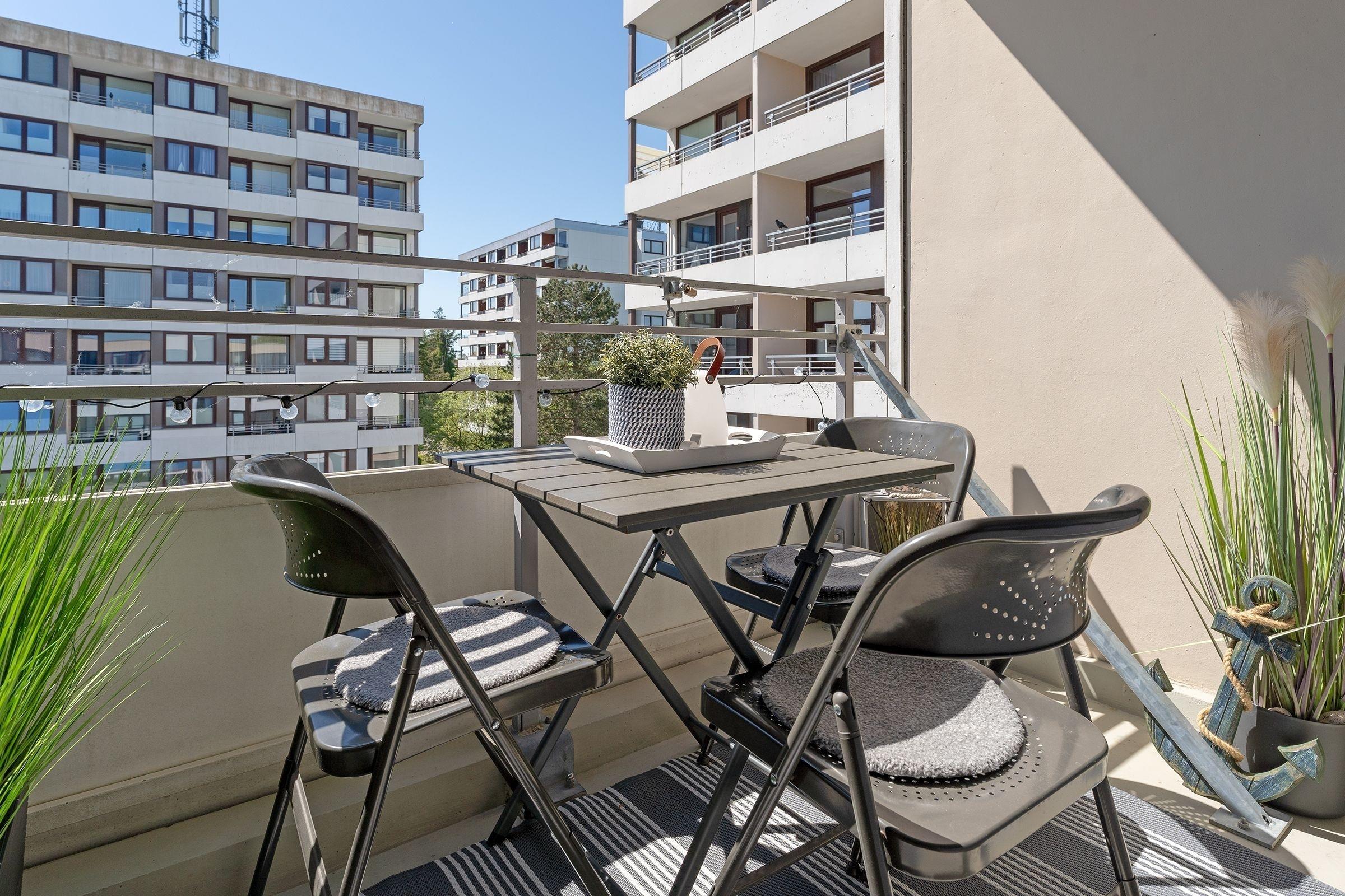 Charmante Ferienwohnung mit Balkon und seitlichem Meerblick in Kellenhusen, ideal für entspannte Strandtage und Familienurlaub.