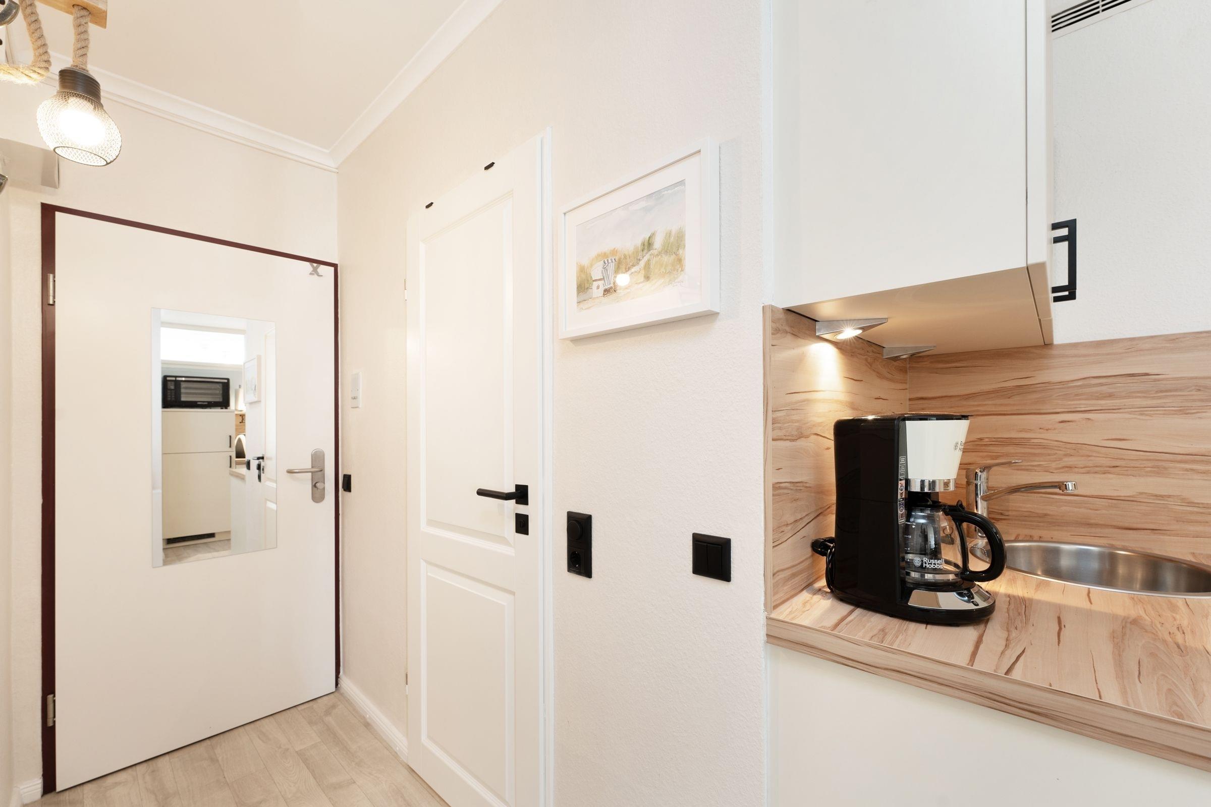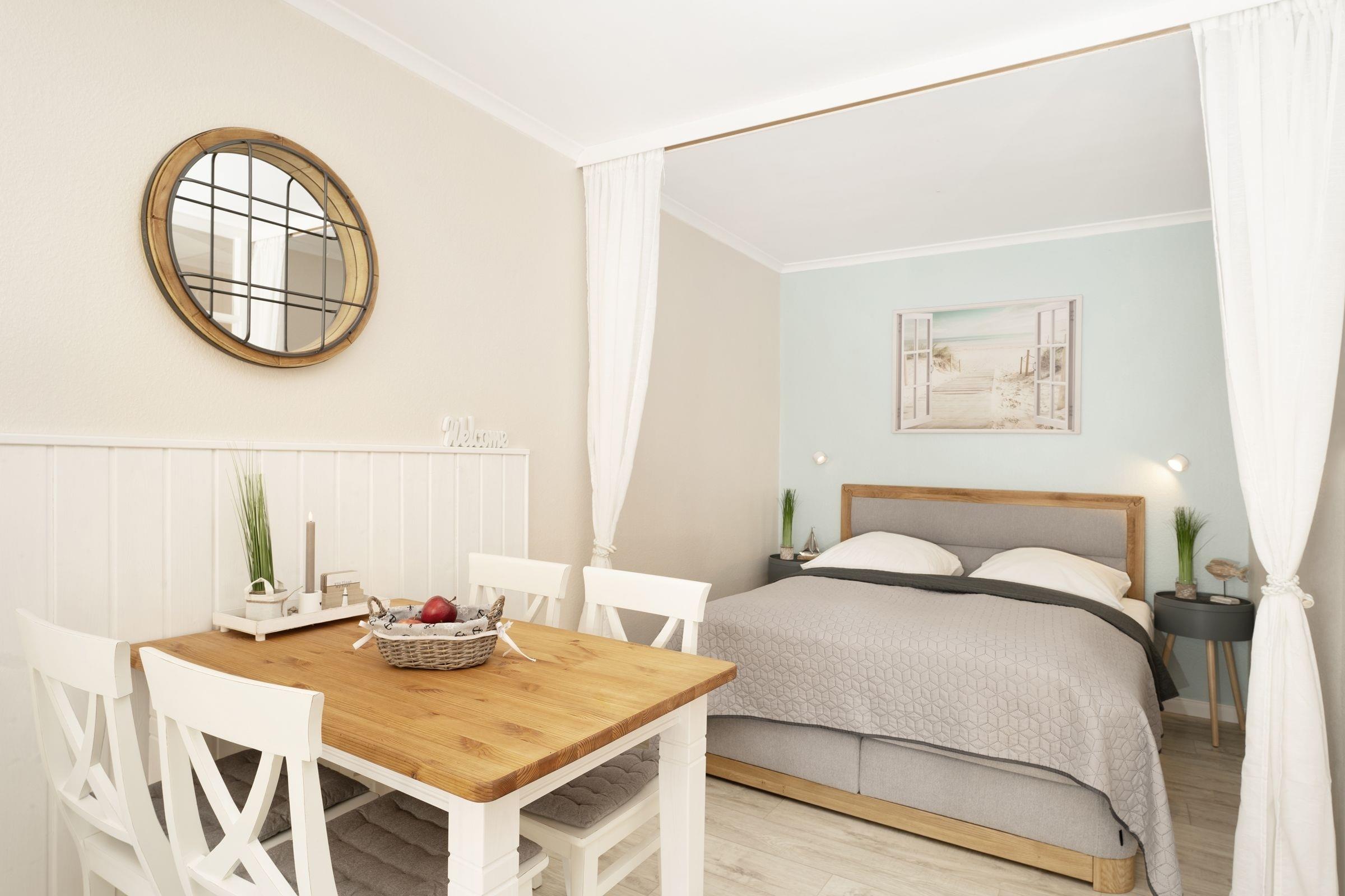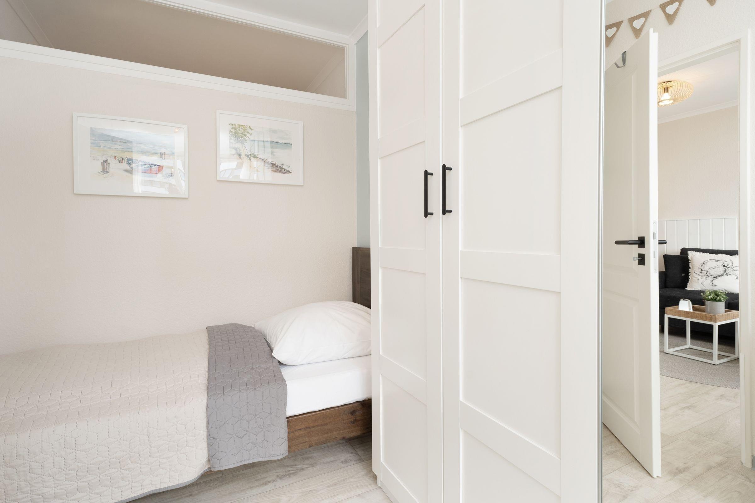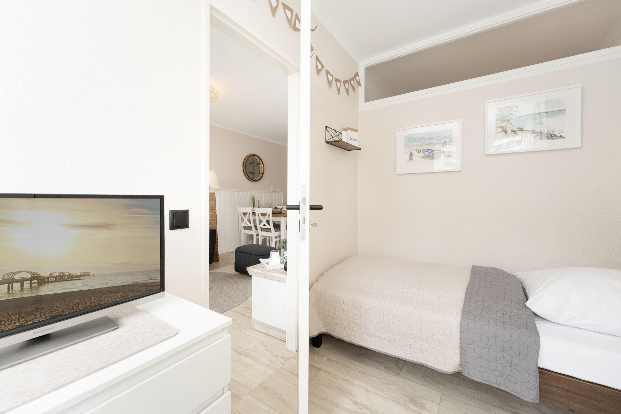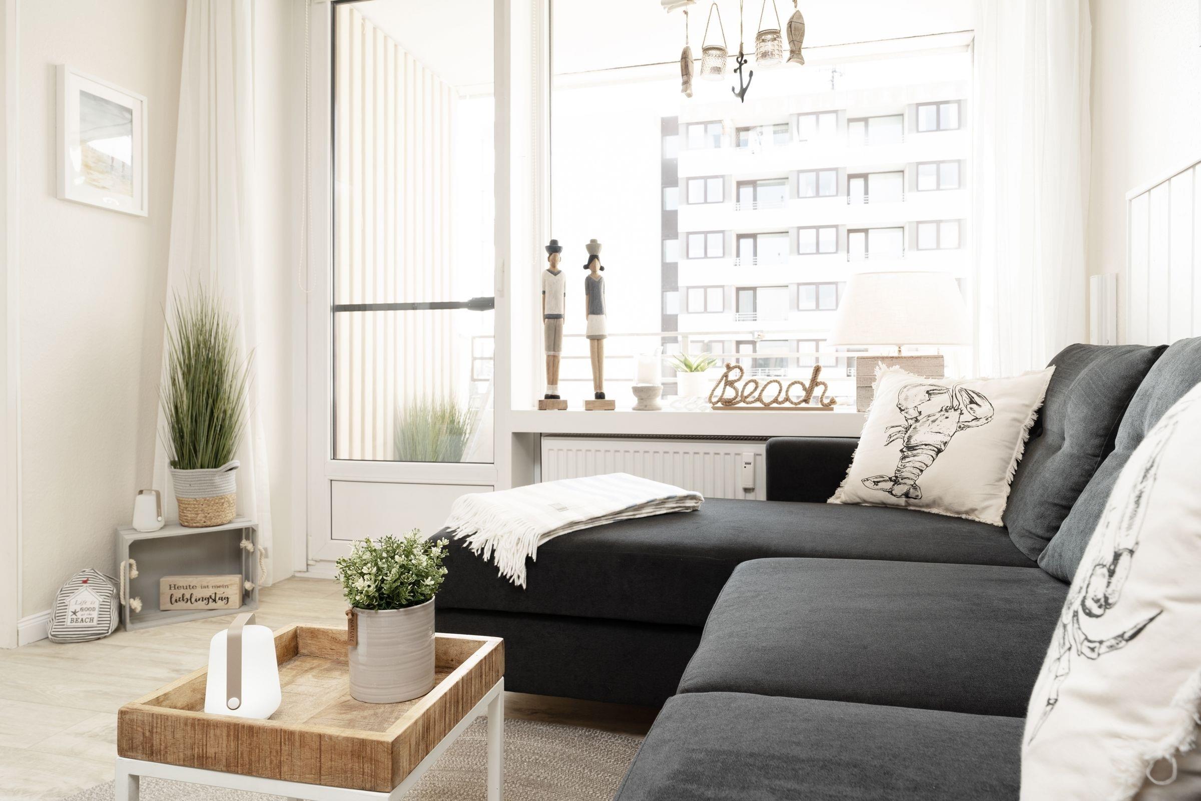 In der Wohnung Heimatgefühl werden Sie sich sofort wie zu Hause fühlen – nur dass Sie ganz nah am Meer wohnen. Machen Sie es sich auf dem kuscheligen Sofa vor dem Smart-TV (Streaming-Dienste zur Selbstanmeldung) gemütlich oder genießen Sie die Sonnenstunden auf dem möblierten Süd-Balkon mit seitlichem Meerblick. Die frische Meeresluft macht sicher hungrig. Die offene Küche ermöglicht eine gute Selbstversorgung mit Extras wie Thermomix TM31, Minibackofen sowie Spülmaschine. Für die Nacht steht Ihnen im Wohnzimmer ein Boxspringbett (160x200 cm) zur Verfügung. Zudem befinden sich im Schlafzimmer zwei Einzelbetten (je 80x200 cm). Aus beiden Zimmern haben Sie übrigens einen seitlichen Meerblick. Das moderne Duschbad bringt Sie entspannt in den neuen Tag.