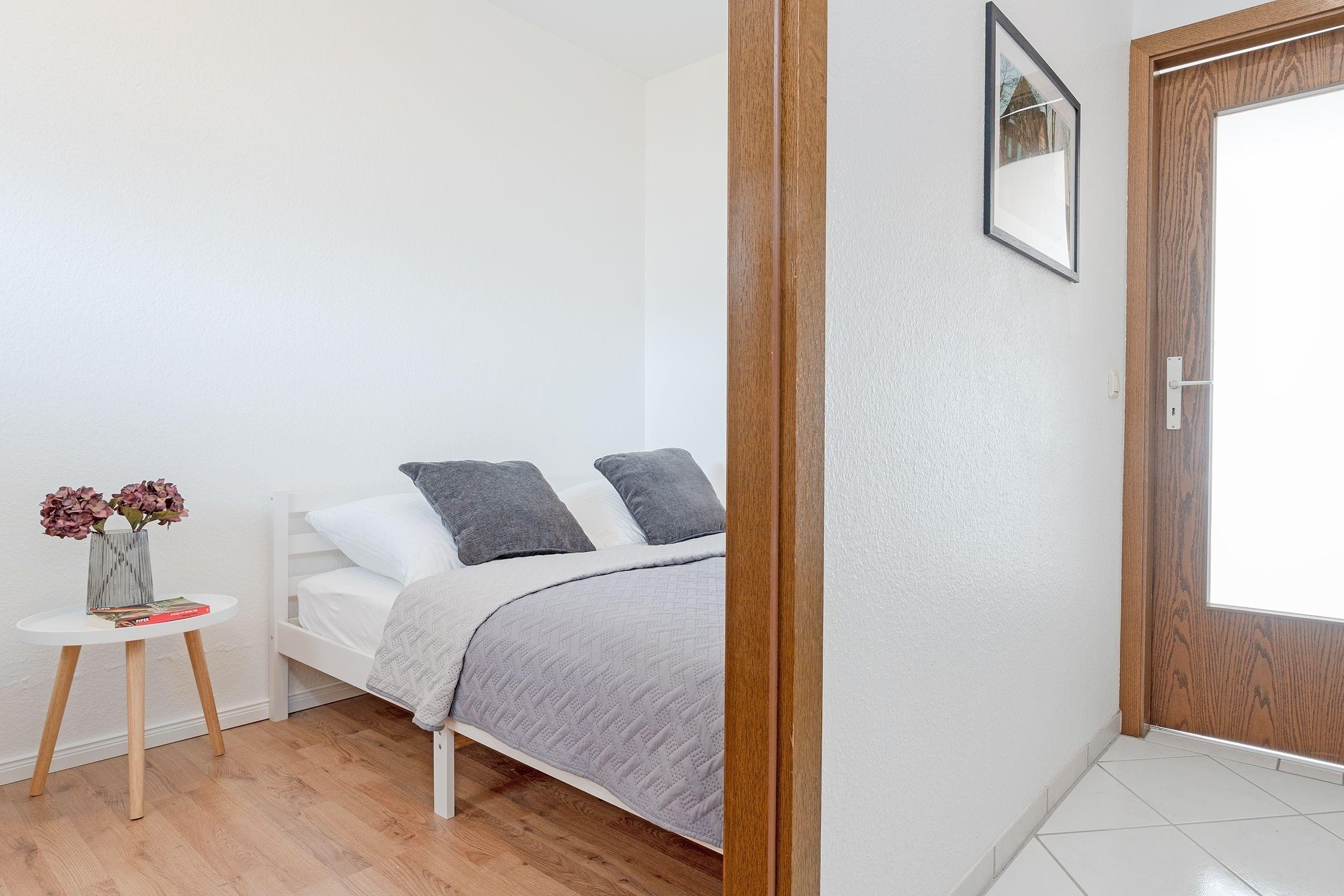 Schlafzimmer: 1 Doppelbett (140 x 190cm), Kleiderschrank, Verdunkelung: Rollo, kein Platz für ein Babybett vorhanden