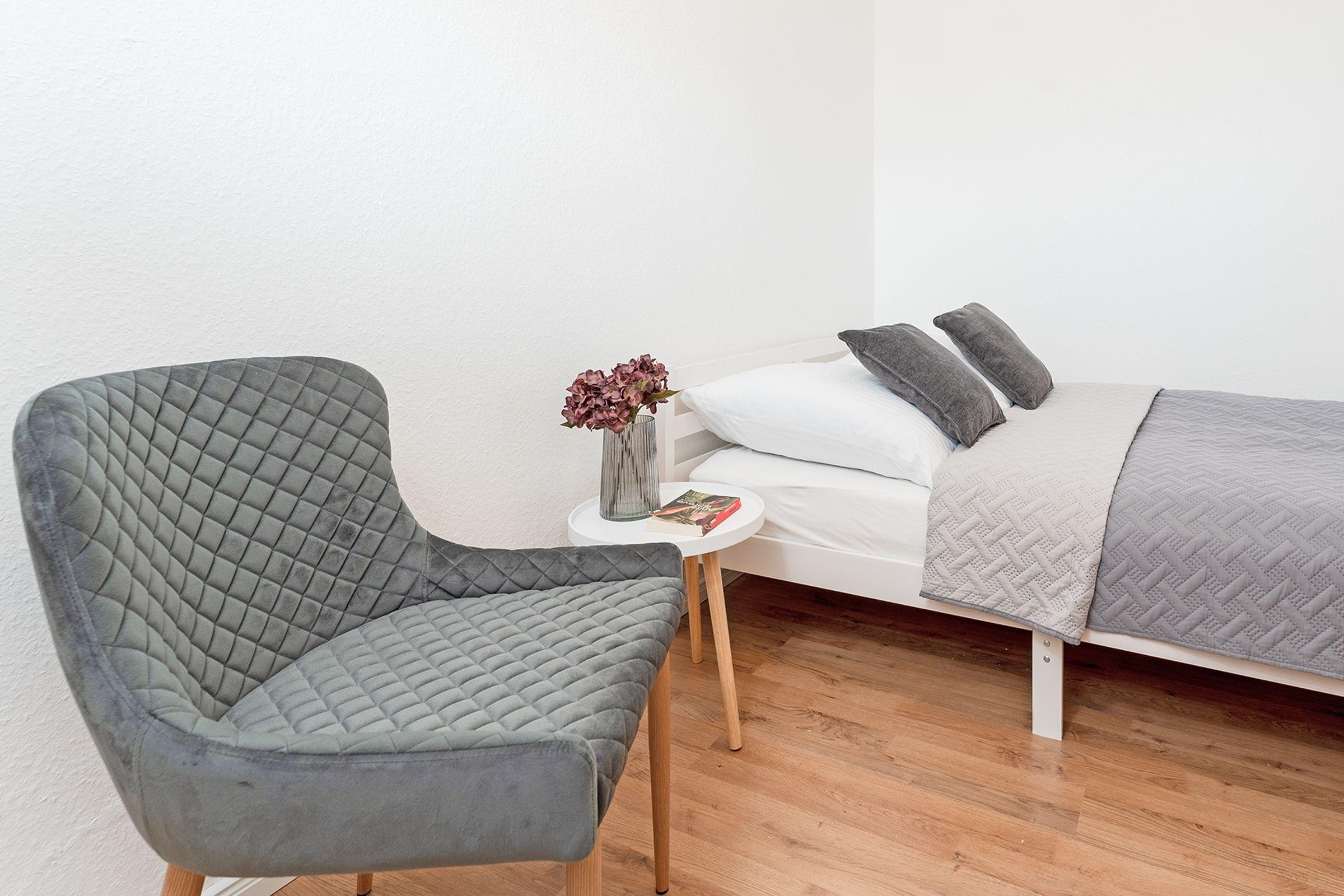 Wohn-/Schlafzimmer: 1 Schlafcouch (120 x 195 cm), TV, Platz für Babybett vorhanden