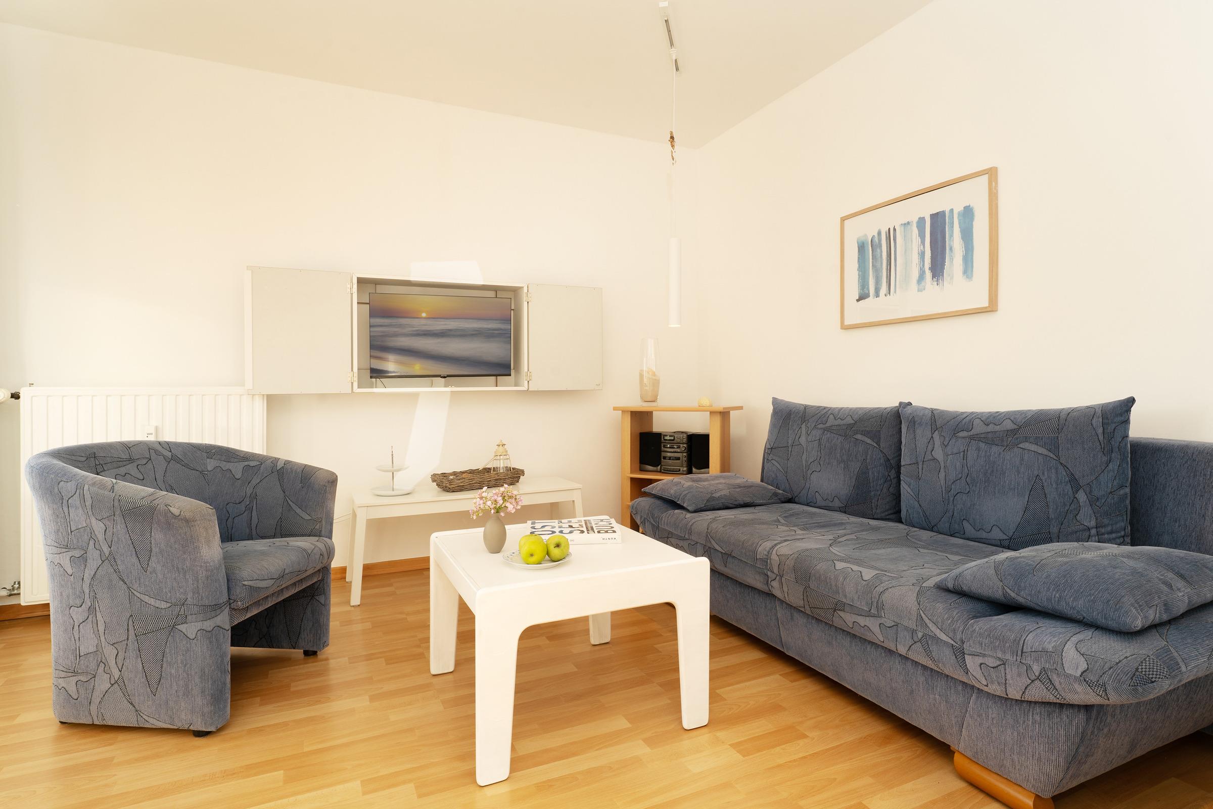 Der Name dieser schönen Wohnung ist Programm: Sie heißt Abendsonne – und genau diese können Sie auf dem großzügigen, möblierten Balkon in Nordwest-Ausrichtung gut geschützt genießen. Dazu gibt es einen herrlichen Weitblick. Auch vom Wohnzimmer aus haben Sie den tollen Blick, nehmen Sie Platz auf dem meerblauen Sofa oder dem Sessel und lassen Sie sich vom TV-Programm oder der Stereoanlage unterhalten. Die funktional ausgestattete Küche ist in den Wohnbereich integriert, ein Tresen fungiert als angenehmer Raumteiler. Den Weitblick können Sie übrigens auch vom Doppelbett (2x 90x200cm) im Schlafzimmer aus genießen, da man über den Balkon hinweg rausschauen kann. Besonders praktisch ist der Insektenschutz am Schlafzimmerfenster - so können Sie bei offenem Fenster im Bett vielleicht das Meeresrauschen hören. Der praktische Flur verfügt über Ganzkörperspiegel und Garderobe. Das innenliegende Duschbad ist hell gefliest und macht Sie munter für den nächsten Tag an der Ostsee. Der Strand ist nur rund 130 Meter entfernt.