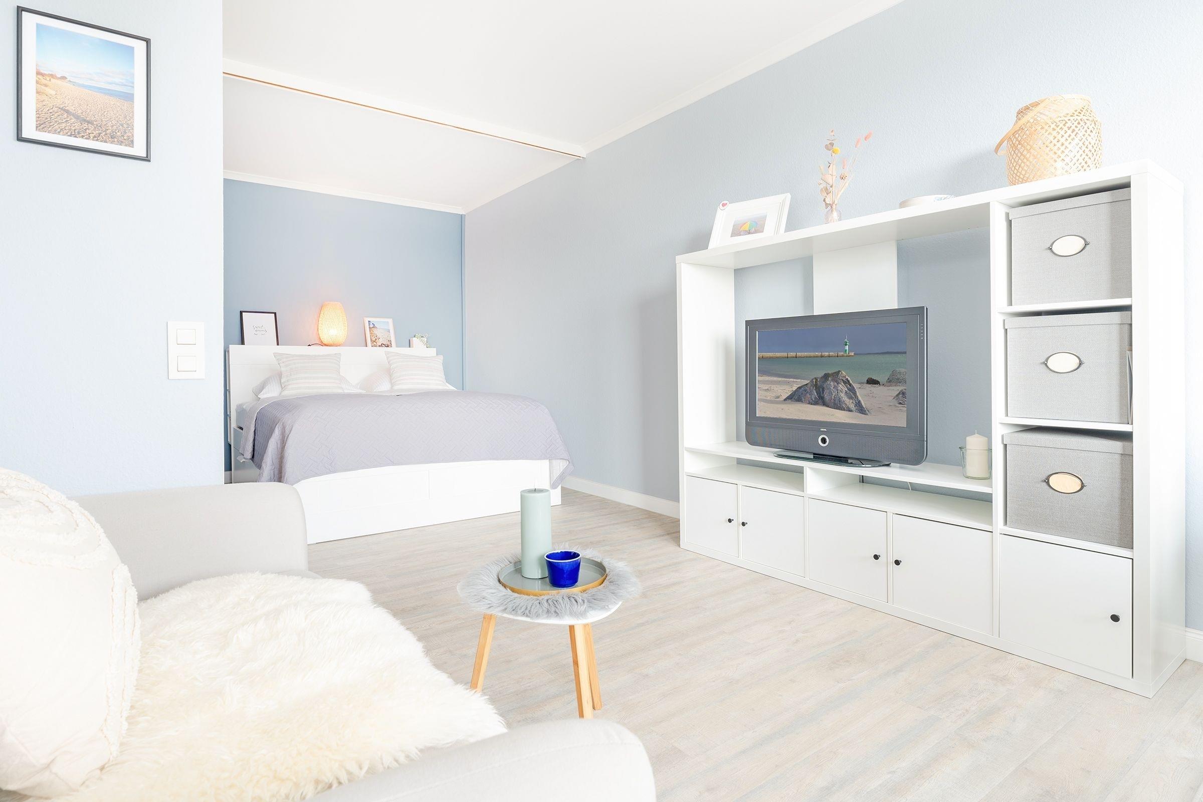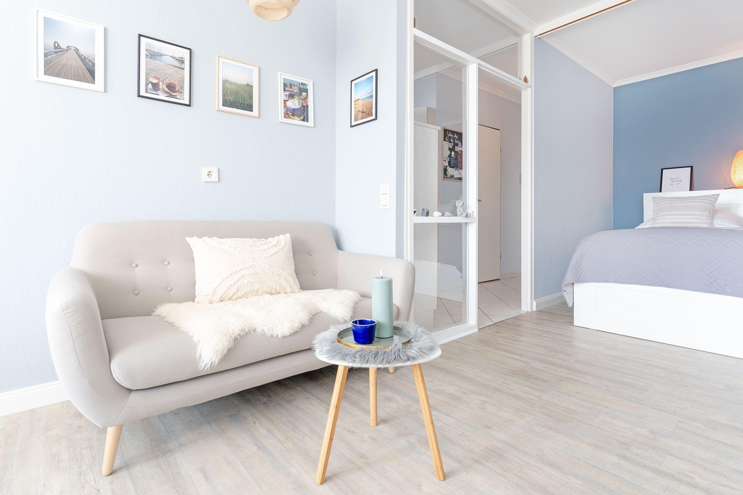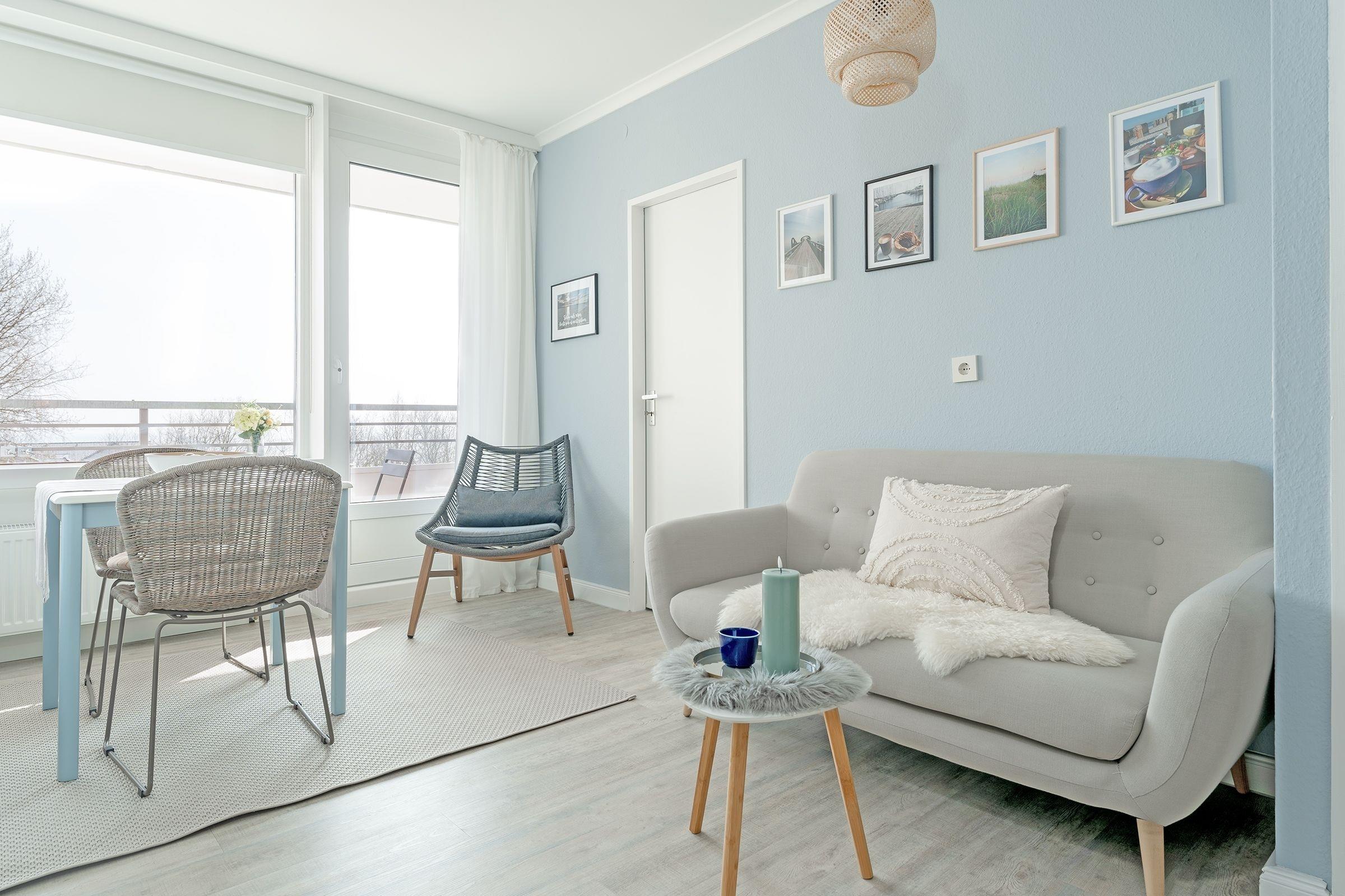 "Das Hygge-Glück" liegt in den Strandappartements am Leuchtturmweg – denn so heißt die charmante Ferienwohnung, die Ihnen eine gemütliche, glückliche Auszeit verspricht. Die Einrichtung wurde liebevoll ausgesucht. Entspannen Sie auf dem kuscheligen Sofa oder auf dem überdachten, möblierten Balkon mit Meerblick. Genießen Sie die gute Seeluft und lauschen Sie den Wellen. Während Ihres Aufenthalts können Sie sich dank der funktional ausgestatteten Kochnische mit Nespresso-Maschine prima selbst versorgen. Süß träumen werden Sie im Doppelbett (160x200 cm) im hinteren Bereich des Wohnzimmers oder auf dem Schlafsofa (140x200 cm) im separaten Schlafzimmer. Das innenliegende Duschbad bringt Sie gut in den neuen Tag. Auf geht es an den Strand, denn die Ostsee ist nur rund 100 Meter entfernt.
