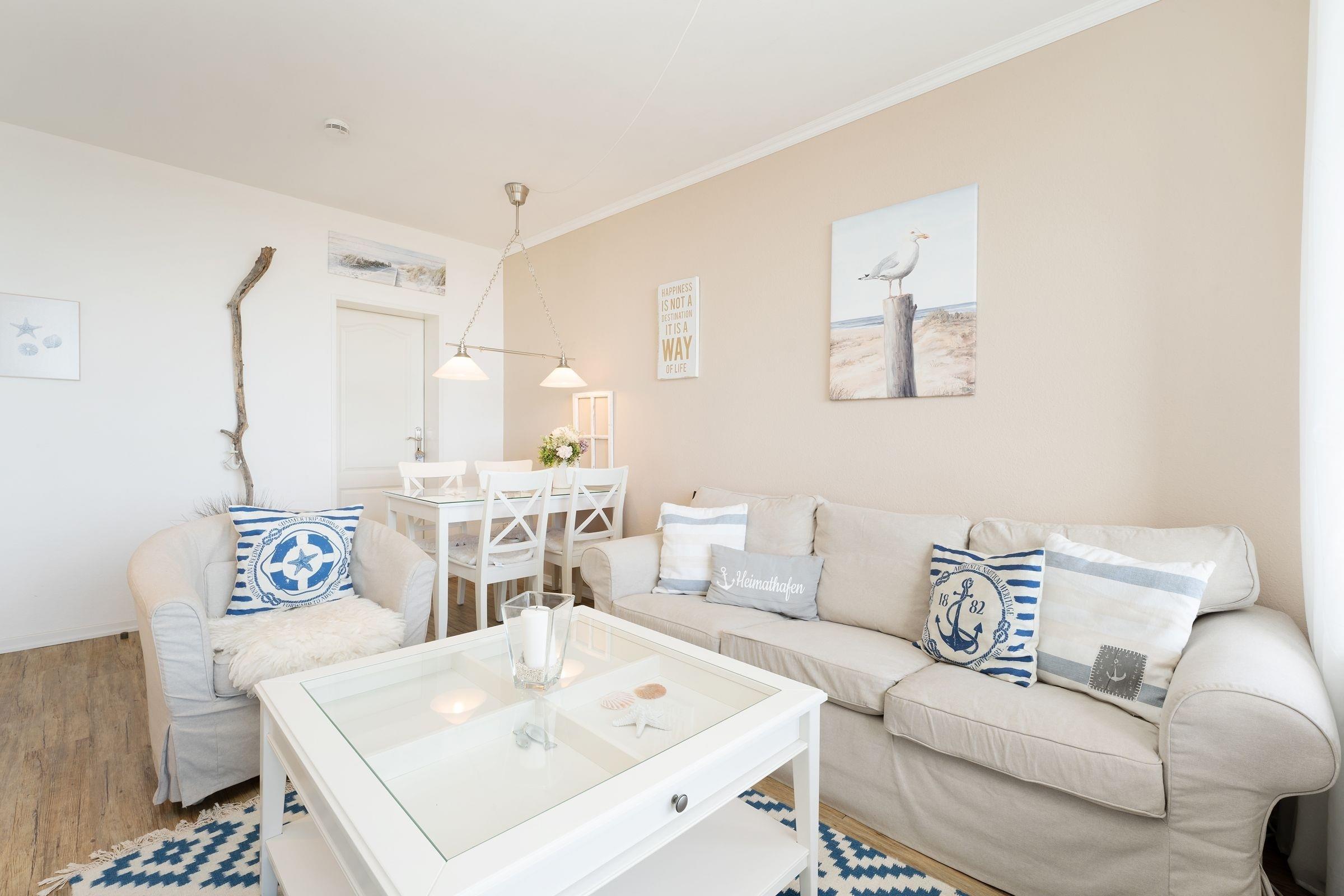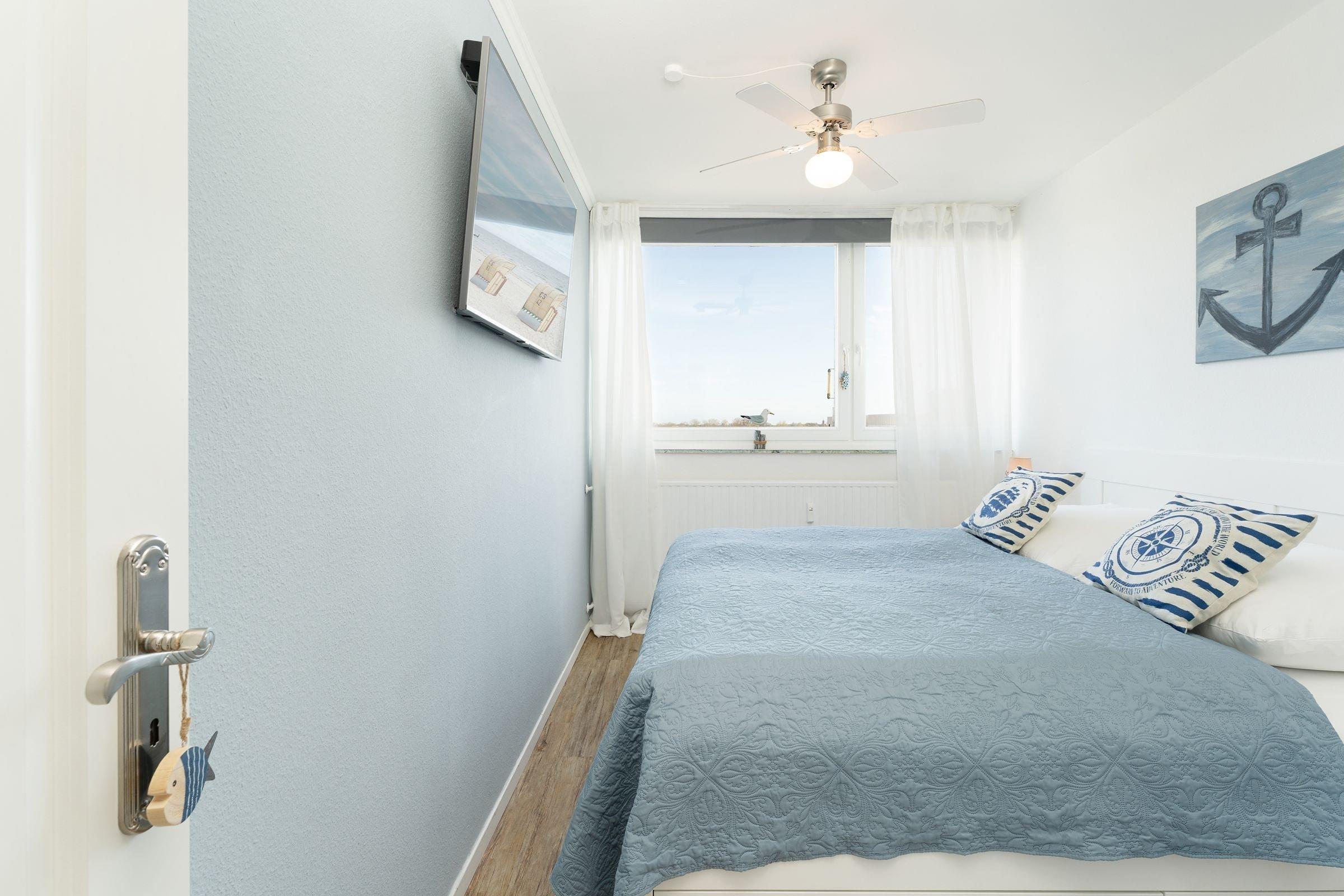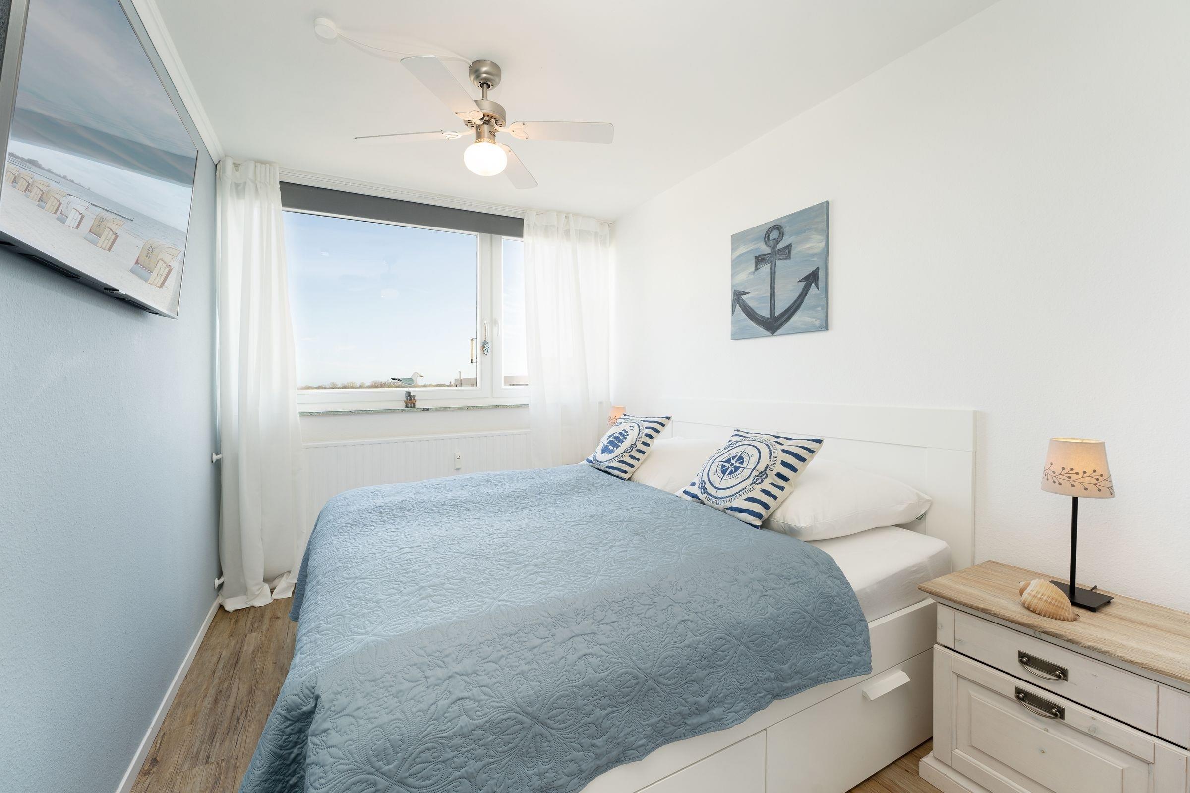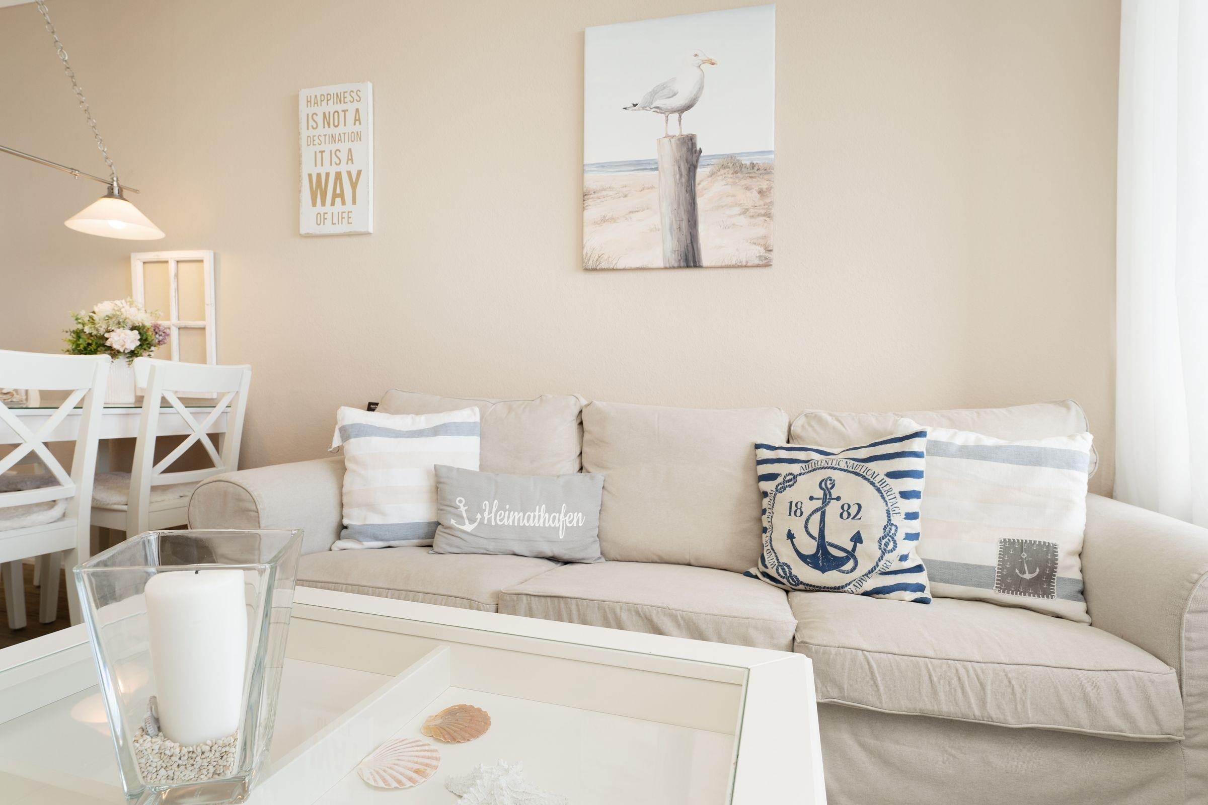 Machen Sie fest und gehen Sie in diesem traumhaften Objekt vor Anker – der passende Name der Wohnung Ankerplatz 84 lädt dazu ein. Die maritime Einrichtung wurde liebevoll ausgesucht und verspricht eine wundervolle Auszeit. Entspannen Sie auf der kuscheligen Couch im Wohnbereich, die passende Unterhaltung liefert das TV-Gerät mit Streaming-Account (inkl. Netflix/Amazon/Disney). Oder schauen Sie auf dem möblierten Balkon in die Ferne Richtung Leuchtturm. Wie wäre es mit einem leckeren Sandwich? Die offene Küche bietet allerlei kleine Extras für die Selbstversorgung. Beide Schlafzimmer sind jeweils mit einem zusätzlichen TV-Gerät und einem Kleiderschrank ausgestattet – in dem einen steht ein Doppelbett (180x200 cm) und in dem anderen ein Etagenbett (je 90x200 cm). Das gepflegte Duschbad ist innenliegend.