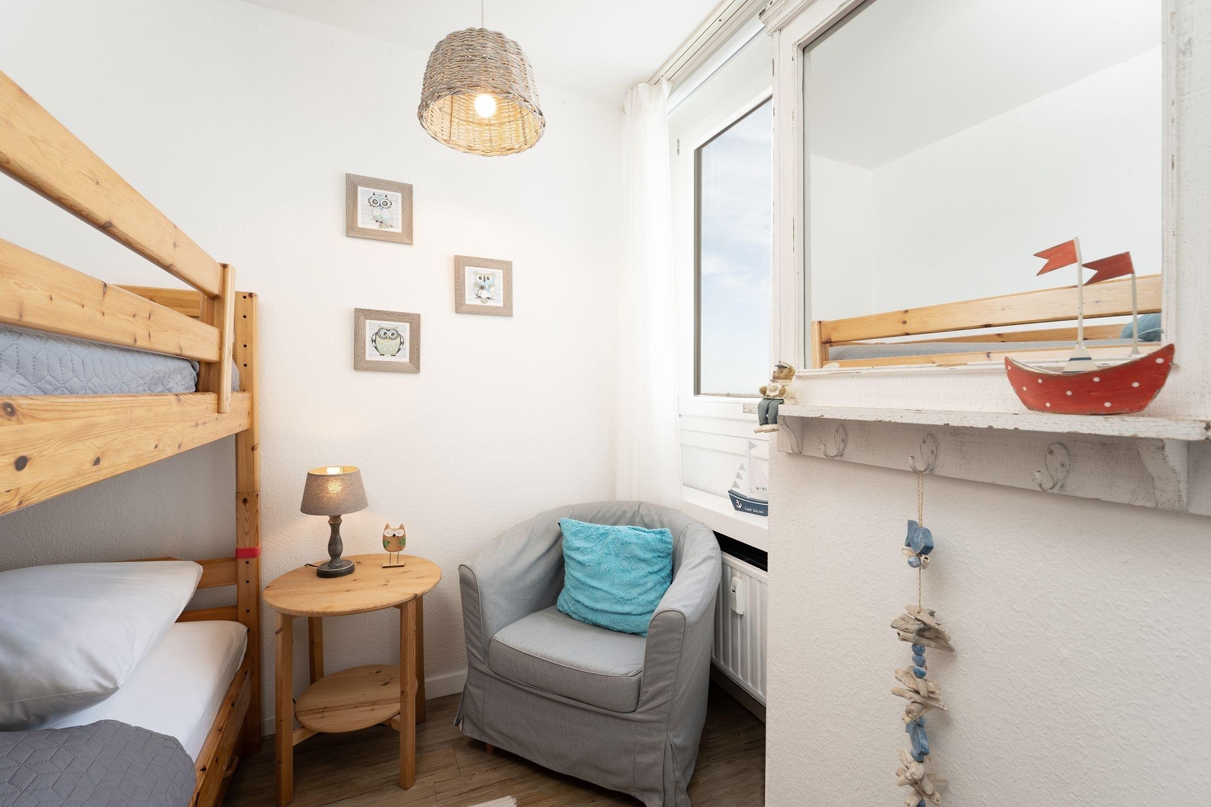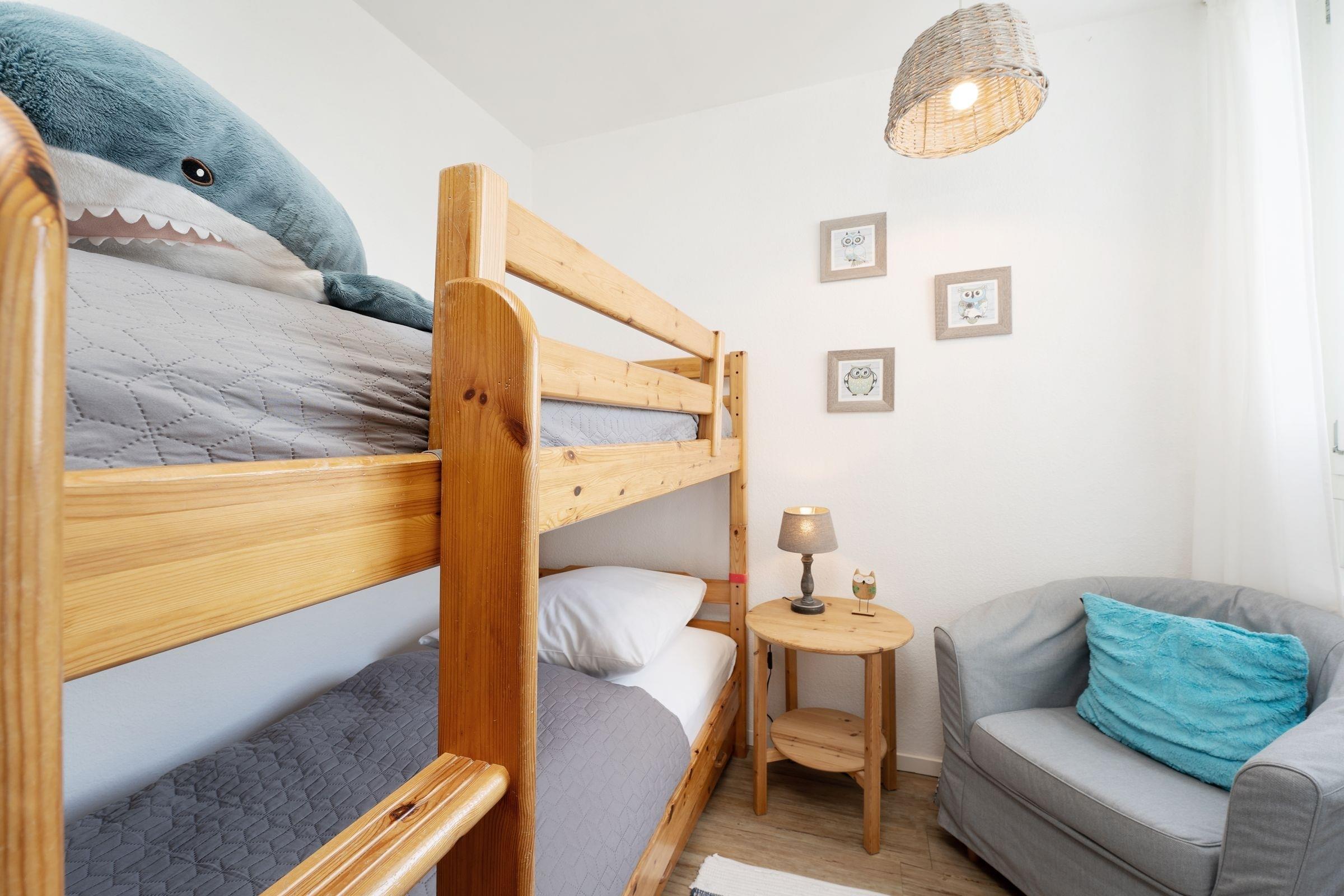 Schlafzimmer 2: 1 Etagenbett (je 90x200 cm), Kleiderschrank, TV, Verdunkelung: Rollo, Platz für ein Babybett vorhanden