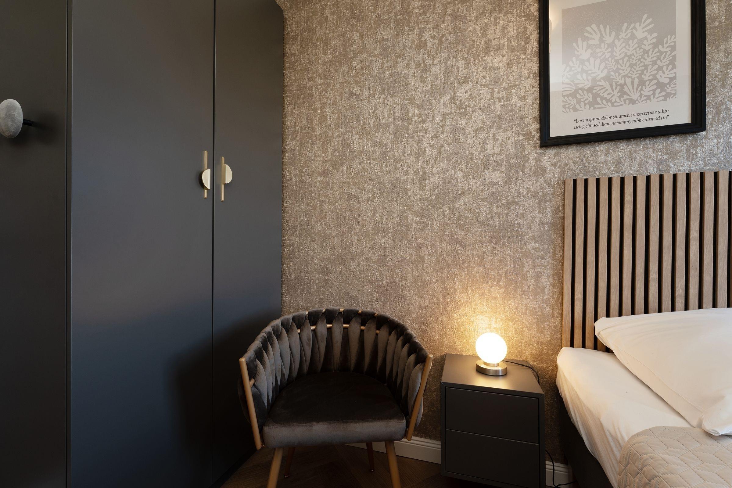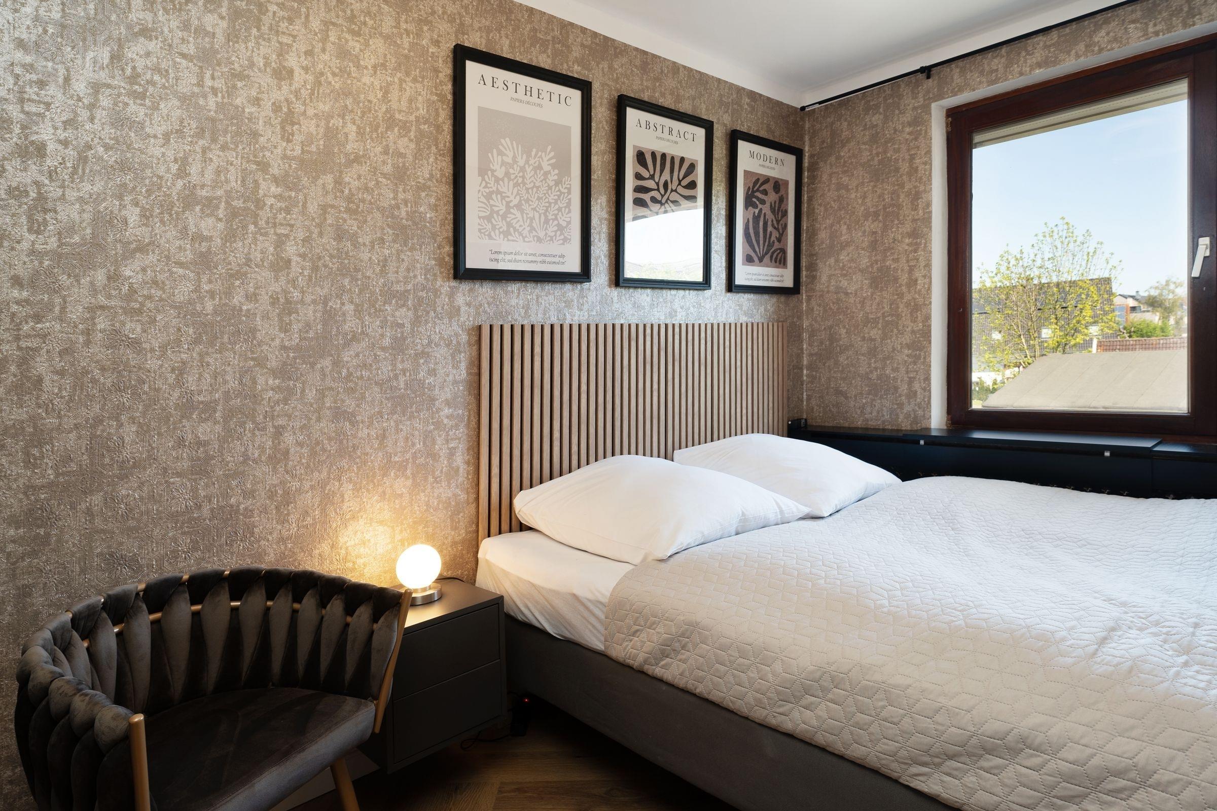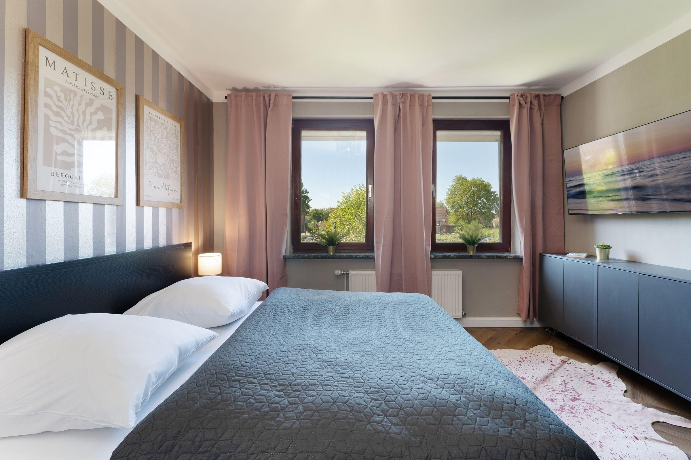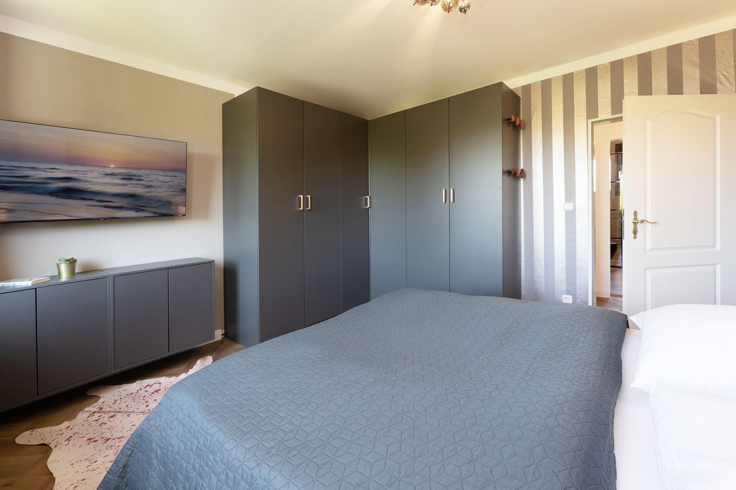 Schlafzimmer 1: Doppelbett (ca. 180x200 cm), Kleiderschrank, Verdunkelung: Rollläden, Platz für Kinderreisebett vorhanden