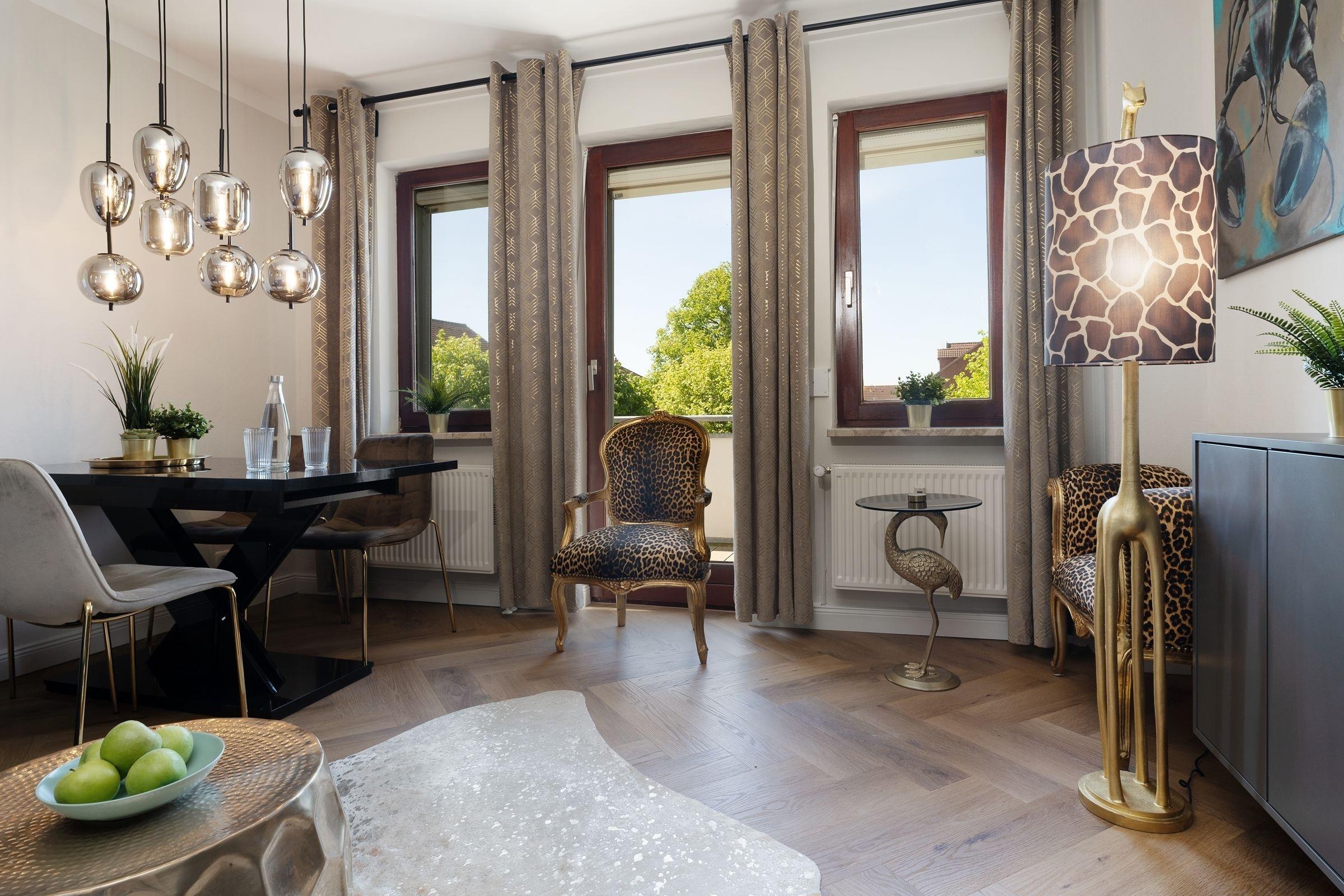 Wunderbar anders präsentiert sich diese individuelle Ferienwohnung Ihren Gästen. Im Wohn- und Essbereich findet jeder ein Plätzchen zum Entspannen und ein gemeinsames Dinner am gemütlichen Esstisch rundet einen aufregenden Urlaubstag ab. Reisen Sie mit 5 Personen, lässt sich das Sofa in einen komfortablen Schlafplatz verwandeln (ca. 125x200 cm). Vom Wohnbereich aus gelangen Sie auch auf den möblierten Balkon in Südlage, auf dem Sie das gute Wetter auskosten können. Für angenehme Nächte stehen Ihnen 2 separate Schlafzimmer mit je einem Doppelbett (ca. 180x200cm) und einem Kleiderschrank zur Verfügung. Lassen Sie sich vom Flair des Design-Duschbades bezaubern und starten Sie mit einer erfrischenden Dusche in den Tag.