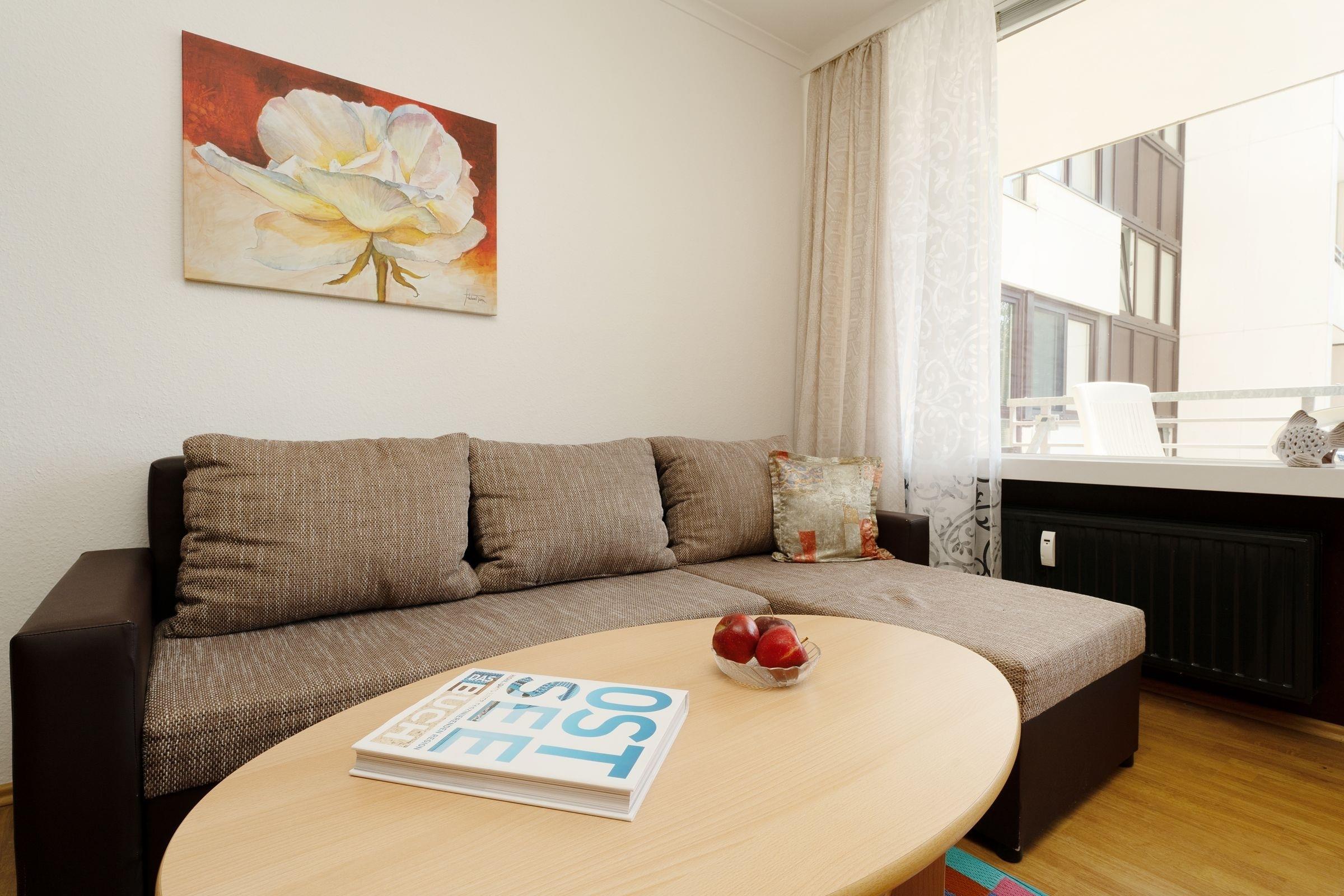 In bester Lage von Kellenhusen: strandnahe 2-Zimmer-Ferienwohnung im 1. Stock mit Balkon, Fahrstuhl und einer Wohnfläche von ca. 43 m² für bis zu 4 Personen.