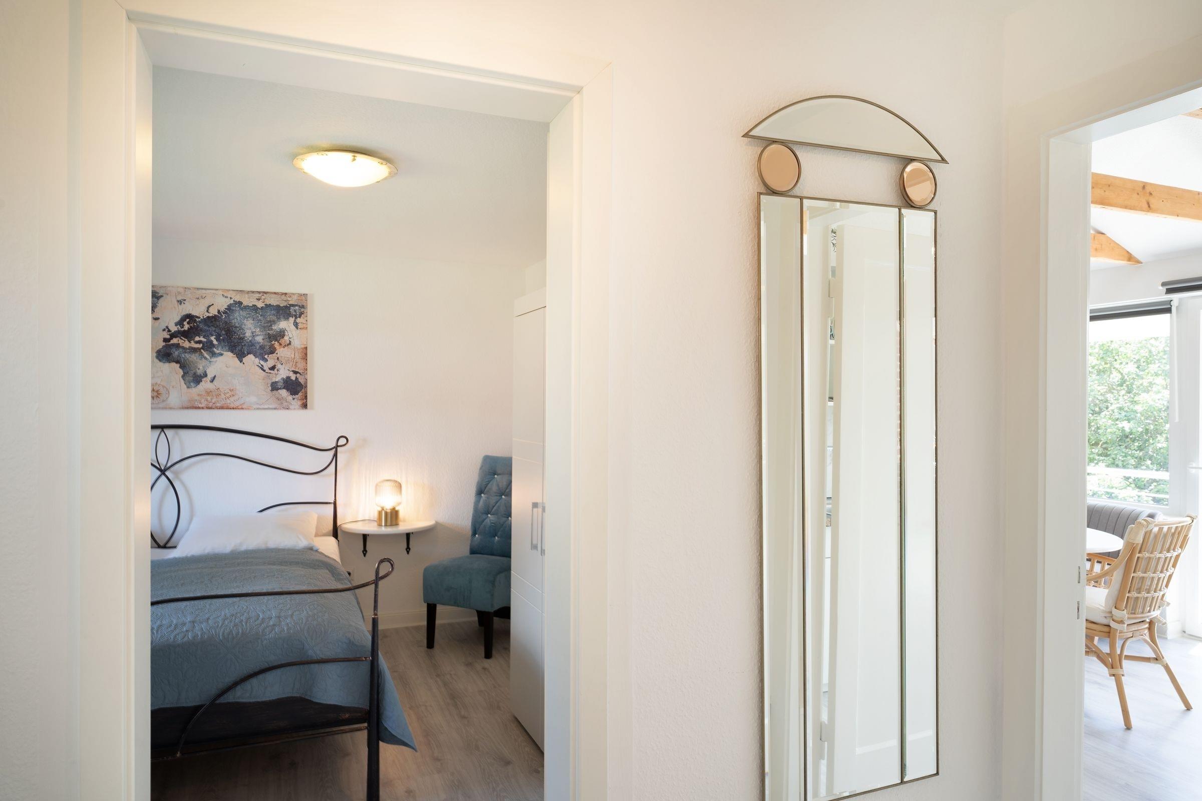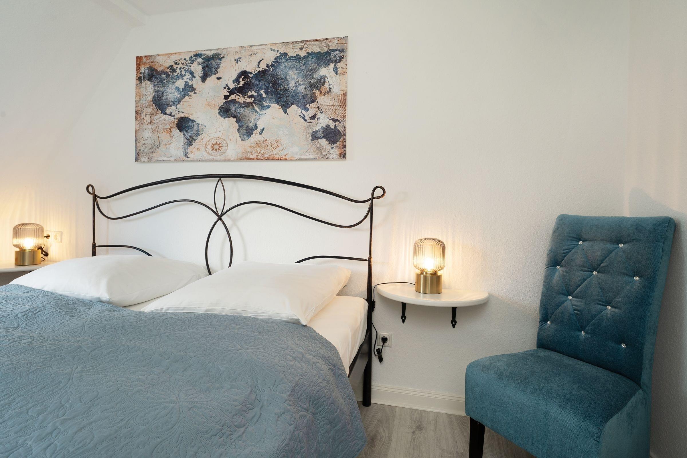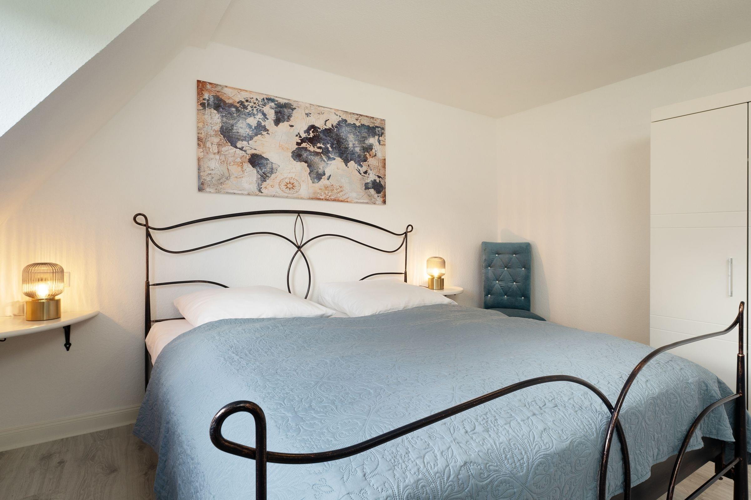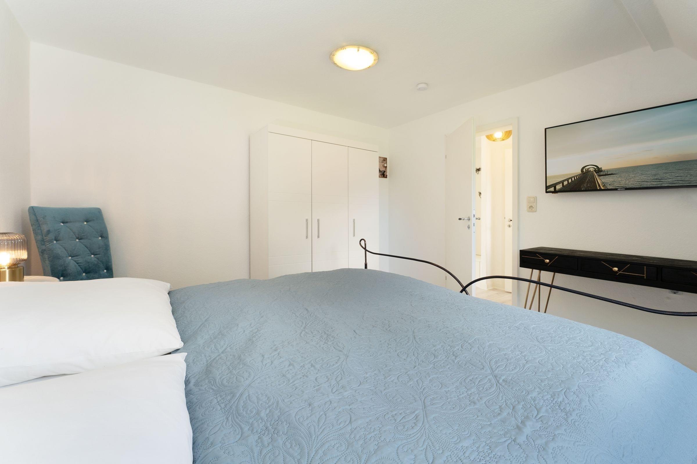 Schlafzimmer 1 (1.OG): 1 Doppelbett (2x 90x200 cm), TV, Kleiderschrank, Verdunkelung: Vorhänge, Platz für Babybett vorhanden