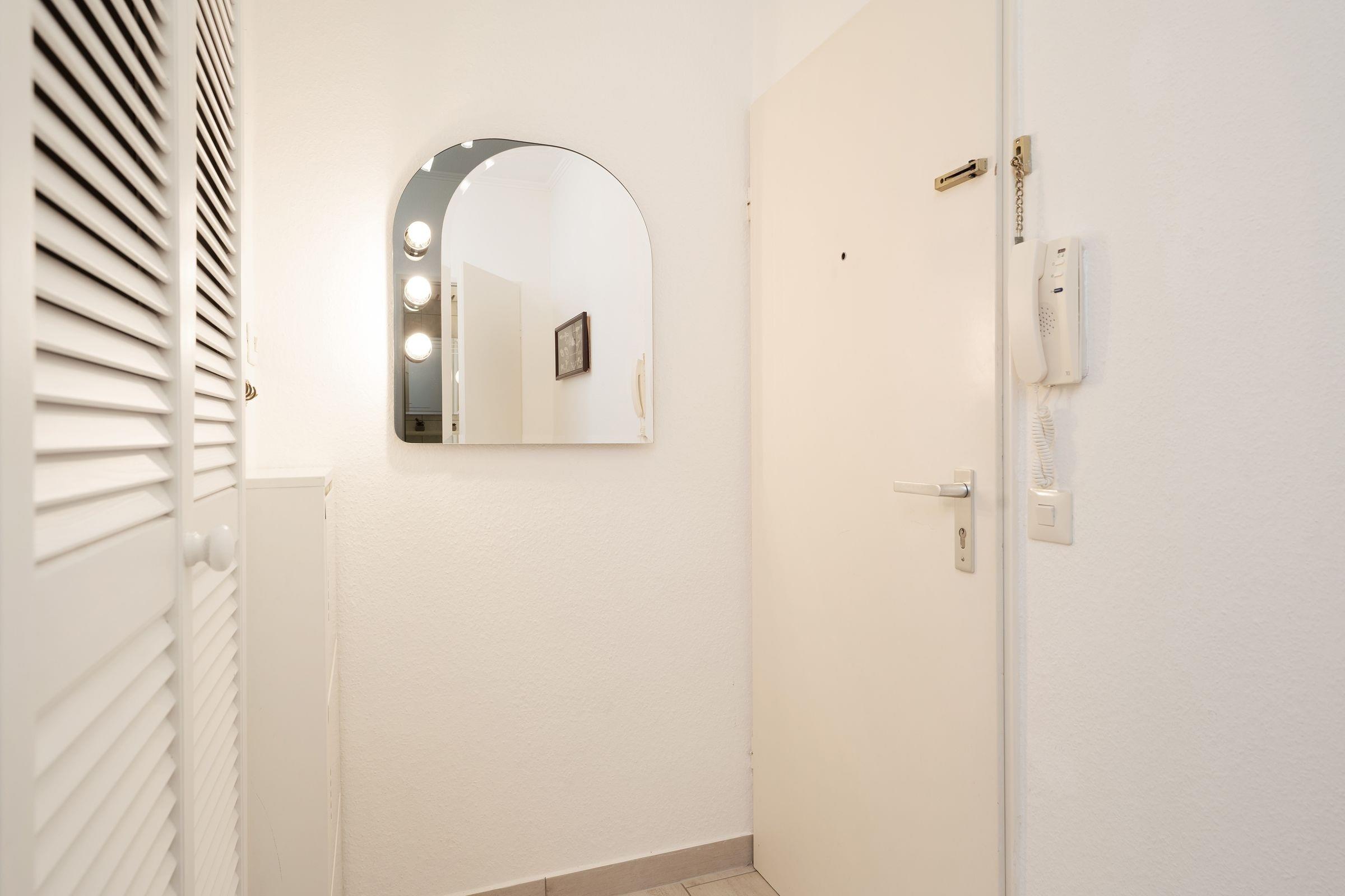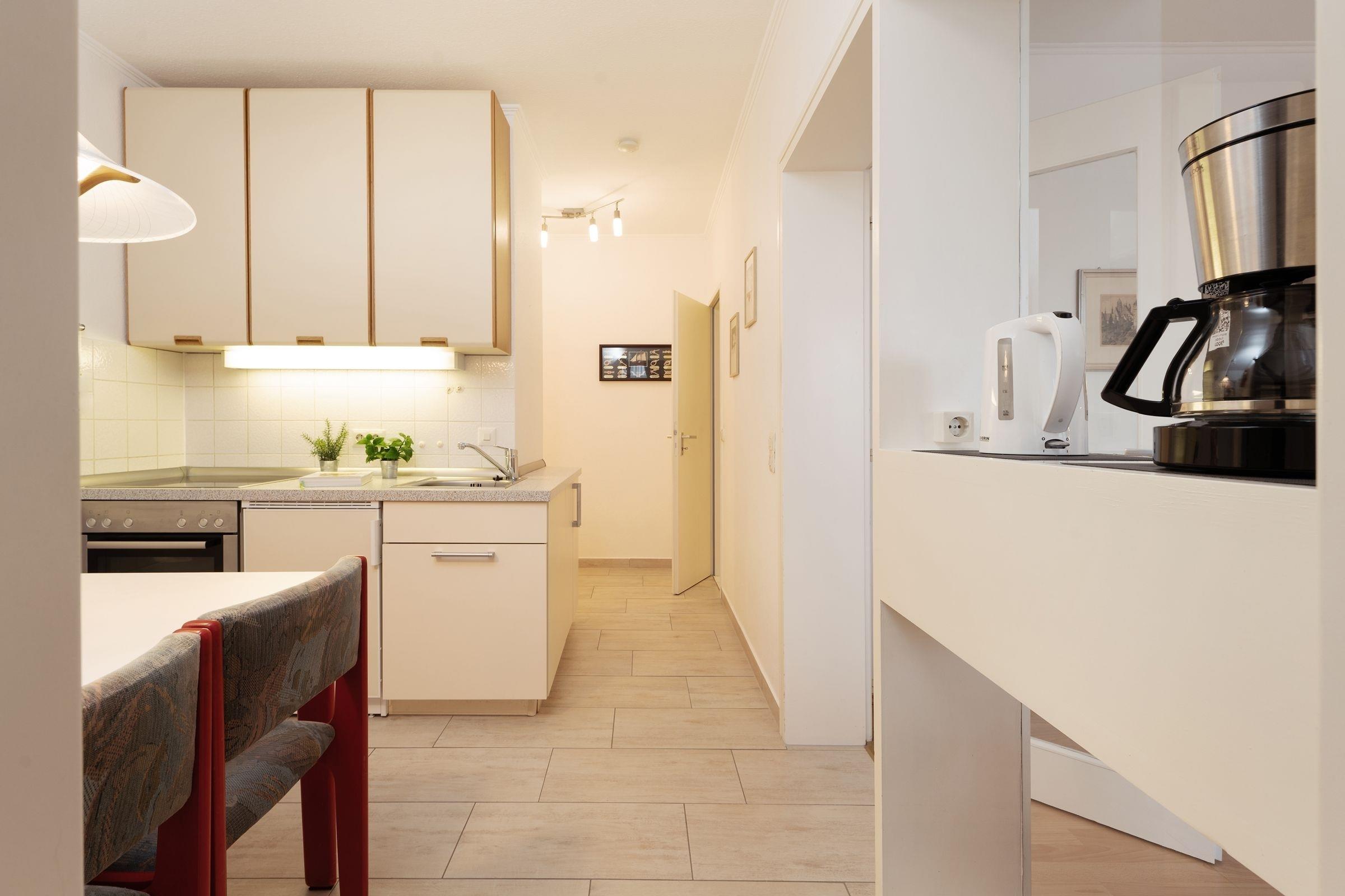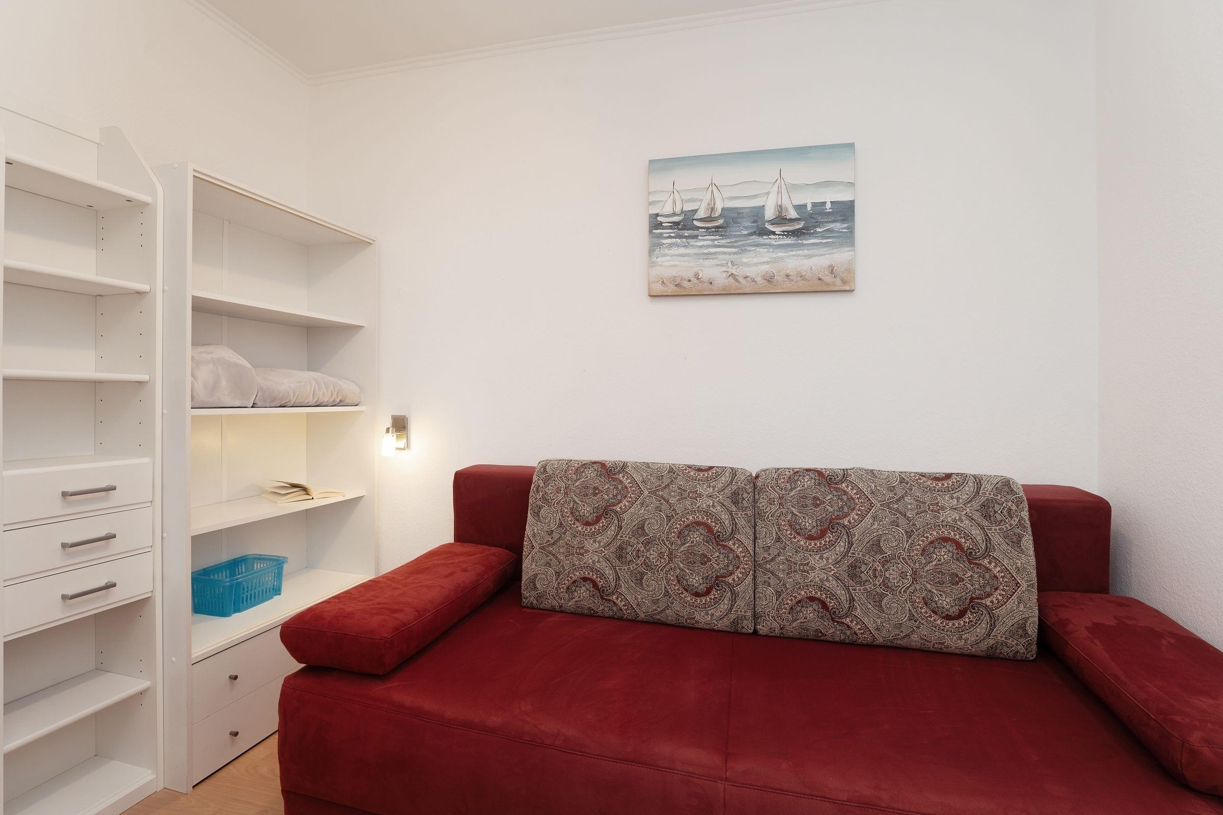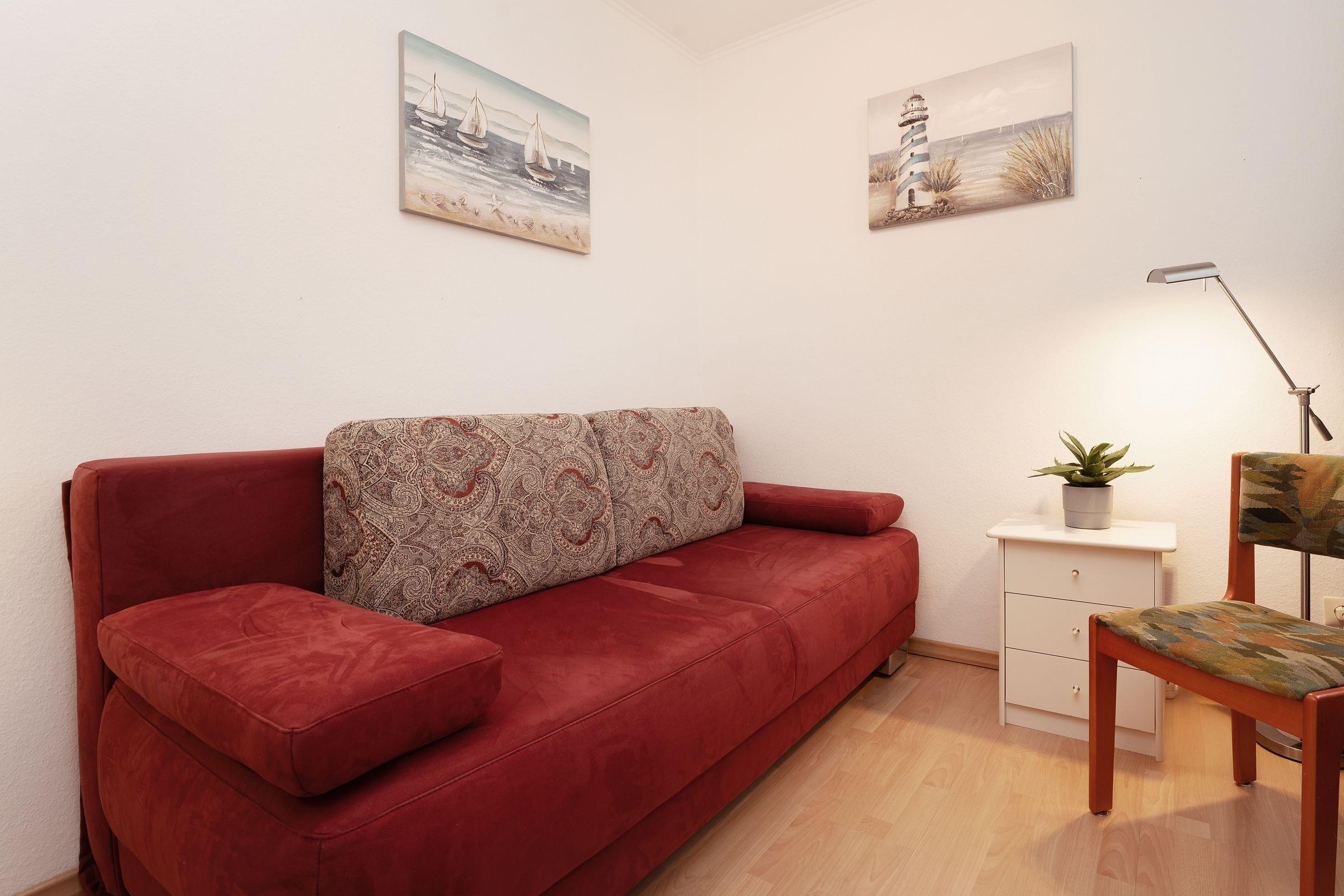 Die Ferienwohnung befindet sich im 3. Stock und mit nur 130 Meter Entfernung zum Strand bietet sie alles für einen entspannten Ostseeurlaub. Der Wohnbereich ist gemütlich eingerichtet und verfügt über TV und Radio. Vom Wohnzimmer aus gelangen Sie auf den nordöstlich ausgerichteten Balkon, der mit Gartenmöbeln ausgestattet ist und sich ideal für ein Frühstück in der frischen Meeresbrise eignet. Die offene Küche bietet sämtliche Annehmlichkeiten, darunter einen Ceranherd, Backofen, Mikrowelle und Kaffeemaschine. Der angrenzende Essbereich lädt zu gemeinsamen Mahlzeiten ein. Die Wohnung verfügt über zwei Schlafzimmer: das Hauptschlafzimmer ist mit einem Doppelbett (2x 90x200 cm) und ein zweites Schlafzimmer mit einer Schlafcouch (90x200 cm) ausgestattet, jeweils mit genügend Stauraum für Ihre Urlaubsgarderobe. Das hell geflieste Duschbad ist innenliegend und bringt Sie frisch in den neuen Tag.