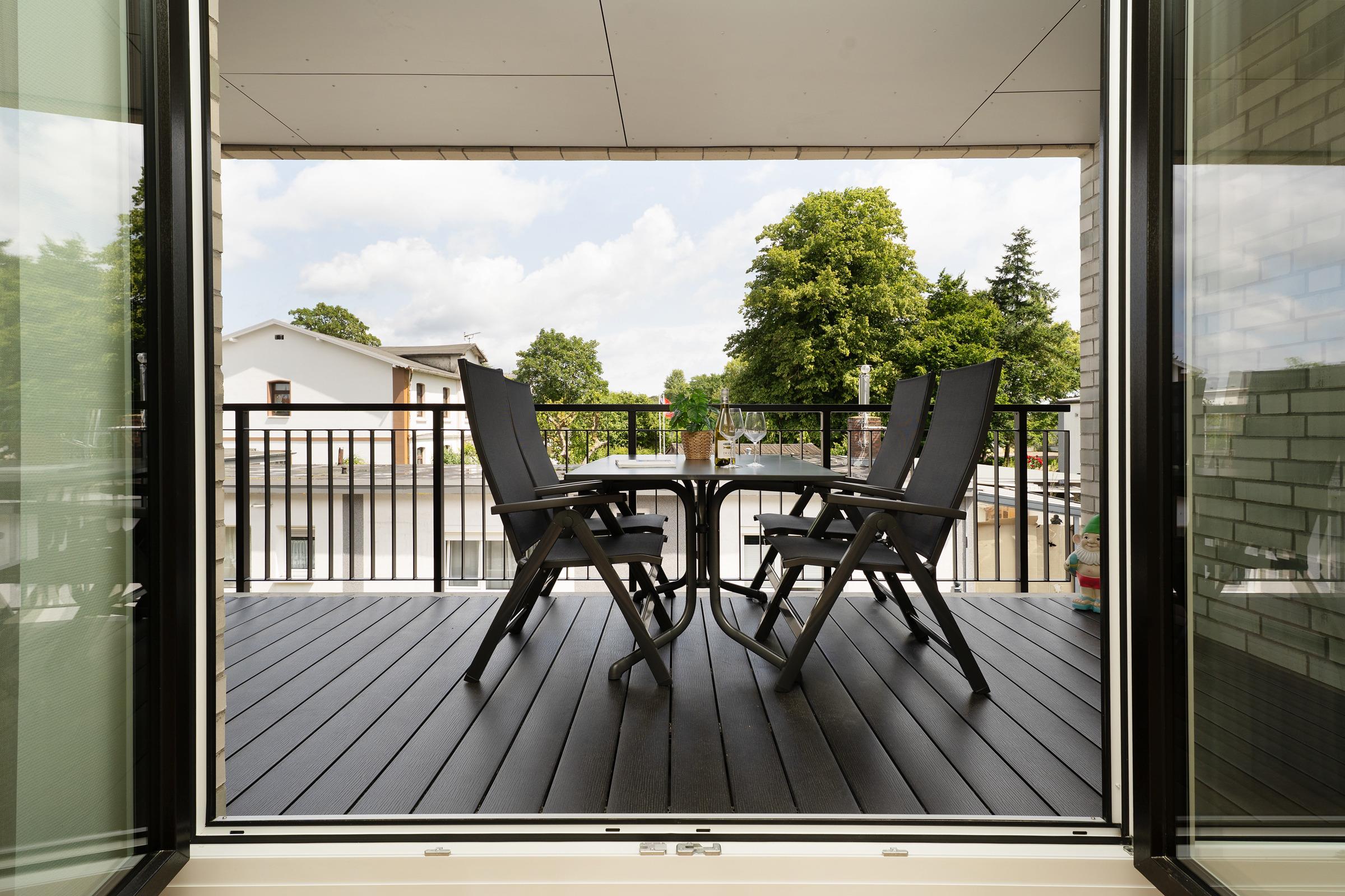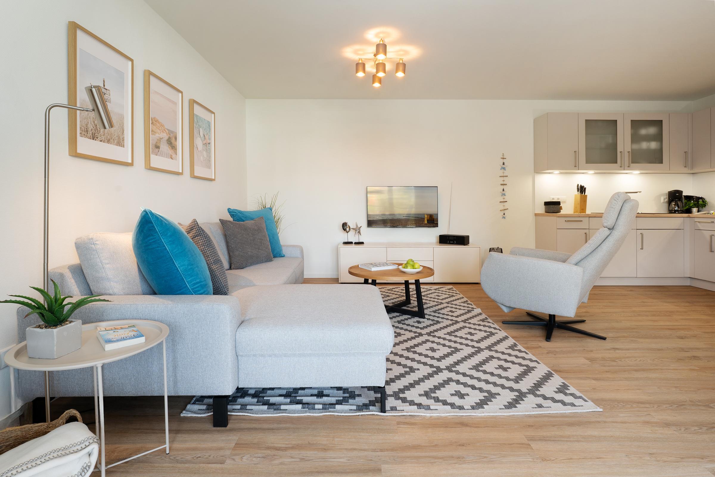 Der lichtdurchflutete Wohnbereich ist mit einer gemütlichen Sofaecke, TV, Hifi-Anlage und großer Fensterfront ausgestattet. Von hier aus betreten Sie den überdachten Balkon mit Gartenmöbeln – ideal für sonnige Stunden oder entspannte Abende.