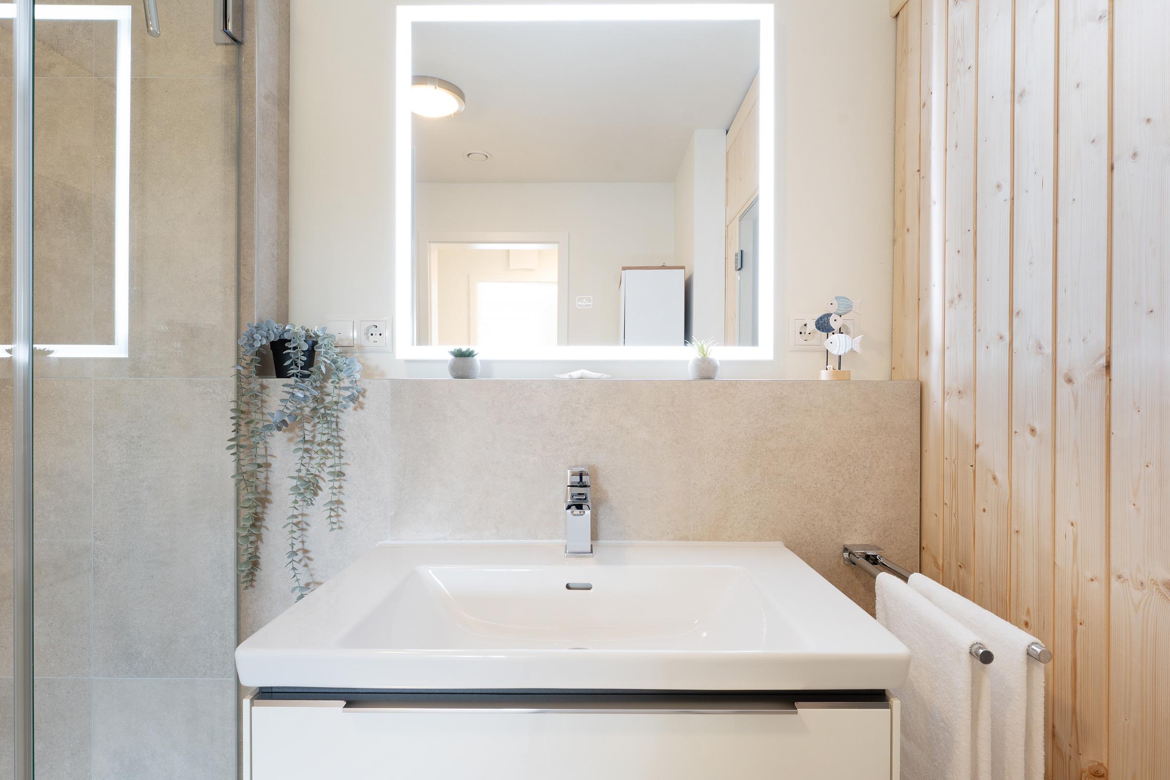 Zwei separate Schlafzimmer - jeweils mit einem Doppelboxspringbett ausgestattet - sorgen für erholsame Nächte. Die weiteren Gäste finden auf einem komfortablen Schlafsofa im Wohnzimmer Platz. Ein Kinderhochstuhl ist ebenfalls vorhanden. Das moderne Badezimmer verfügt über eine bodengleiche Dusche, Waschbecken, WC und Fußbodenheizung. Ein Haartrockner sowie eine Waschmaschine und ein Trockner stehen ebenfalls zur Verfügung.