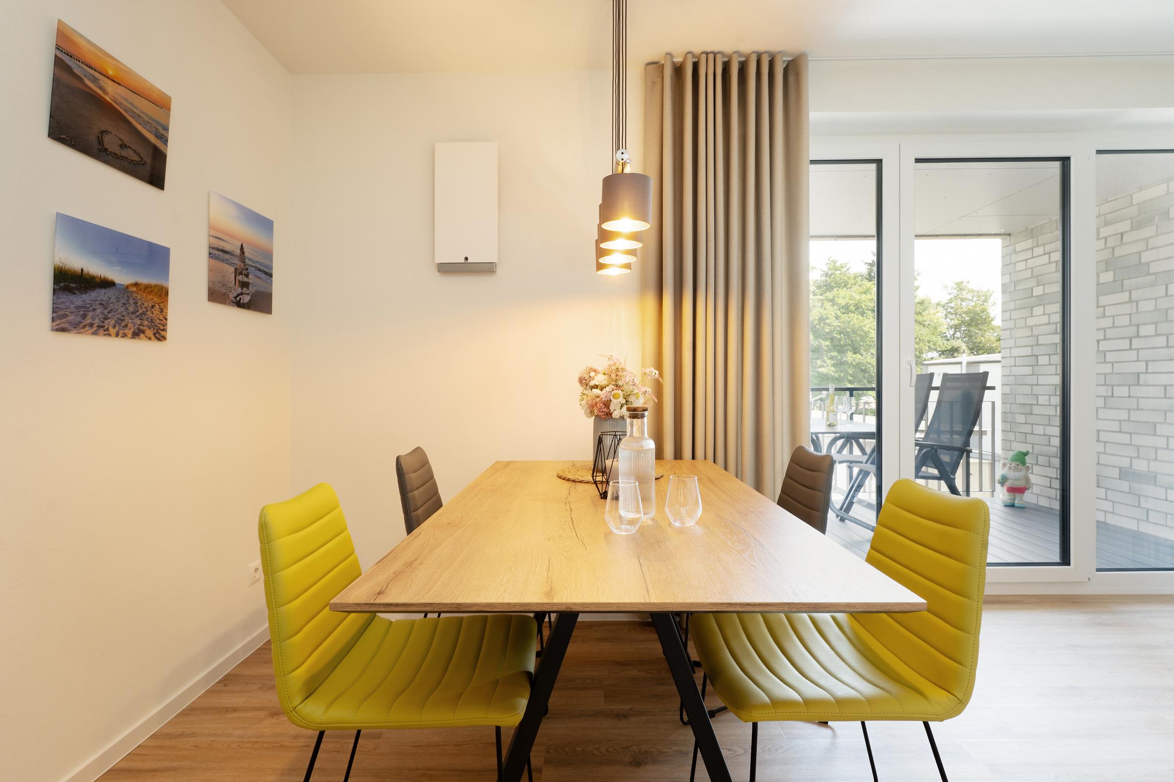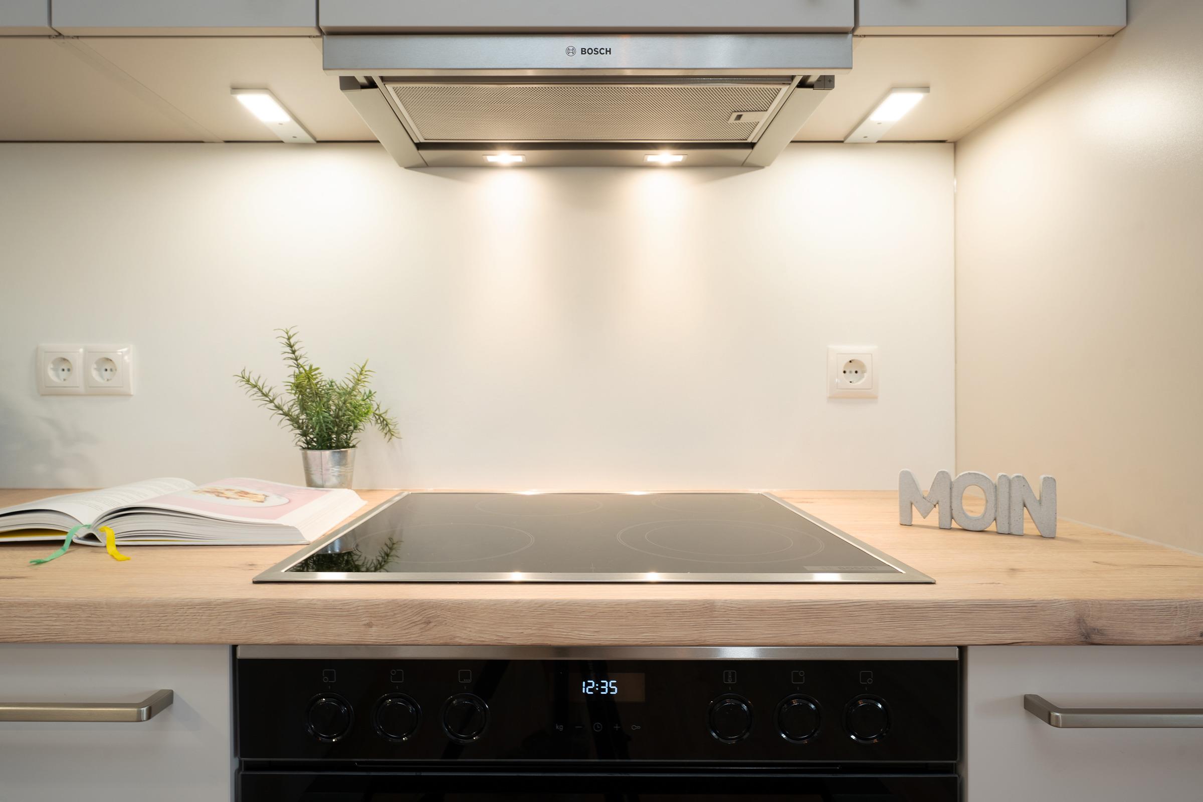 Die offene Küche ist umfassend ausgestattet mit Cerankochfeld, Backofen, Kühlschrank mit Gefrierfach, Spülmaschine, Kaffeemaschine, Wasserkocher und Toaster. Der angrenzende Essbereich bietet ausreichend Platz für alle Gäste.