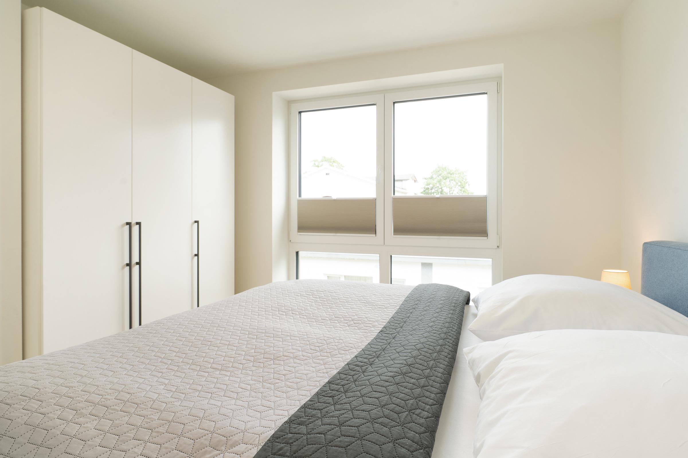 Schlafzimmer 2: 1 Doppelboxspringbett (2x 90x200 cm), Kleiderschrank, Verdunkelung: Plissees, Platz für ein Babybett vorhanden