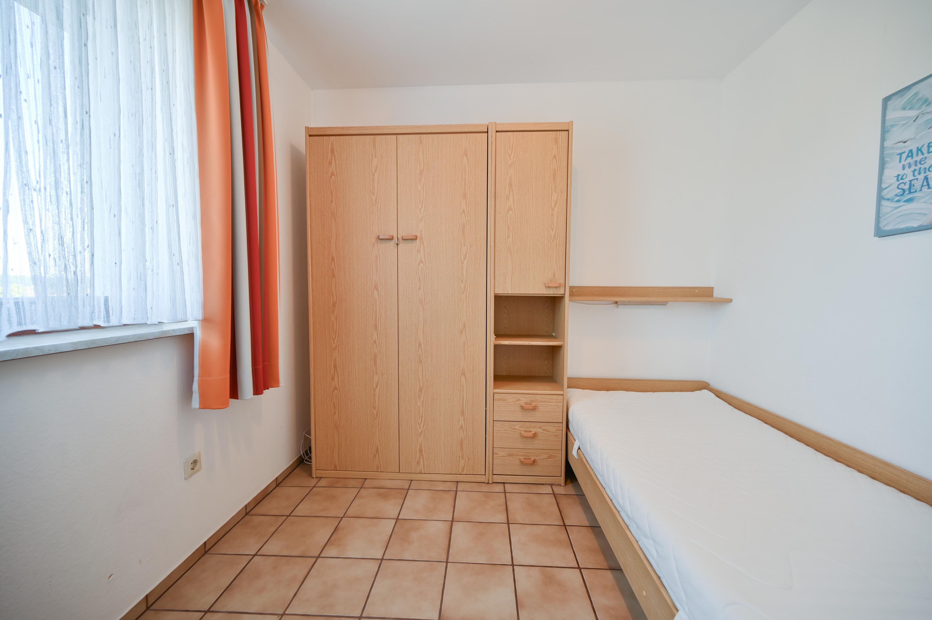 Das separate Schlafzimmer verfügt über ein Einzelbett (90cm x 200cm) und ein ausklappbares Schrankbett (90cm x 200cm).