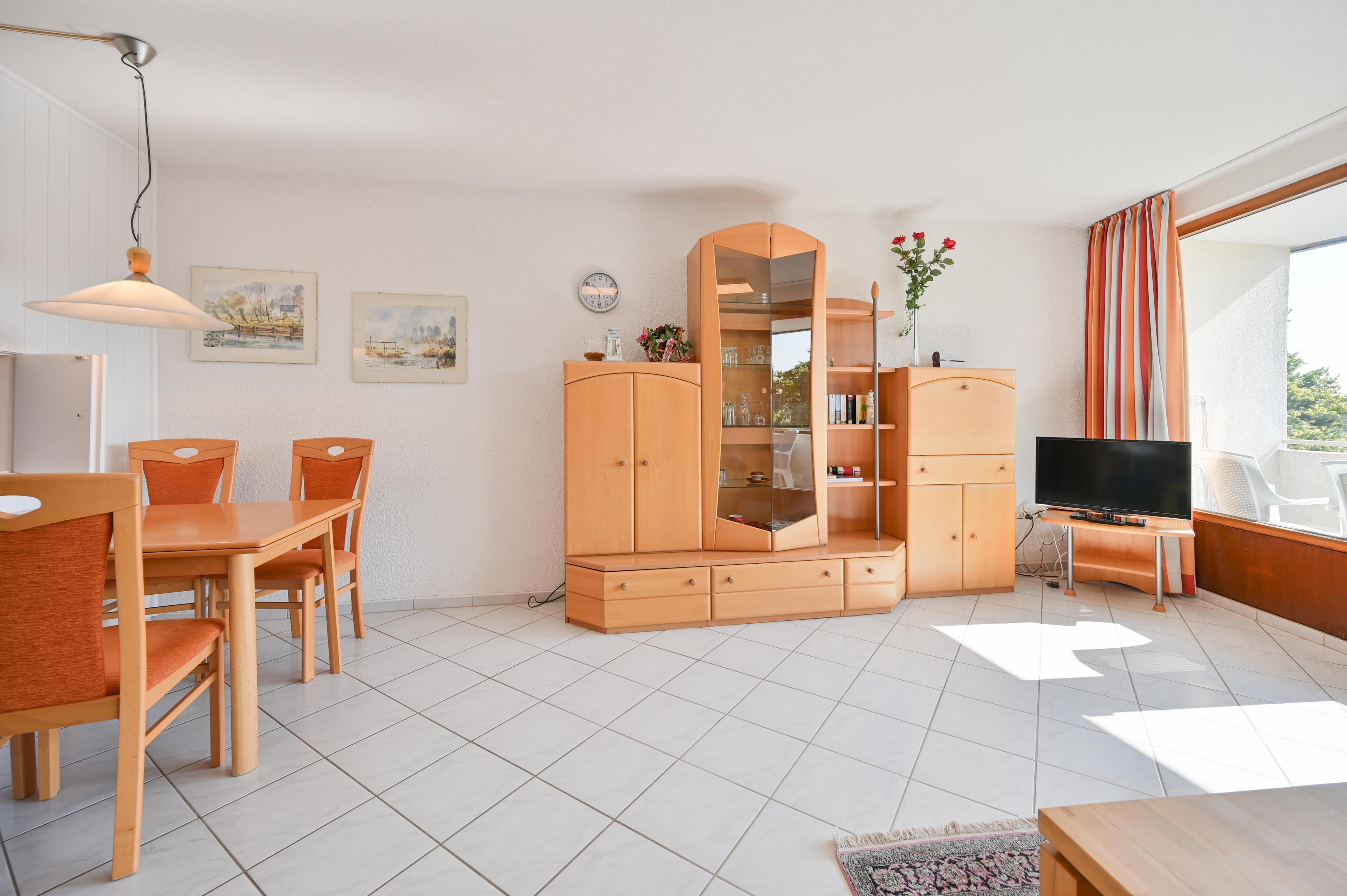 In dem gemütlichen Wohn- und Schlafraum befindet sich eine gemütliche Couch mit Blick zum Flachbild-TV. Hier befindet sich auch eine Essecke.
