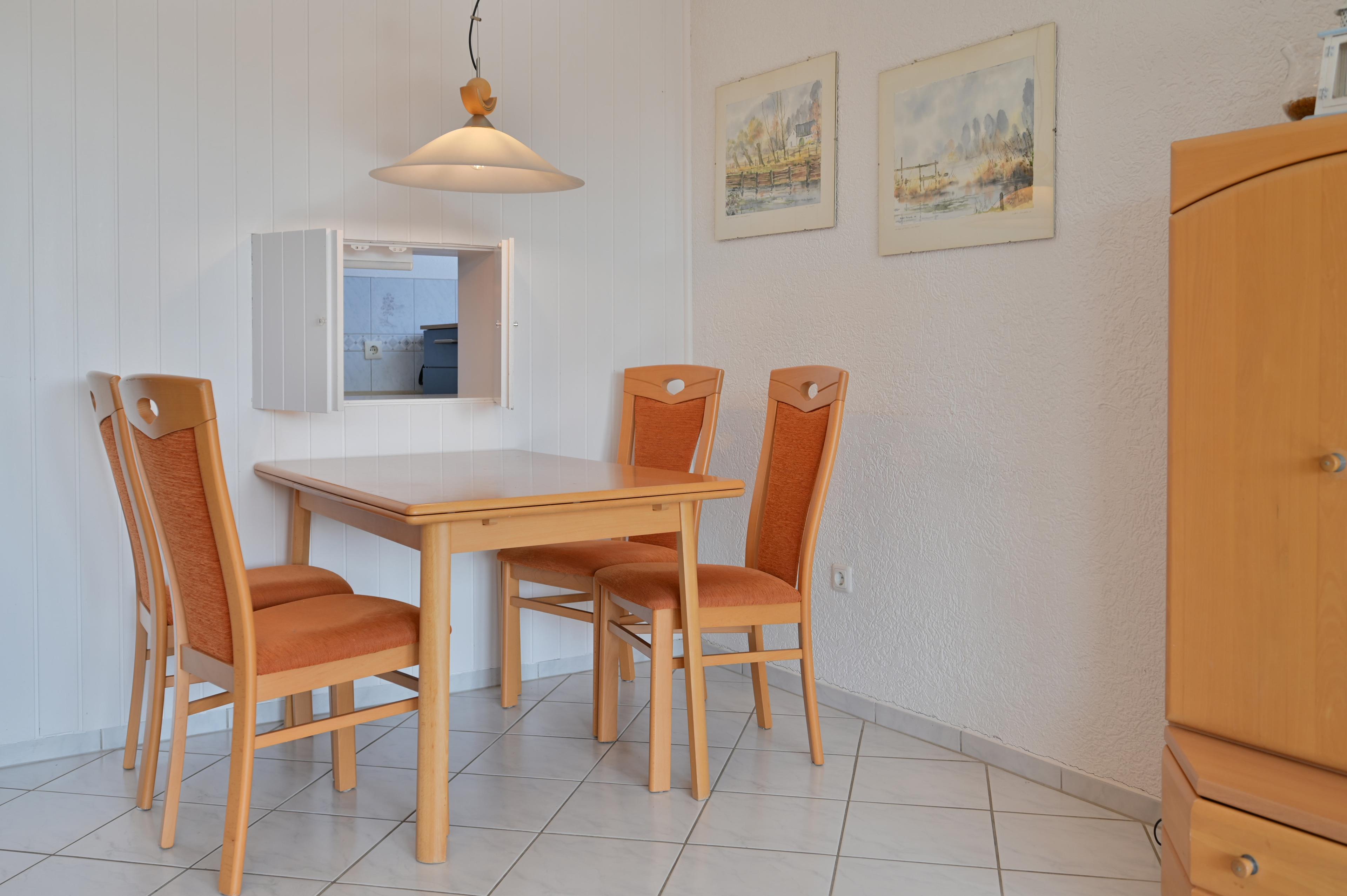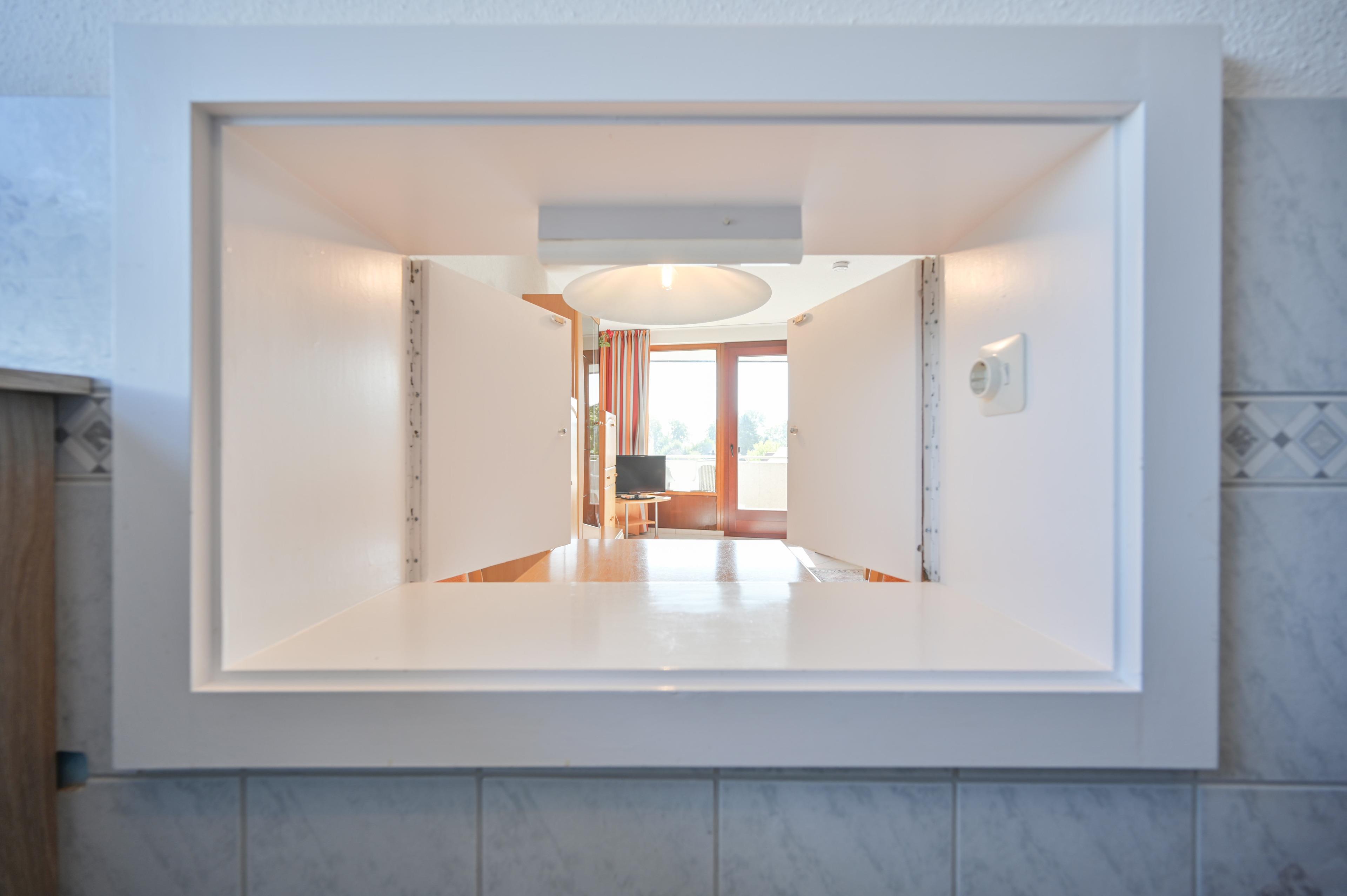 Gleich nebenan befindet sich die Küche, wo alle Geräte des täglichen Lebens zu finden sind. Von hier aus gibt es eine Durchreiche zum Wohnbereich.