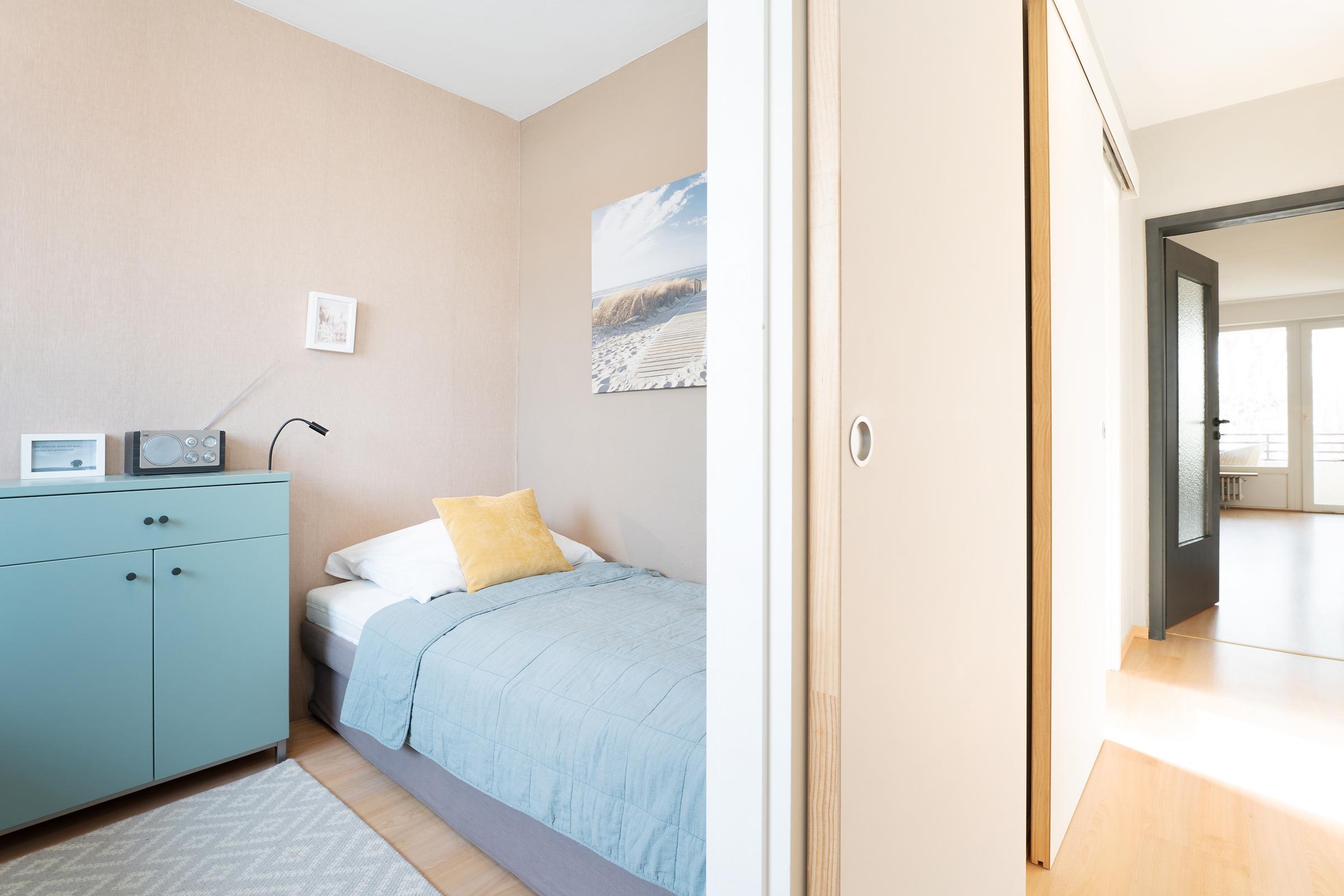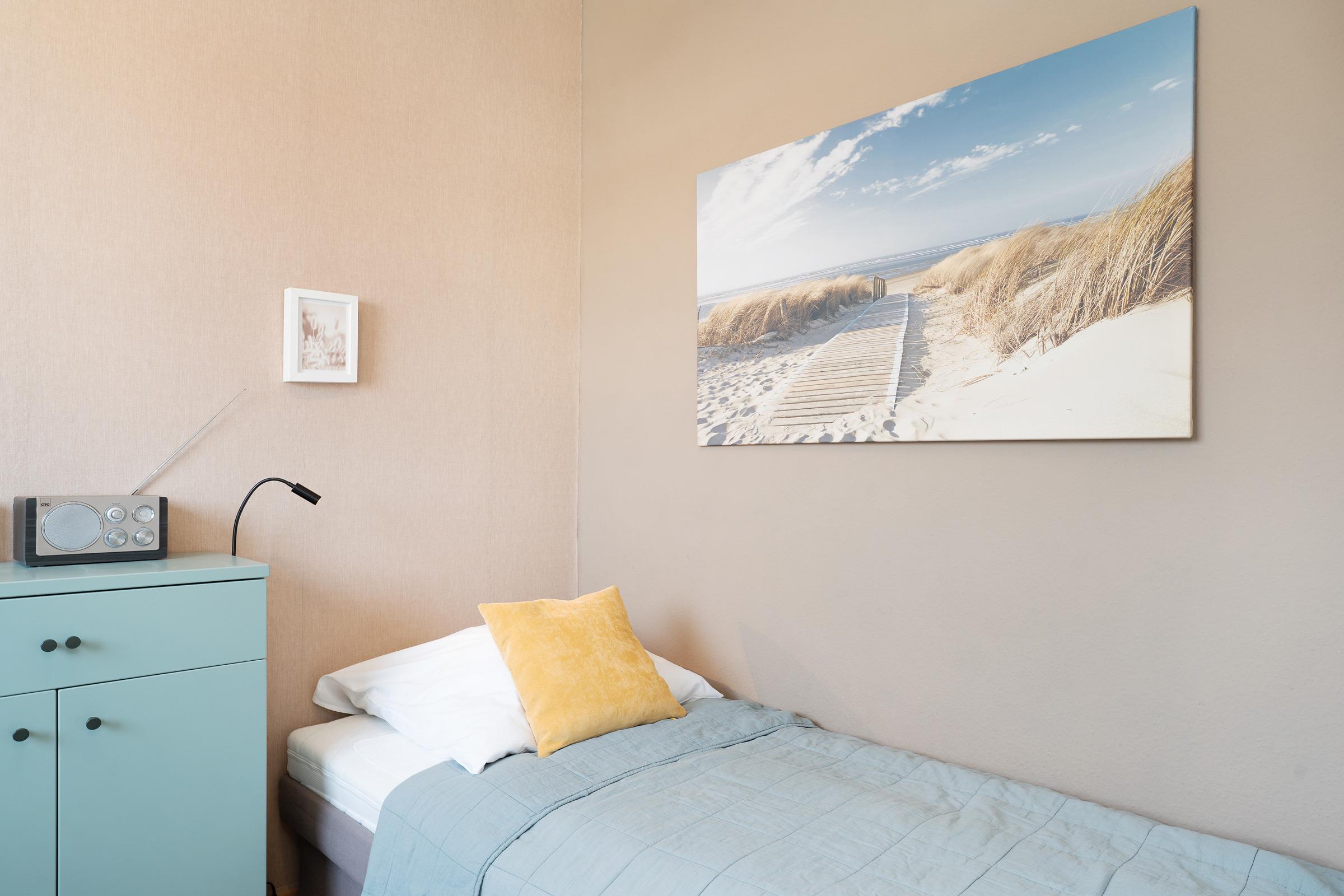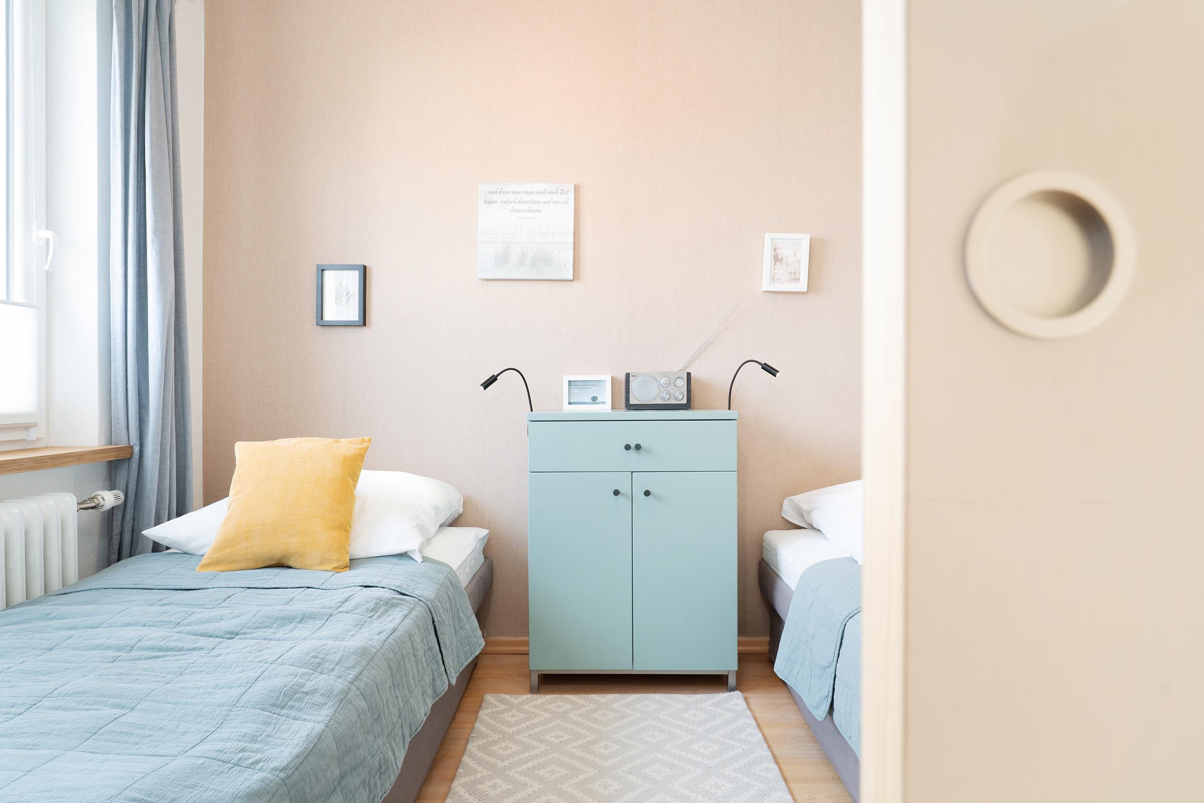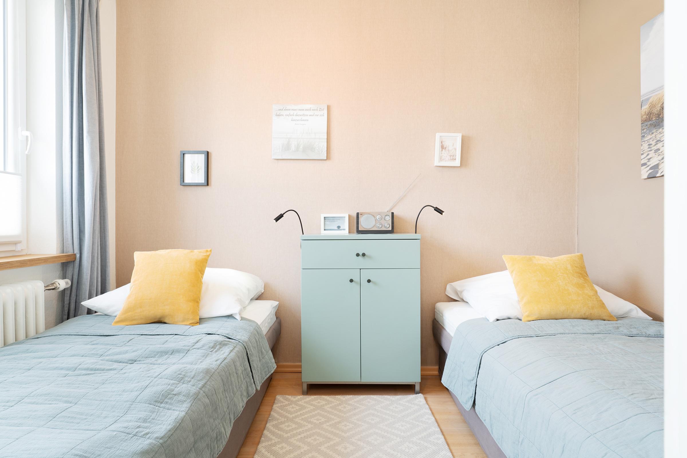 Schlafzimmer 2: 2 Einzelbetten (je 90x200 cm), Kommode, Verdunkelungsmöglichkeit (Rollo, Gardine)