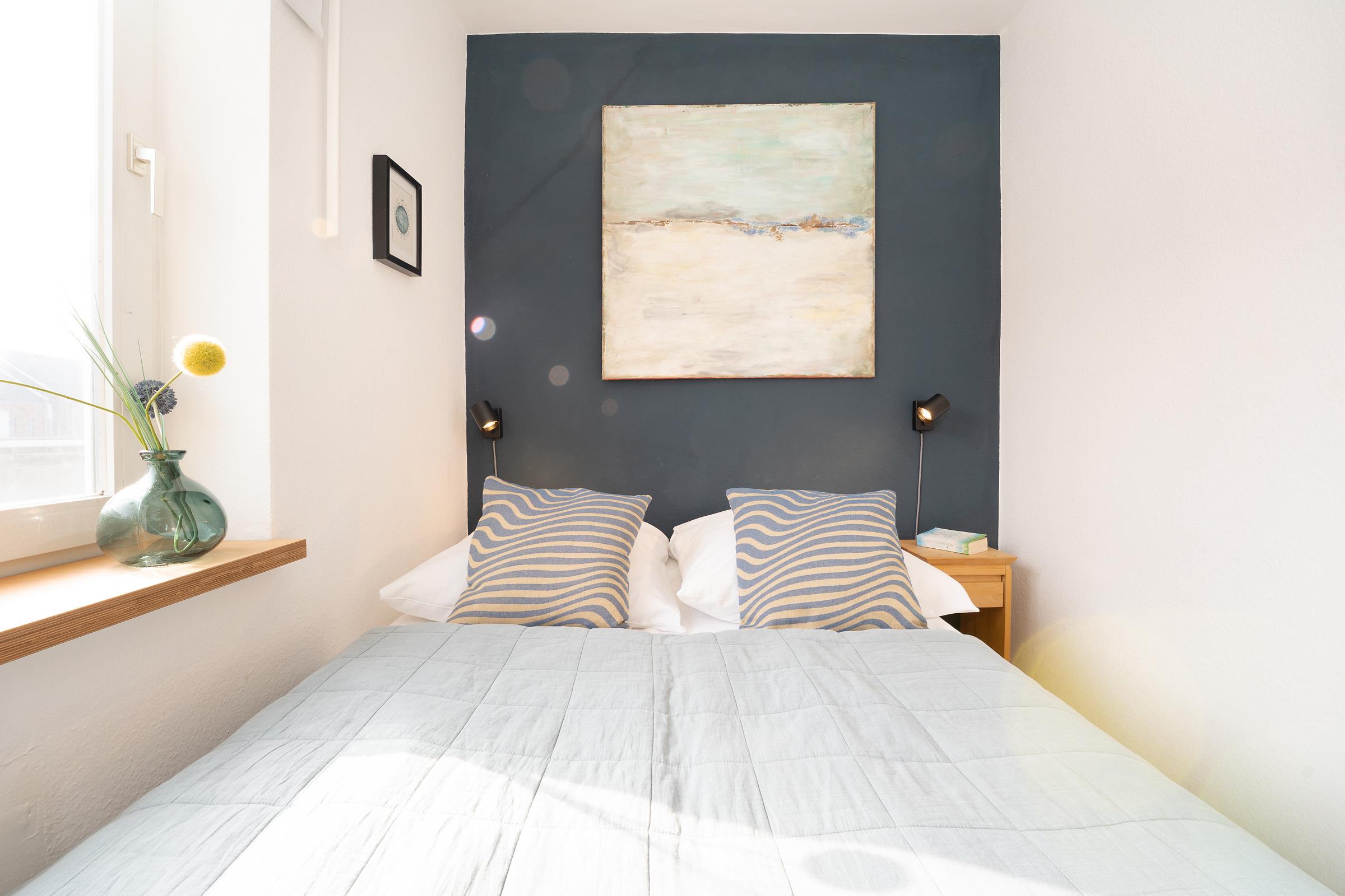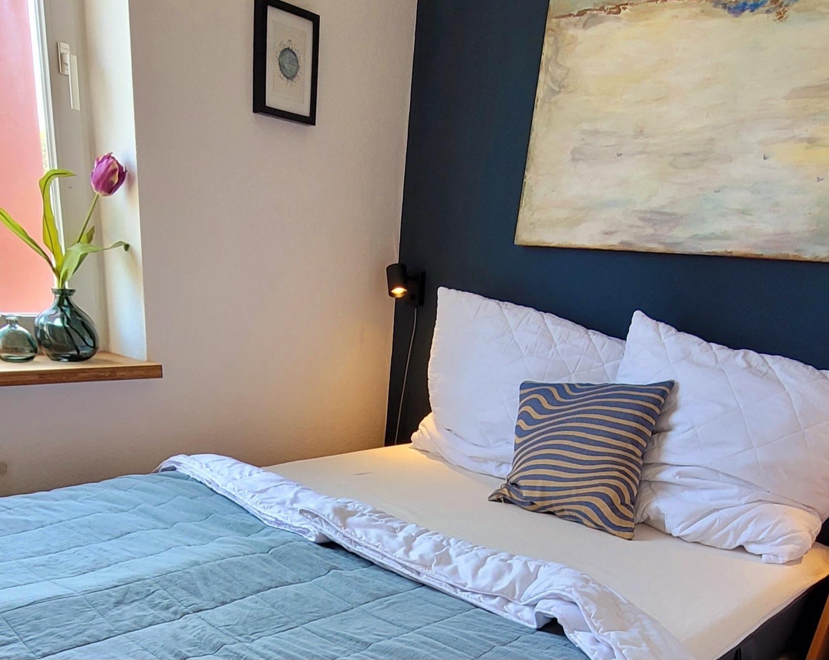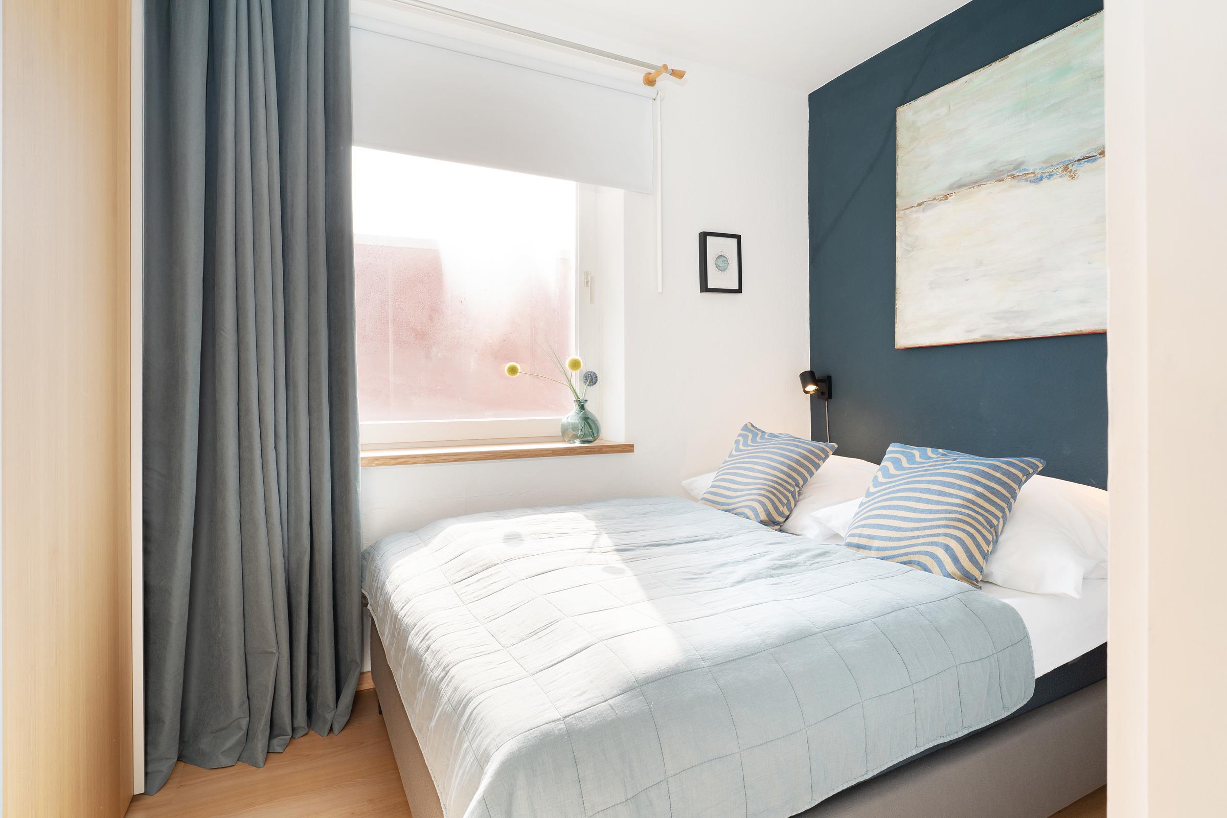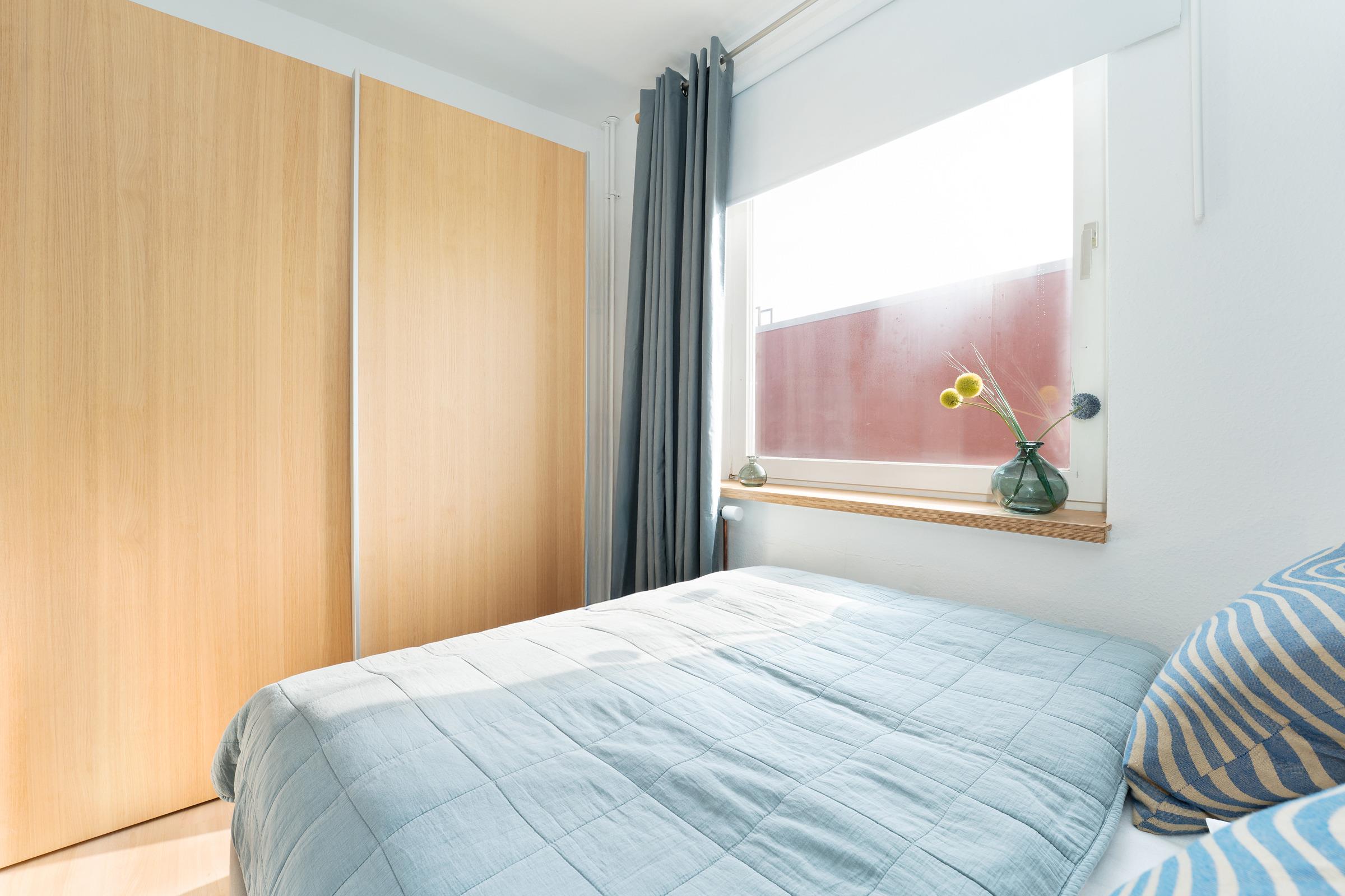 Schlafzimmer 1: 1 Doppelbett (140x200 cm), Kleiderschrank, Verdunkelungsmöglichkeit (Rollo, Gardine)