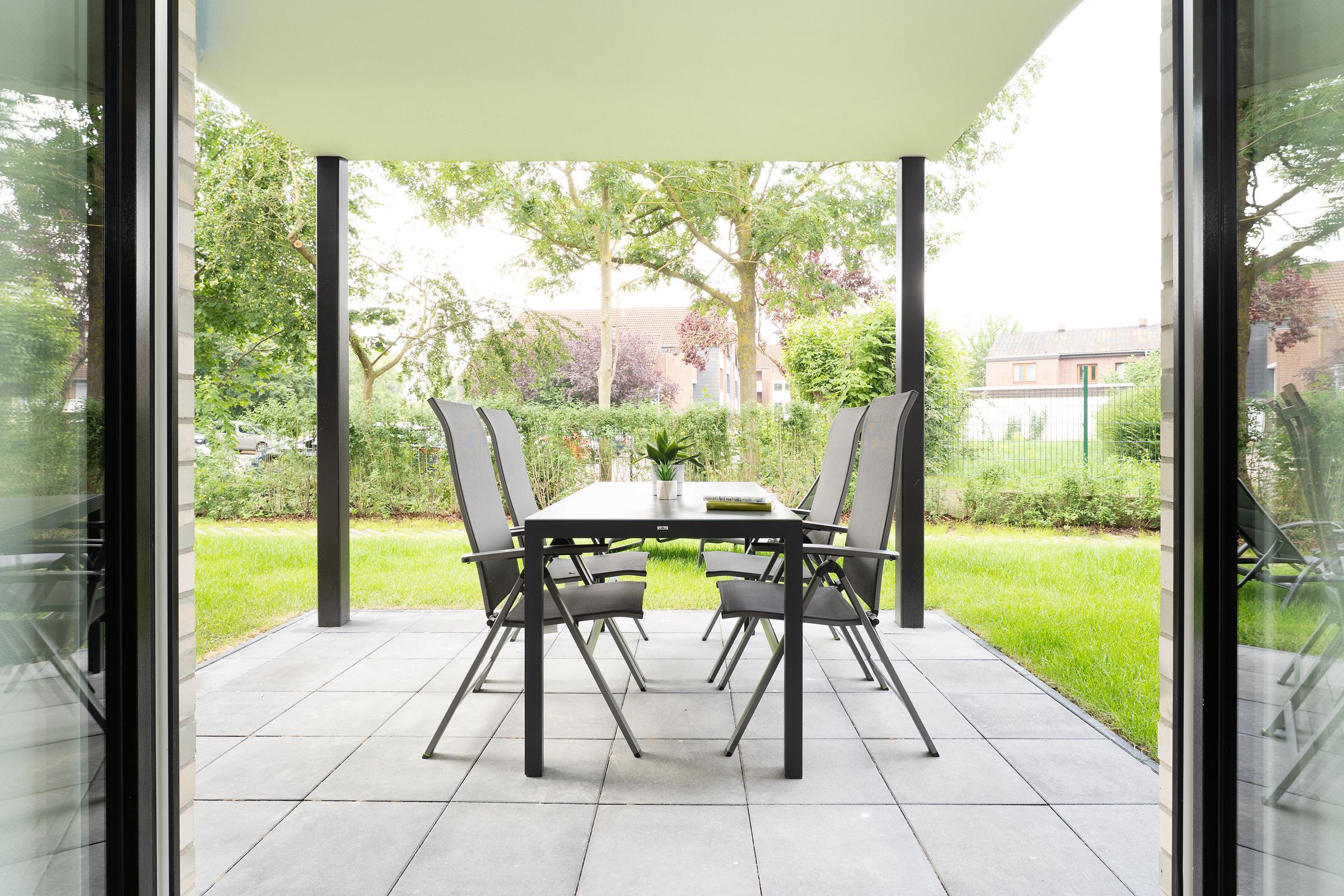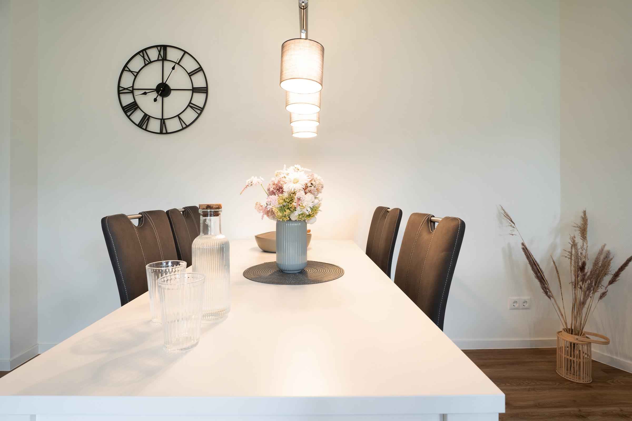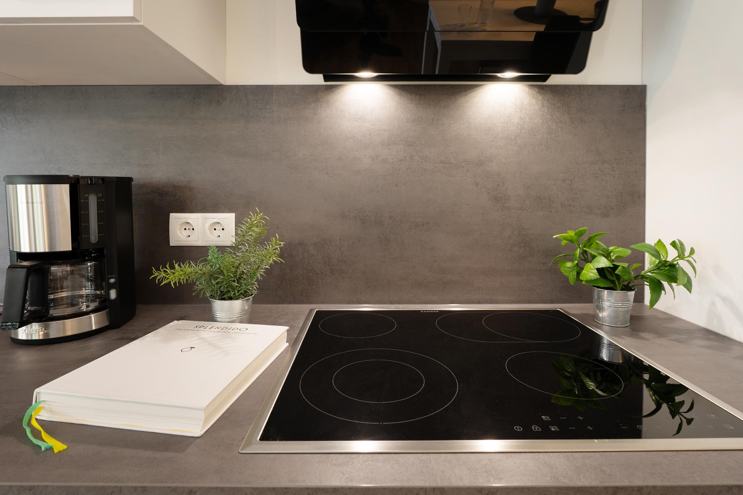 Die Küche ist modern und gut ausgestattet mit Ceran-Kochfeld, Backofen, Mikrowelle, Kühlschrank, Kaffeemaschine, Wasserkocher, Eierkocher und Toaster – hier bleiben keine Wünsche offen. Der angrenzende Essbereich bietet Platz für gemeinsame Mahlzeiten. Auf der Terrasse können Sie in den Gartenmöbeln entspannen und die frische Seeluft genießen.