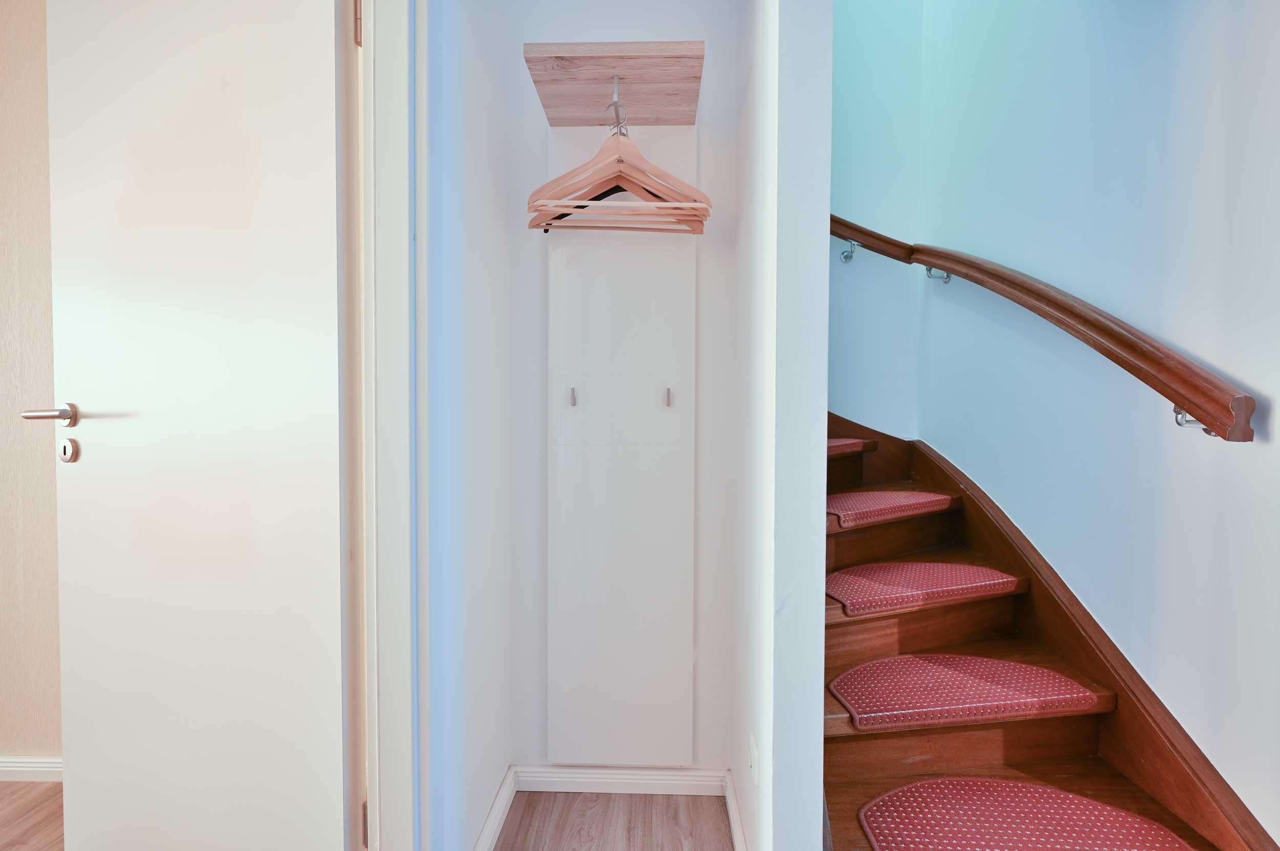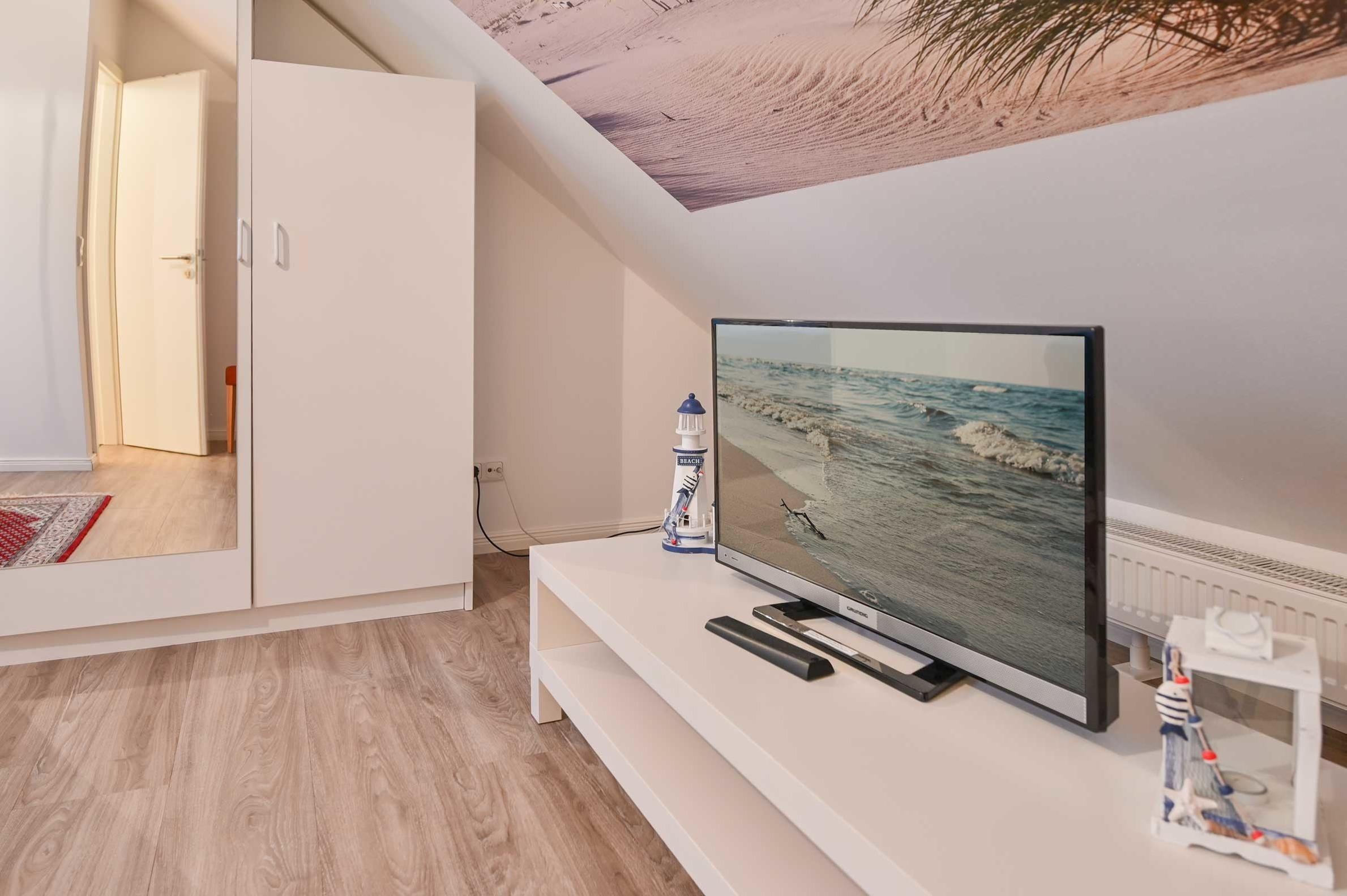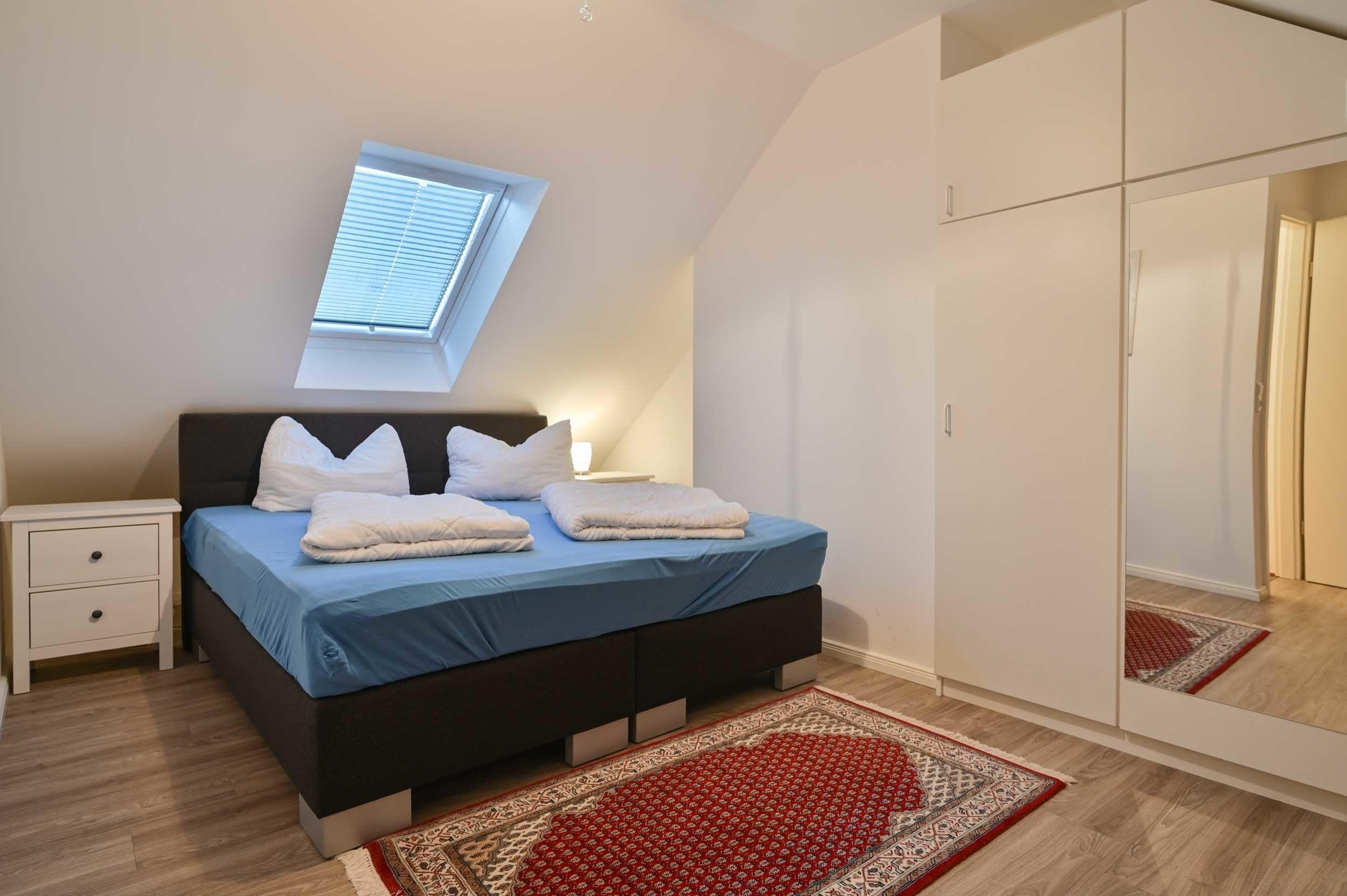 In der oberen Etage befindet sich der große Schlafraum der mit einem Boxspringbett und einem Kleiderschrank bestückt ist. Selbstverständlich steht Ihnen auch hier ein SAT-TV-Flachbildschirm zur Verfügung und sollte Ihnen es einmal zu warm werden schalten Sie einfach den Ventilator ein.