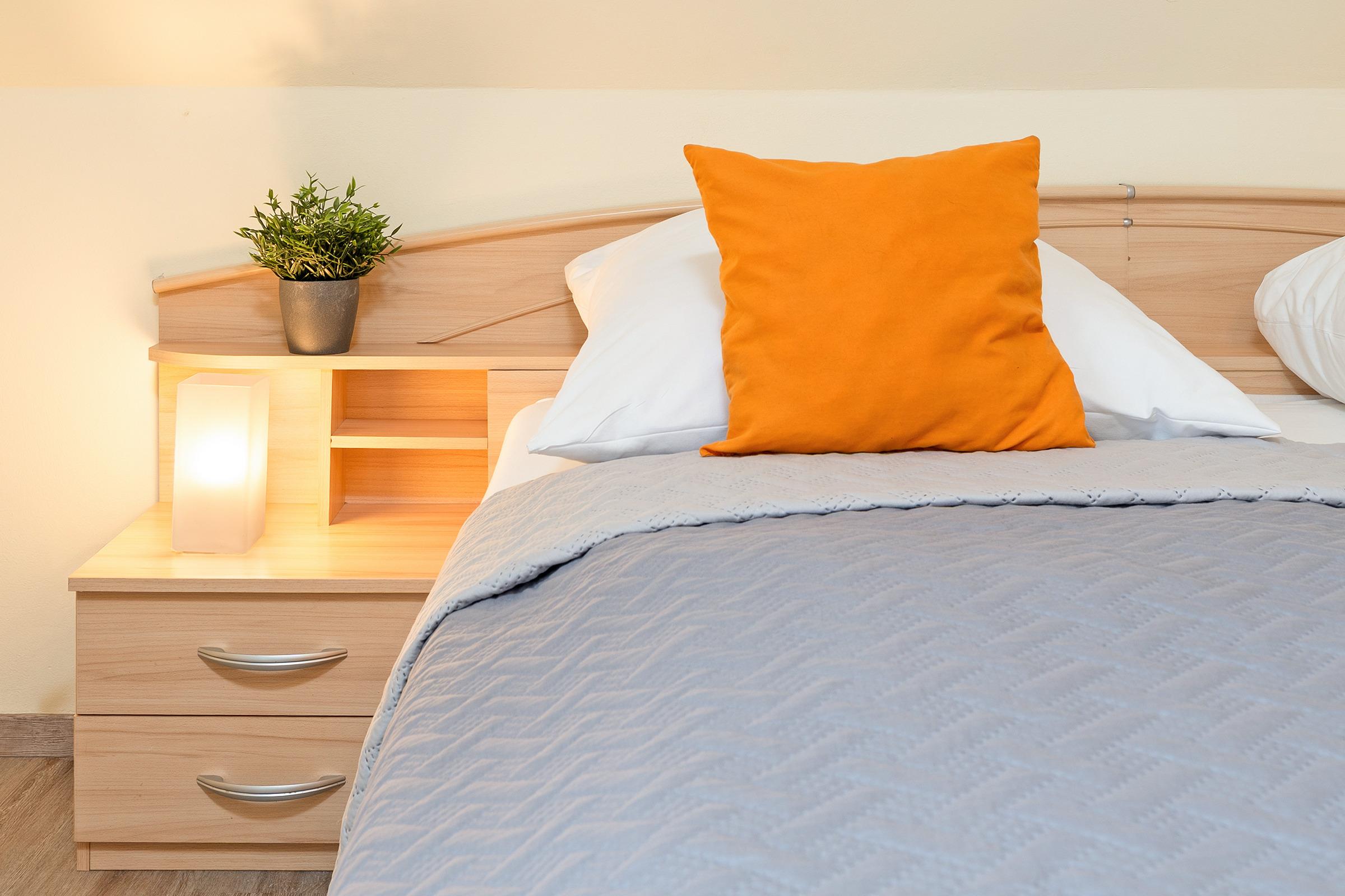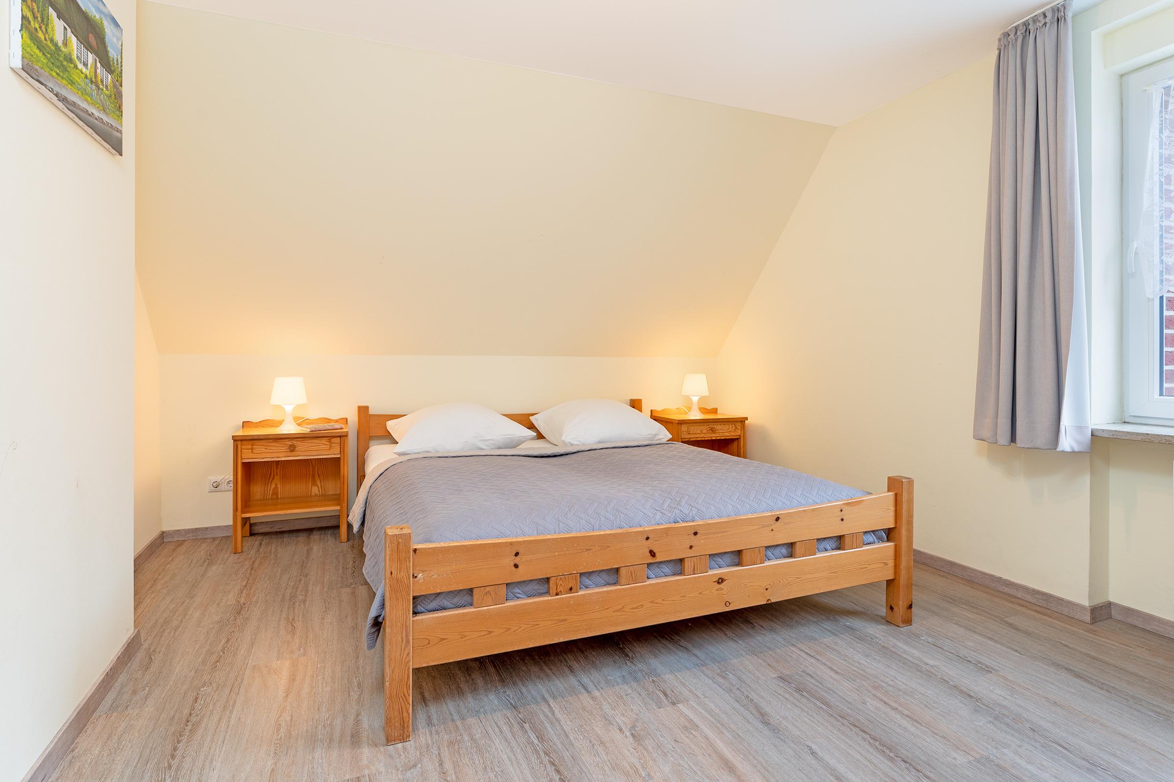 Schlafzimmer 1 (EG): 1 Doppelbett (2x 90 x 200 cm), Kleiderschrank, TV, Verdunkelung: Gardinen, Platz für ein Babybett