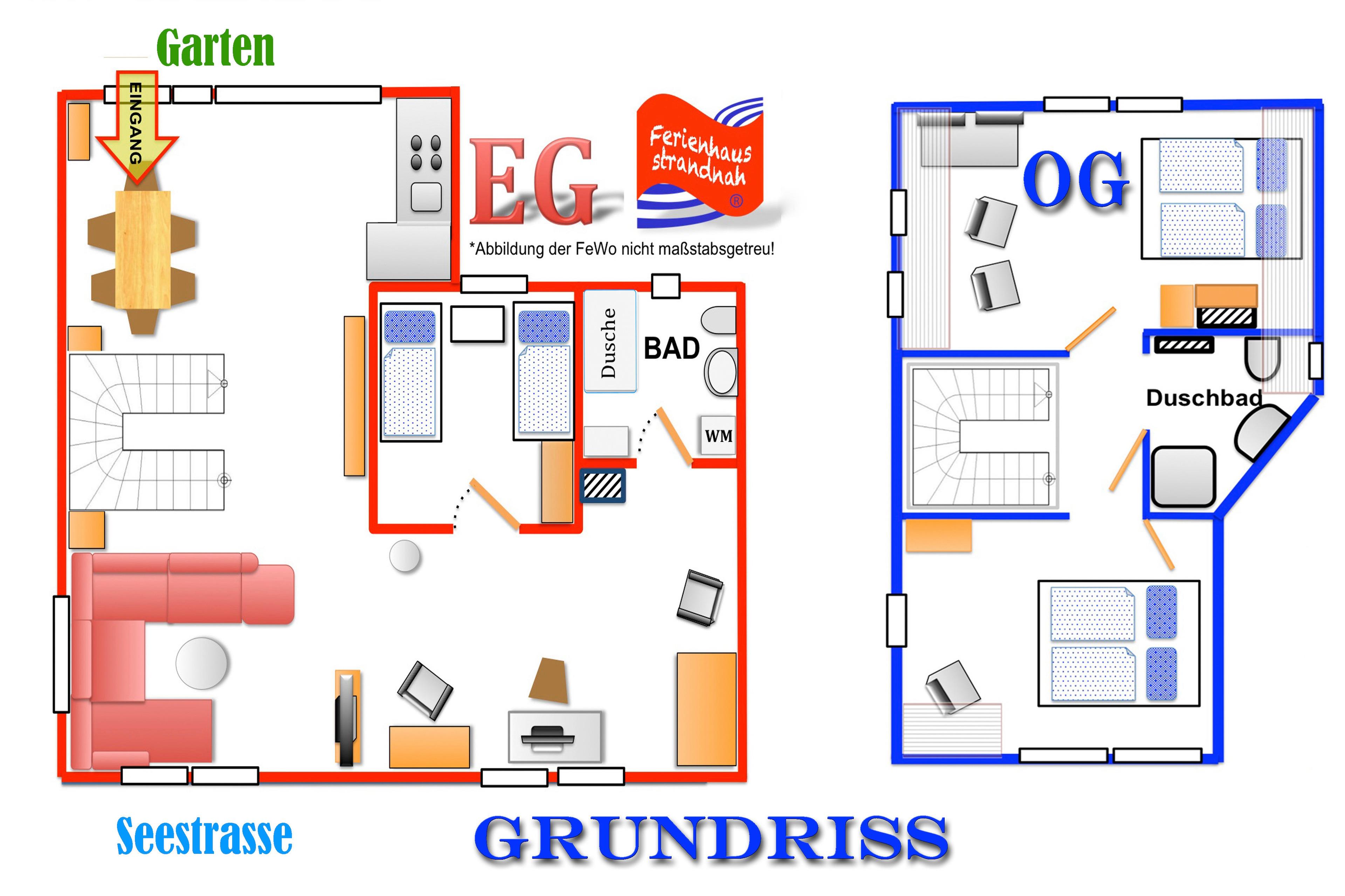 Das Objekt befindet sich in strandnaher Lage und verfügt über ein Erdgeschoss, ein Obergeschoss und eine gemütlich einladende Terrasse mit Blick in den grünen Garten.... Aufgeteilt ist Ihr Feriendomizil in: Offener Wohnbereich mit gemütlicher Couchgarnitur, gut ausgestatteter Küchenzeile und einem Schlafzimmer (2 Einzelbetten), Sat-TV, Stereoanlage mit CD-Player, Telefon und Internet-Wlan, Duschbad und WC, mit Fön und Waschmaschine. Die 1. Etage ist wie folgt aufgeteilt: