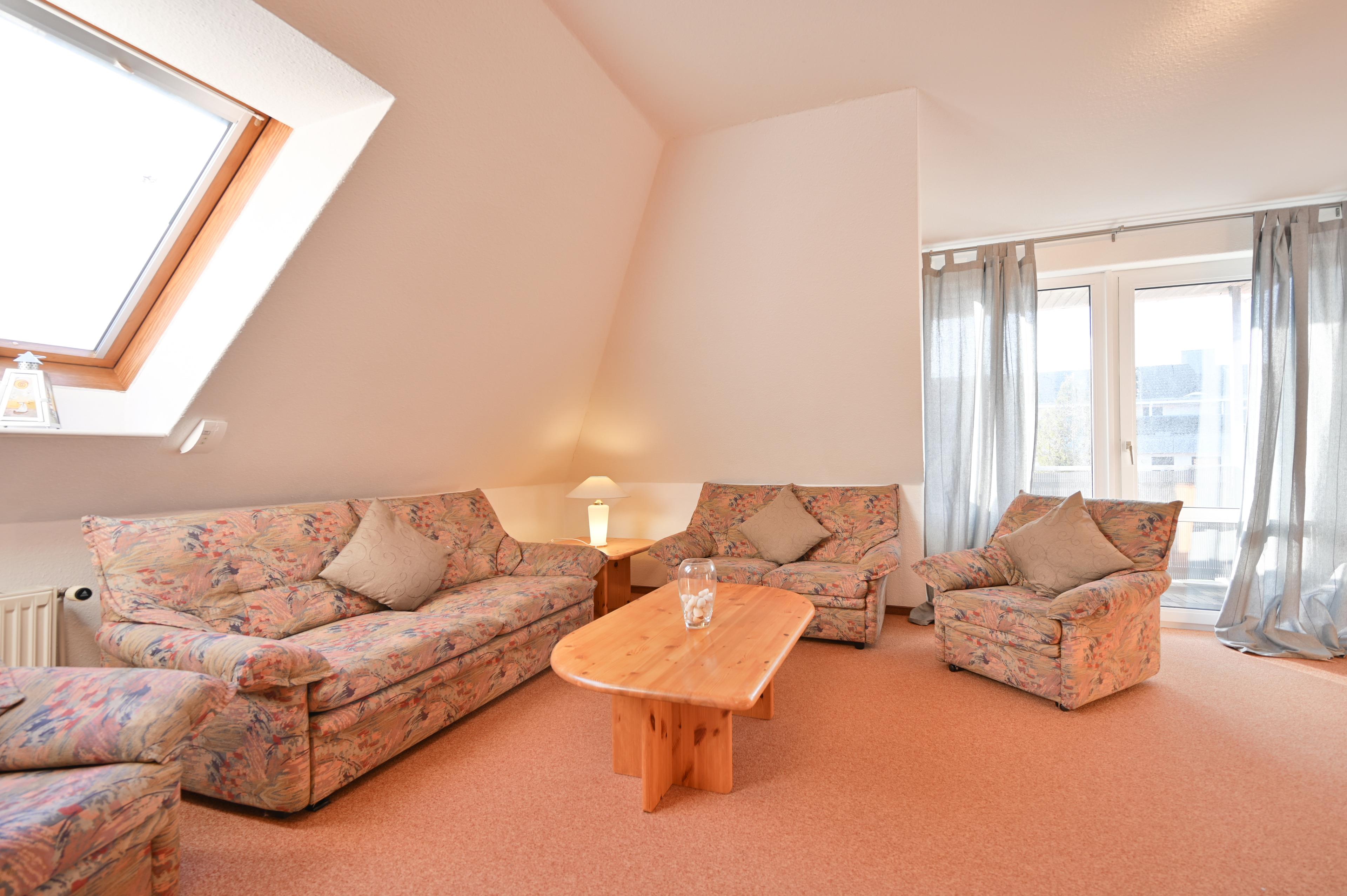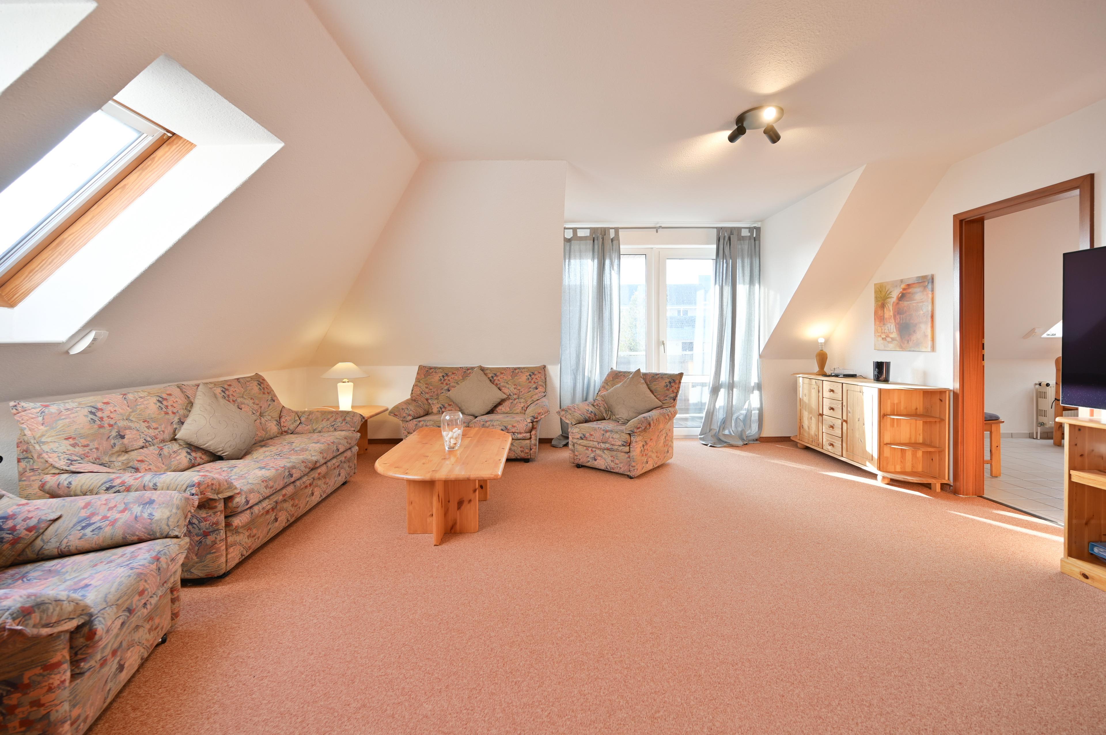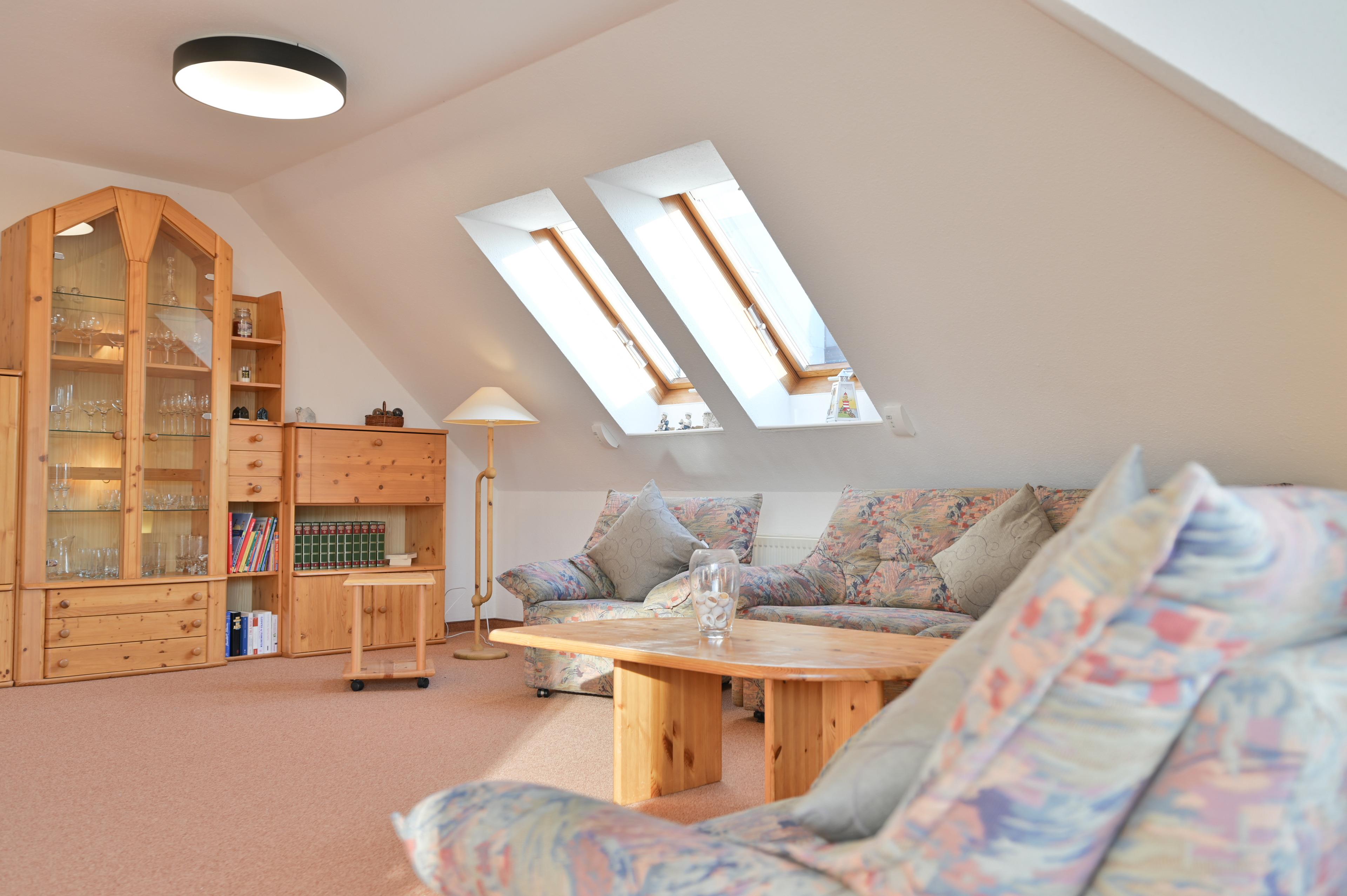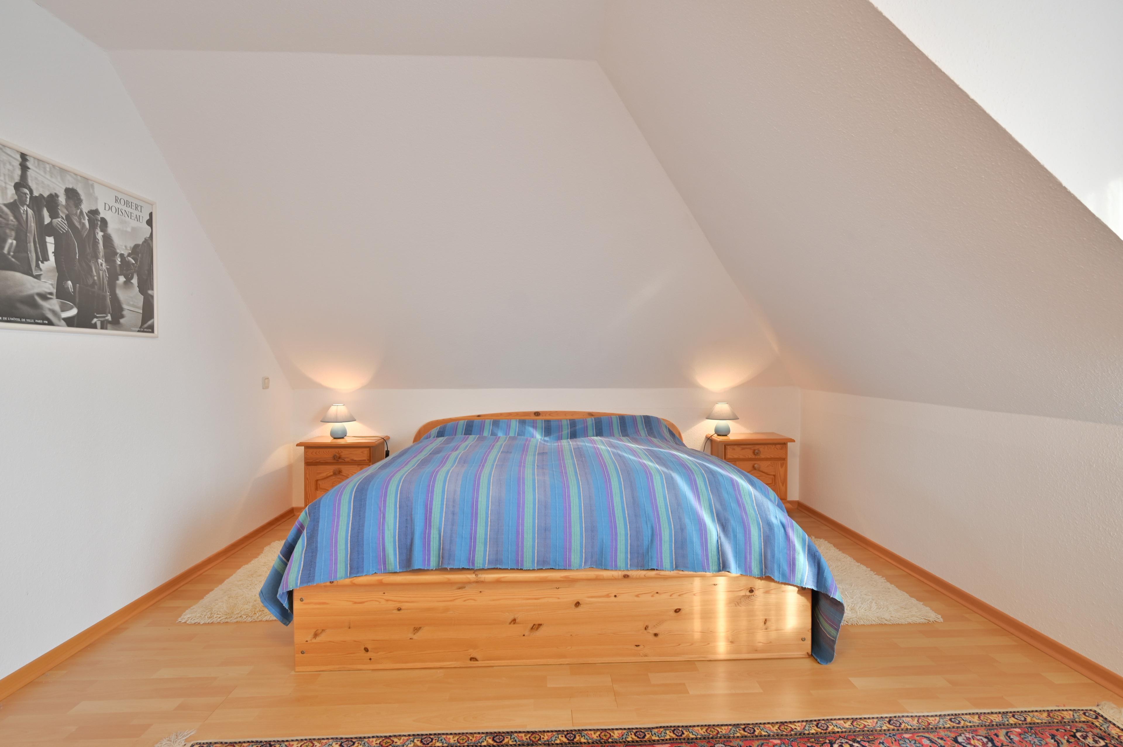Die Dachschrägen verleihen der Wohnung Gemütlichkeit und aufgrund der Abzugsflächen ist die tatsächliche Bodenfläche weit größer, wodurch die Wohnung sehr geräumig ist und so ausreichend Platz bietet.