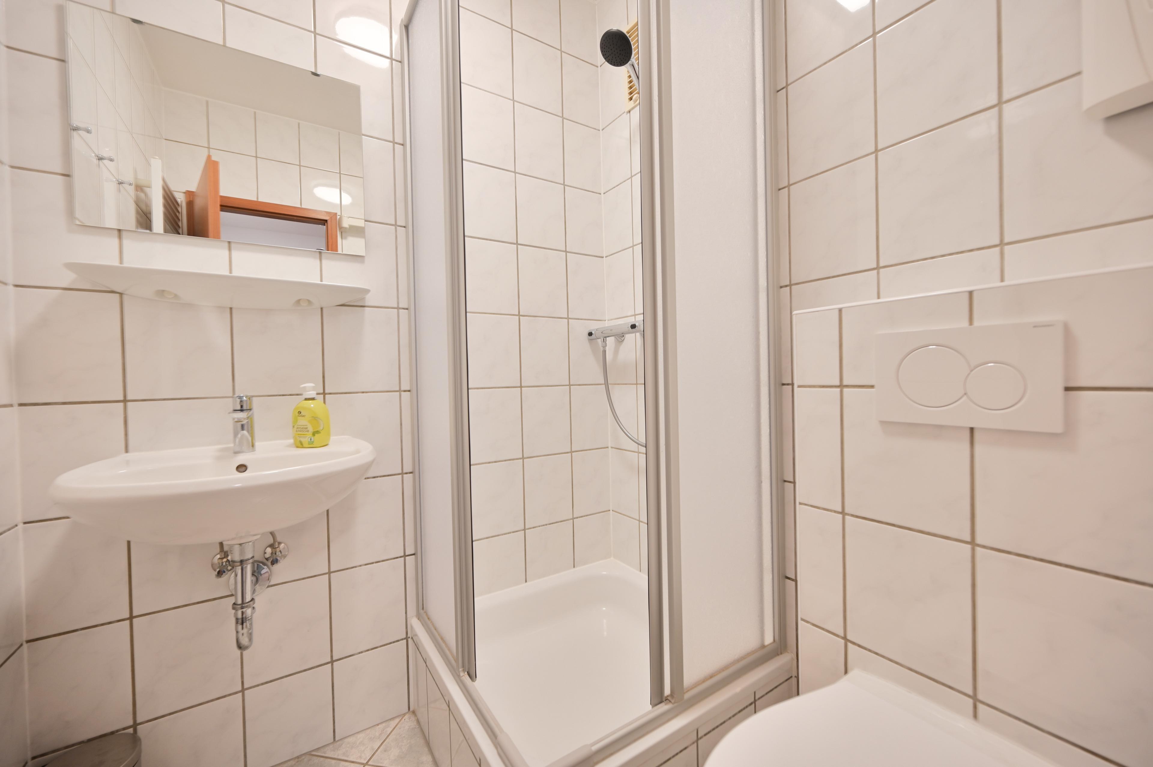 Das gepflegte Badezimmer verfügt über Dusche und WC und ist hell und zeitlos gestaltet.