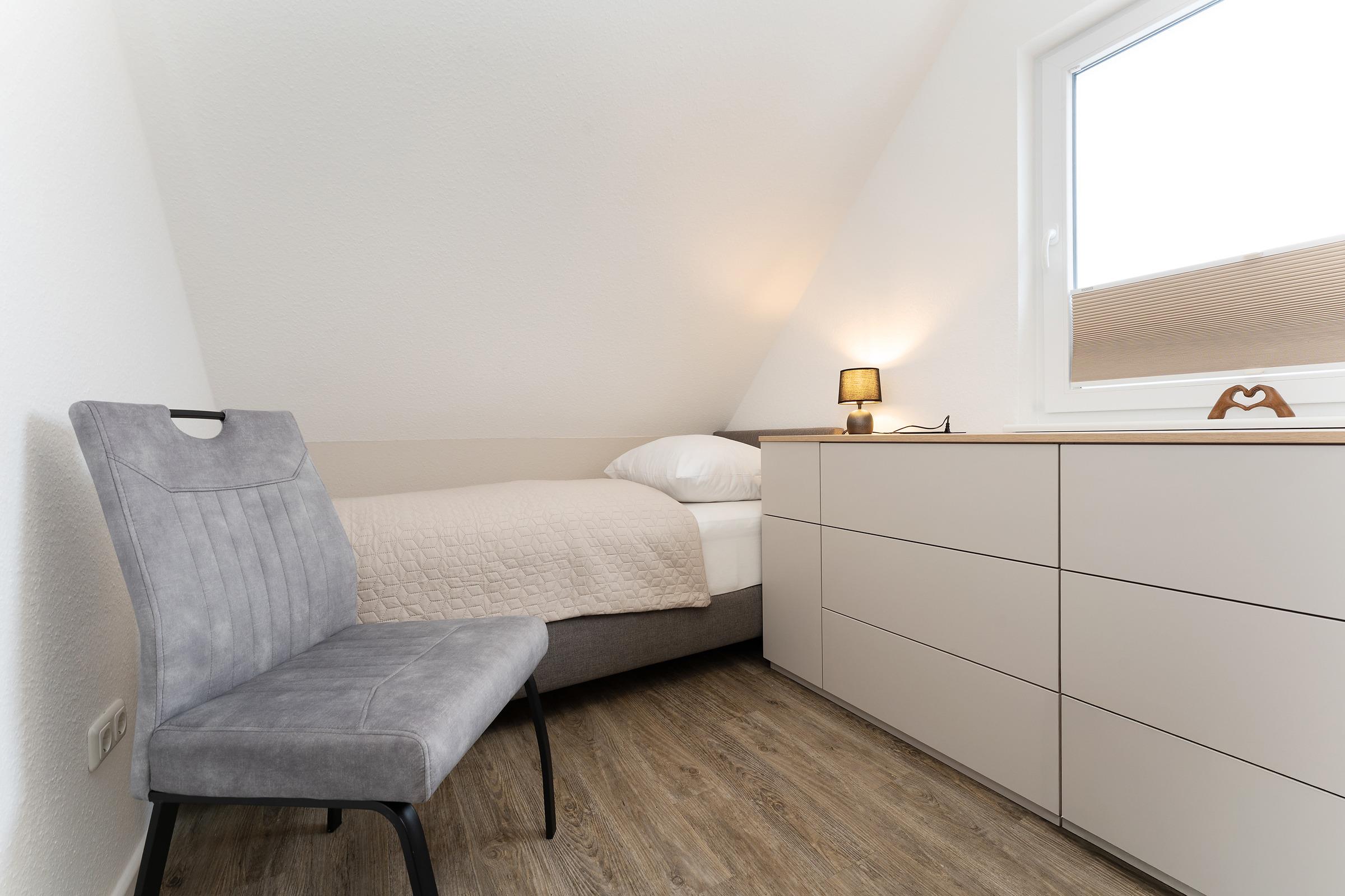 Zwei separate Schlafzimmer sorgen für erholsamen Schlaf. Schlafzimmer 1 bietet ein komfortables Boxspring-Doppelbett (2 × 90 × 200 cm), einen großen Kleiderschrank mit integrierter Kommode, TV sowie Platz für ein Babybett. Schlafzimmer 2 ist mit zwei Boxspring-Einzelbetten (je 90 × 200 cm) und einer großen Kommode ausgestattet. Im Wohnbereich steht zusätzlich eine hochwertiges Schlafsofa (120 × 200 cm) bereit.