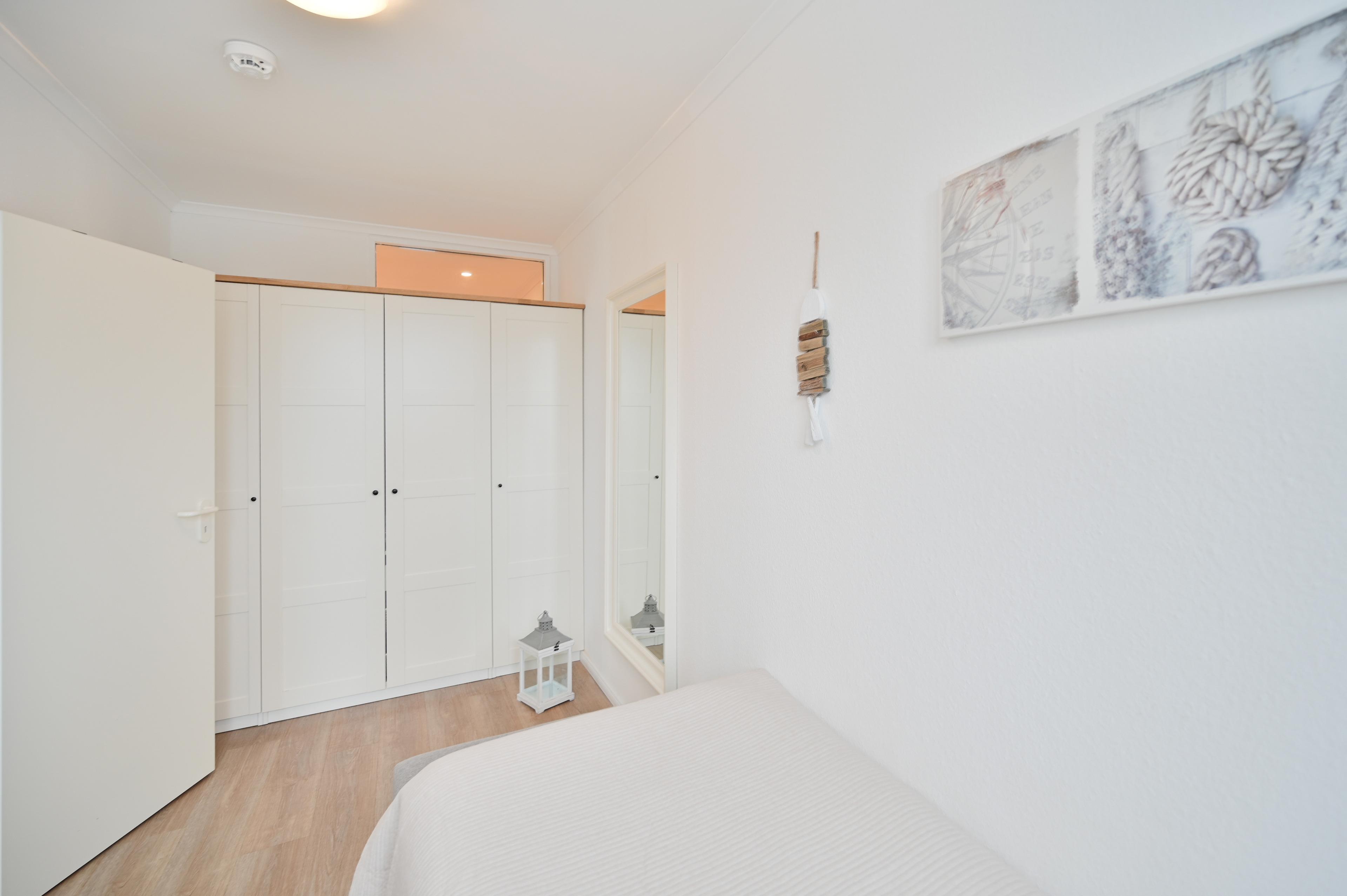 Das Gästezimmer ist ebenfalls hell und gemütlich eingerichtet. Hier befindet sich die dritte Schlafmöglichkeit (Einzelbett 80 × 200 cm). Außerdem sind in diesem Raum die Kleiderschränke mit ausreichend Stauraum untergebracht.