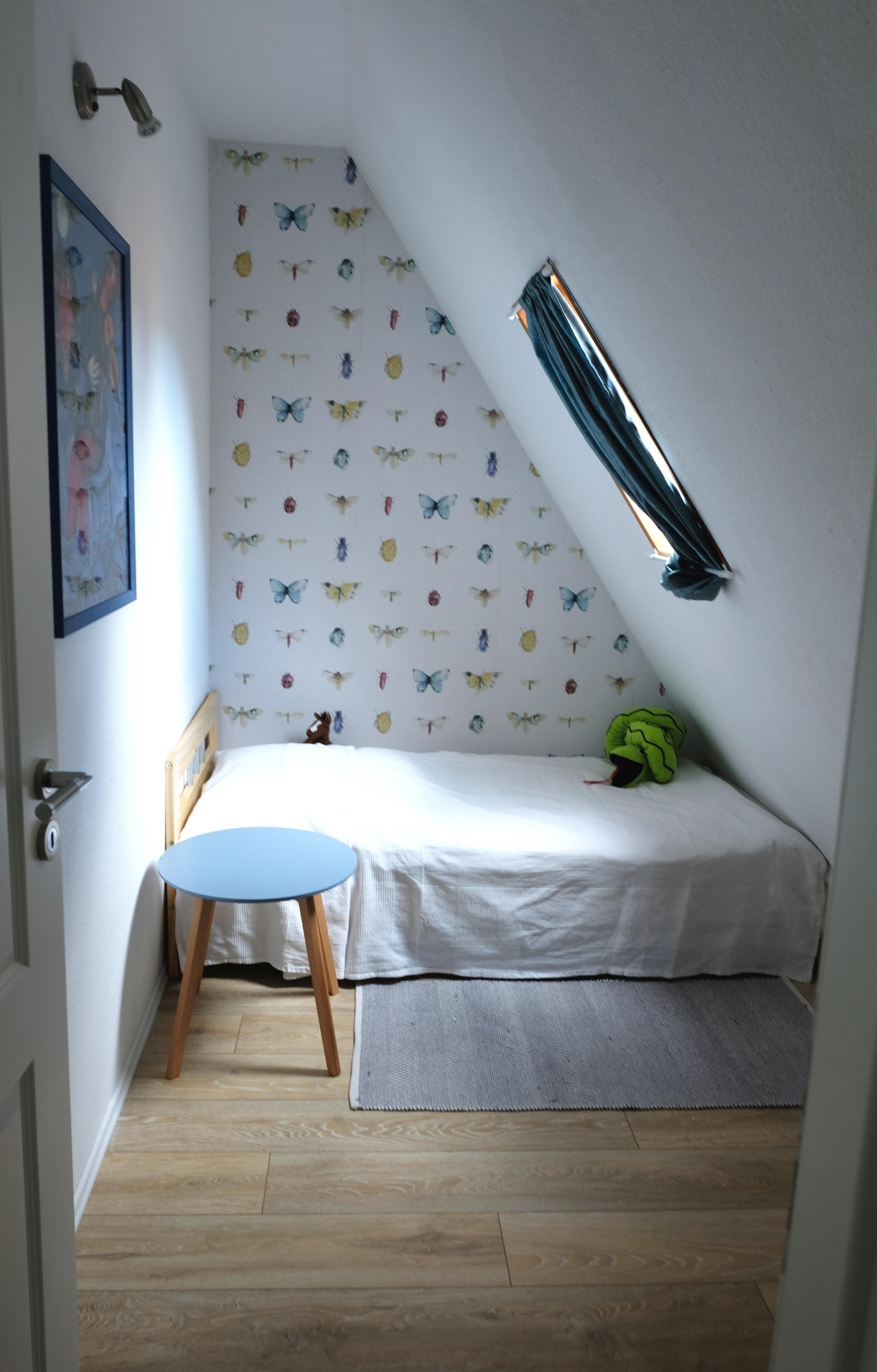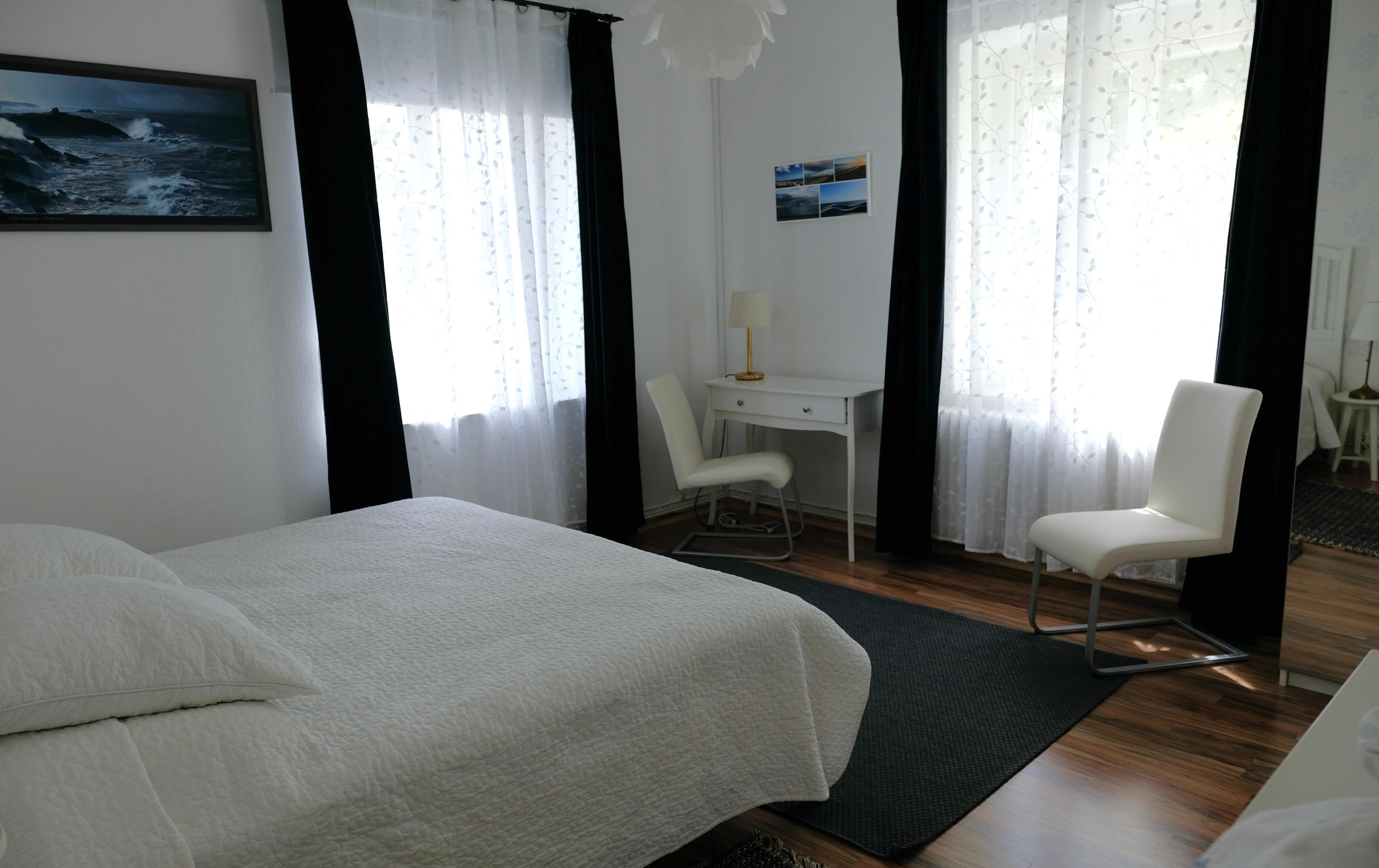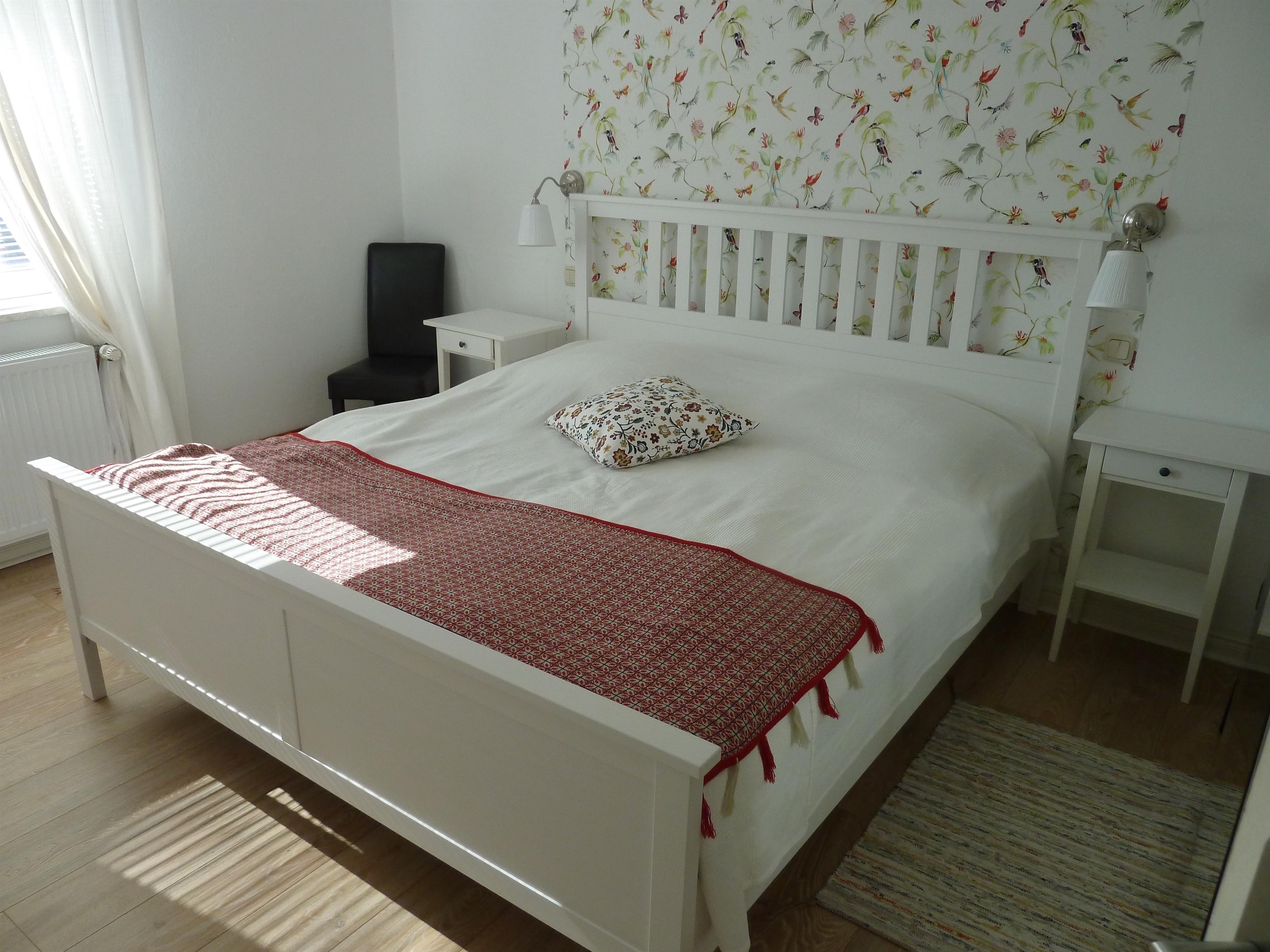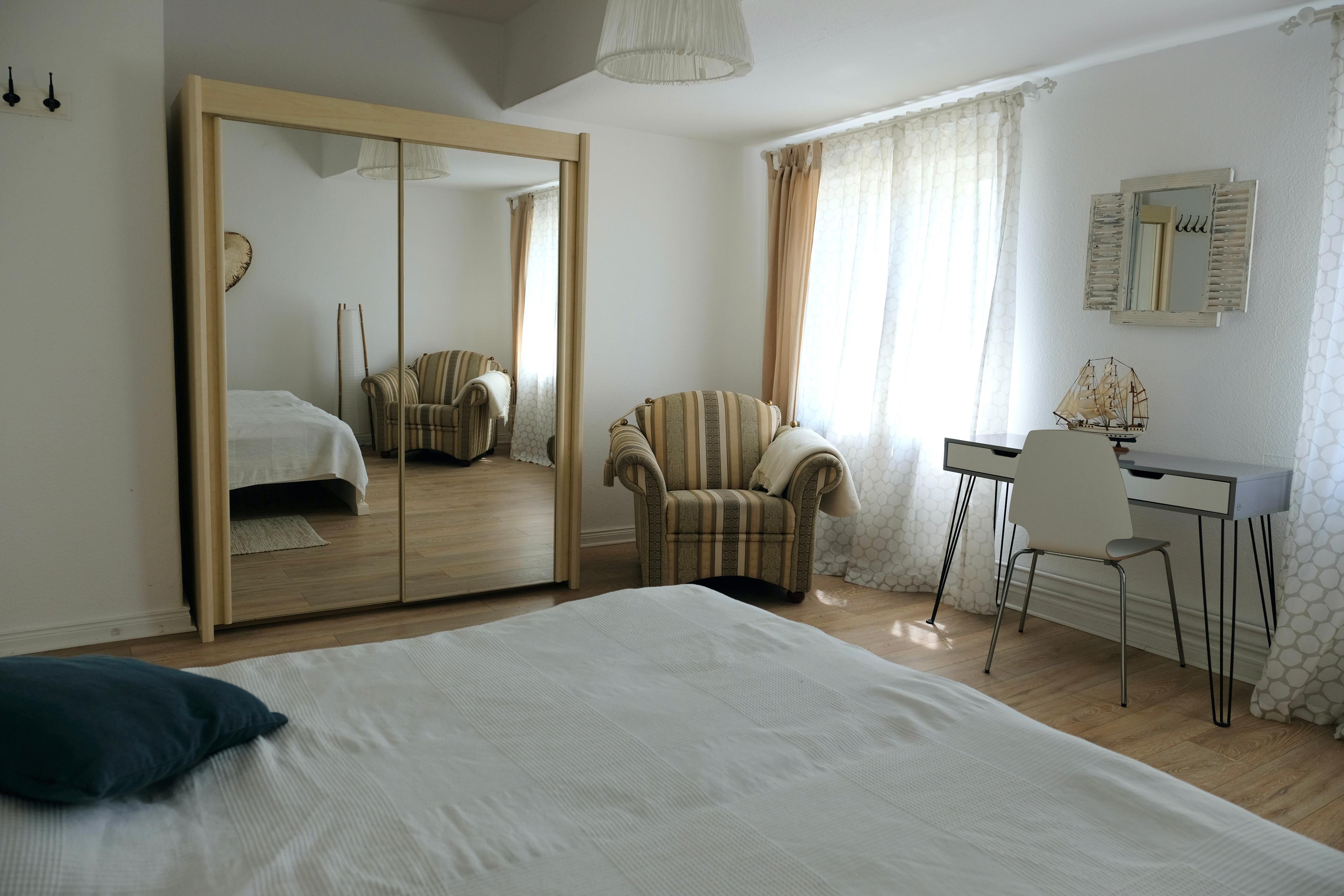 Von der Küche aus gelangt man über einen Hinterausgang direkt in den Garten. Das 1. großen Schlafzimmer im EG hat ein großes bequemes DB, Nachttische, Leselampen, Regal, bequeme Stühle, Schreibtisch, Kleiderschrank und ist vollständig abdunkelbar.