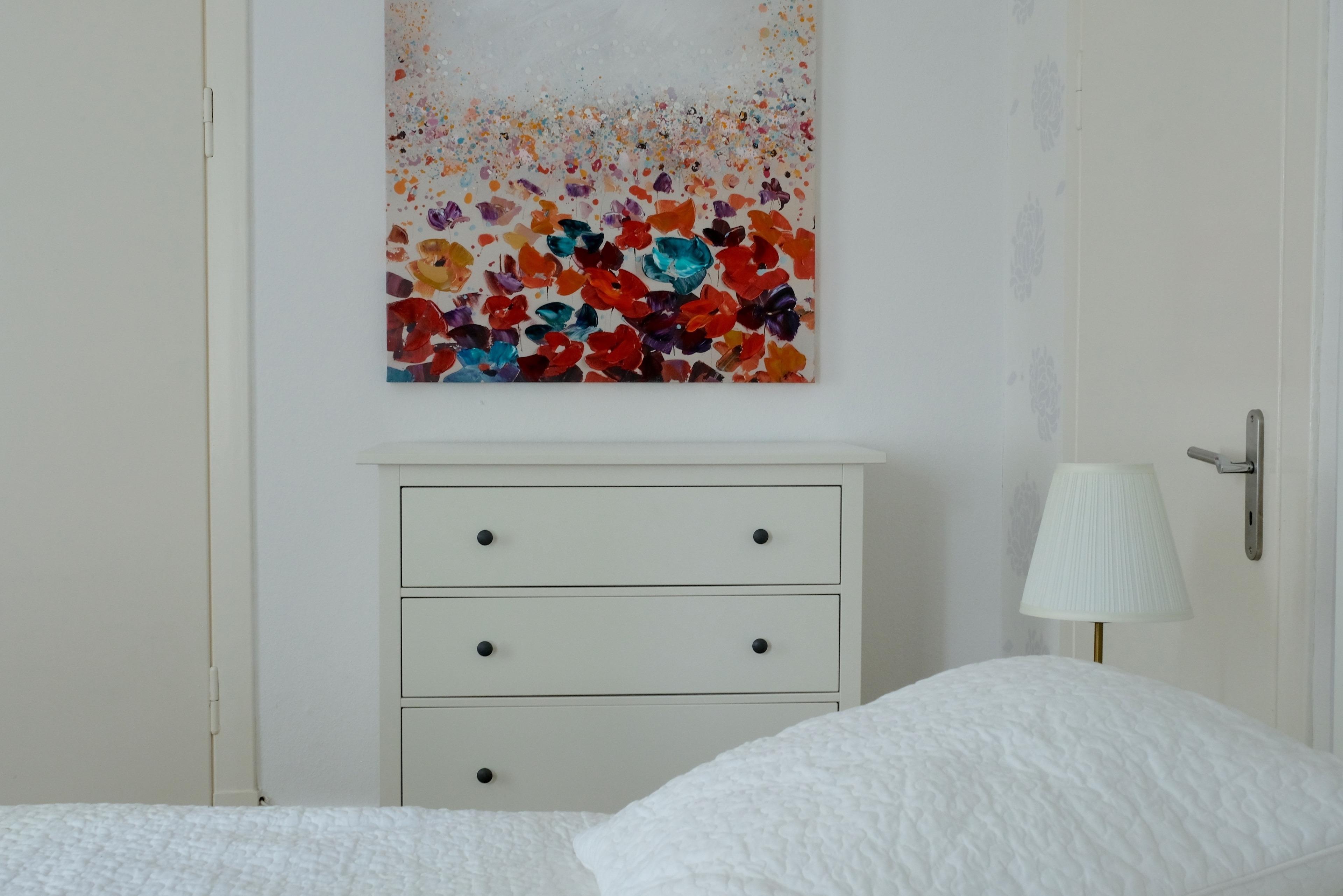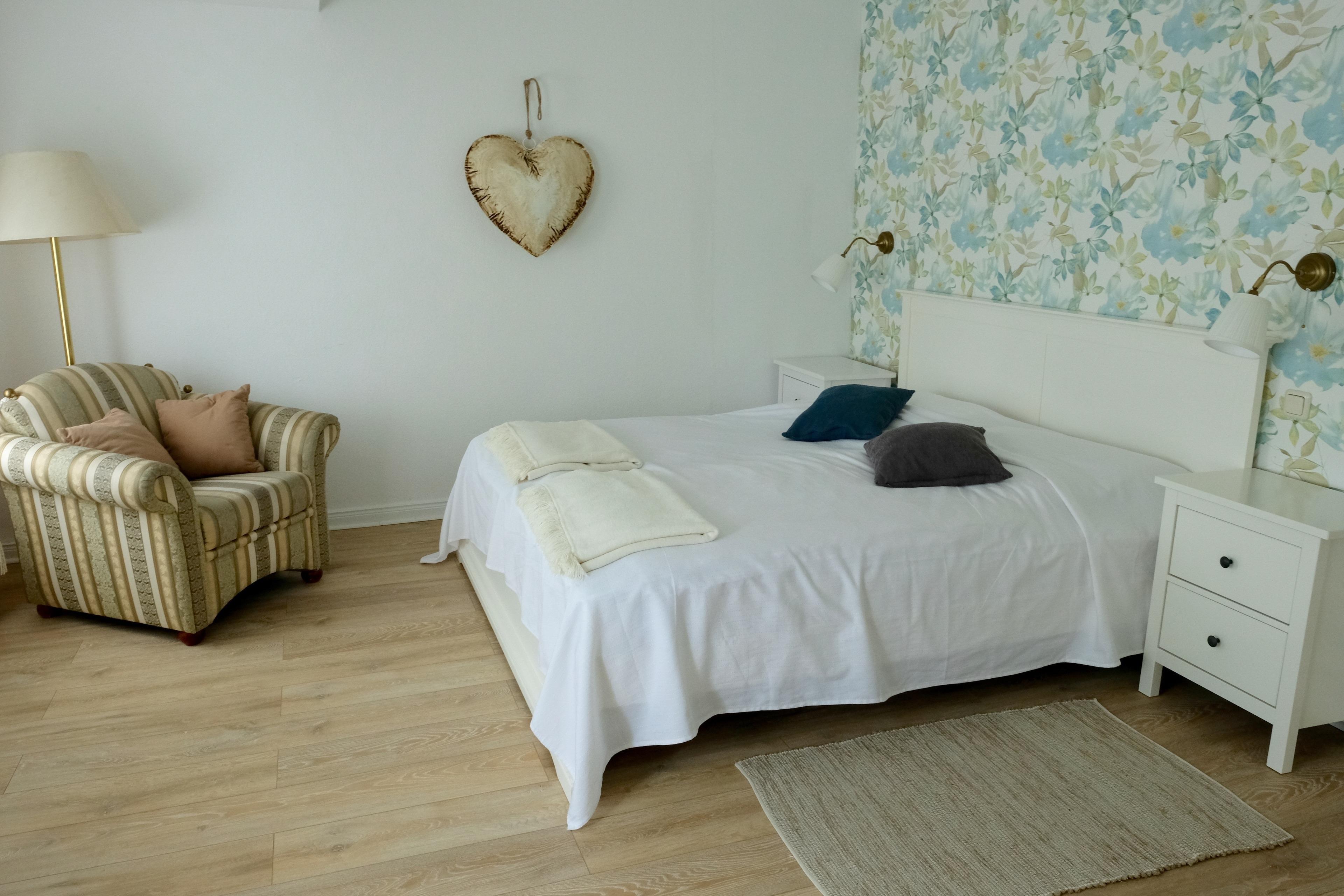 Im 3. schönen, großzügigem Schlafraum finden Sie ein großes, bequemes DB, Nachttische, Leselampen, kleine Couch, Sessel, Schreibtisch und Kleiderschrank. Kinderreisebett, Hochstuhl, Triptrap, Wickeltisch wird auf Wunsch zur Verfügung gestellt. Ein Bollerwagen steht bereit. Die Waschmaschine (Aufpreis), ein Trockner (Aufpreis), Bügeleisen und Bügelbrett befinden sich im Keller. Das Wäschepaket1 (Bettwäsche, 2x normal gr. Handtücher pP / Aufenthalt) wird angeboten. Es ist gegen Aufpreis buchbar. Das Wäschepaket2 (2 Geschirrtücher, Küchenhandtuch, Topflappen, 2 Duschvorleger pro Aufenthalt) ist gegen Aufpreis buchbar.