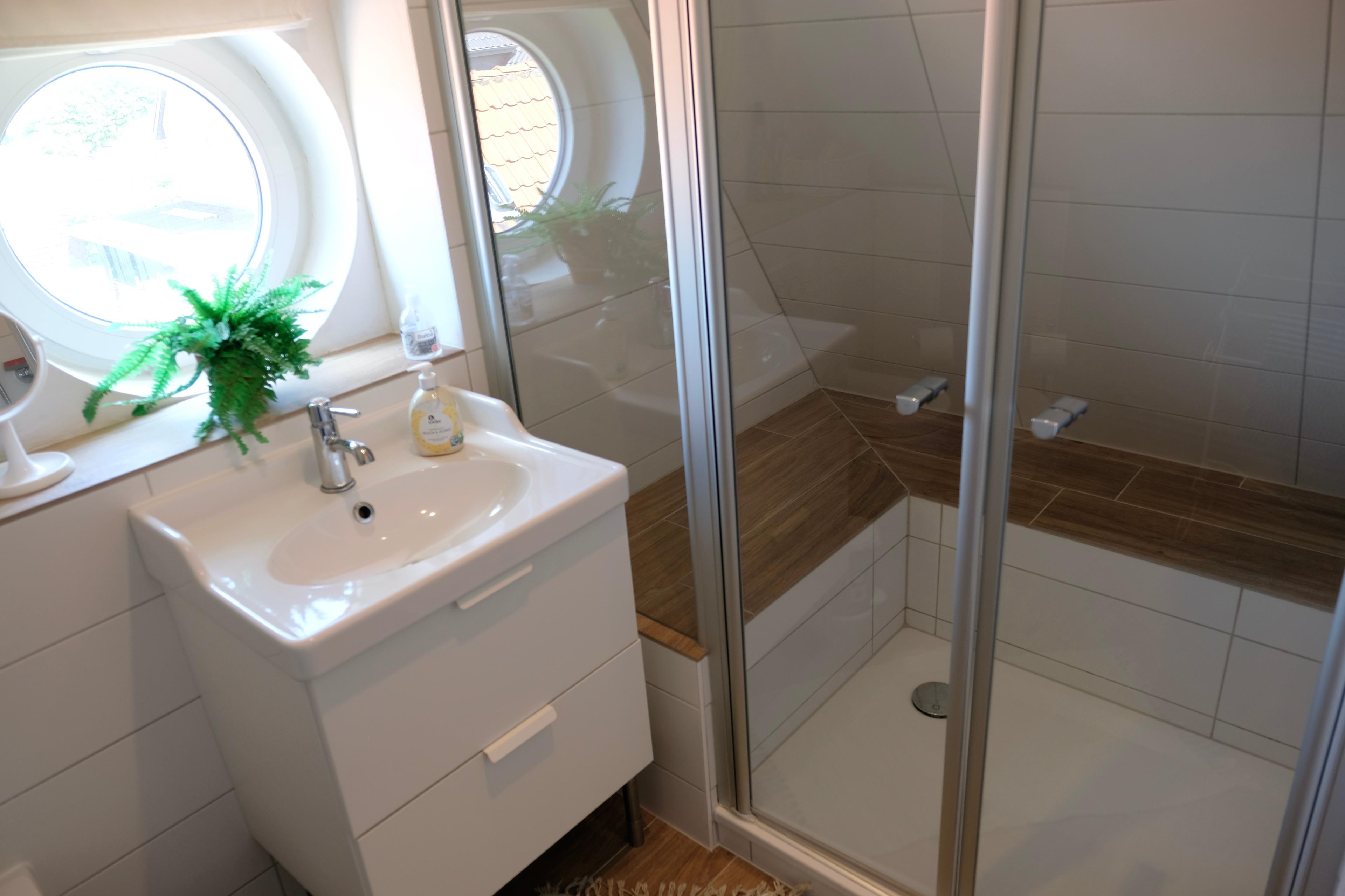 Das schöne Tageslichtbad im EG ist mit WC, Waschtisch und begehbarer Dusche ausgestattet.