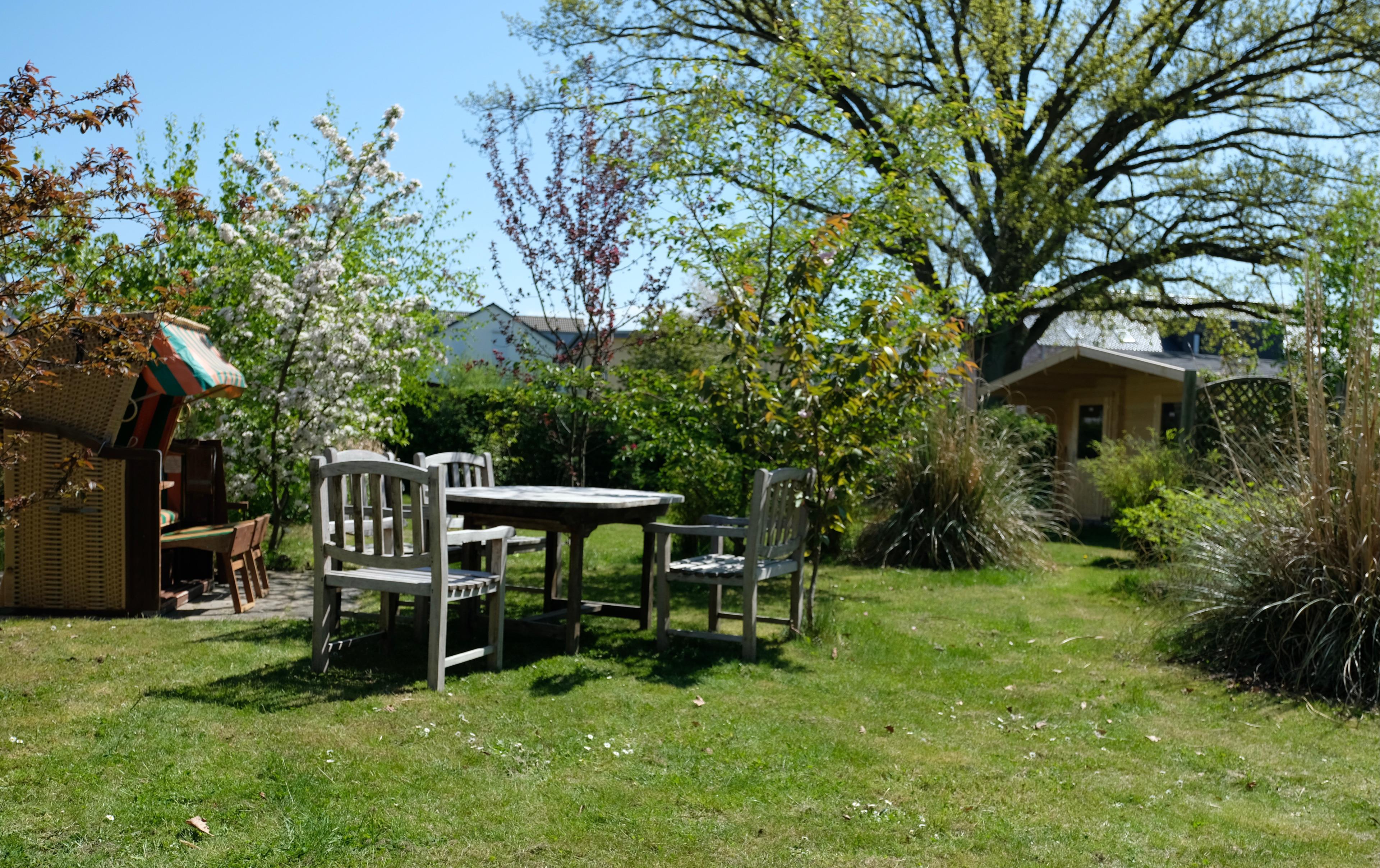Der 700 qm große eingezäunte Garten steht zur Alleinnutzung zur Verfügung. Er bietet Tische mit bequemen Gartenstühlen, Grill, Sonnenschirm, Liegen, Strandkorb und eine große Wiese.