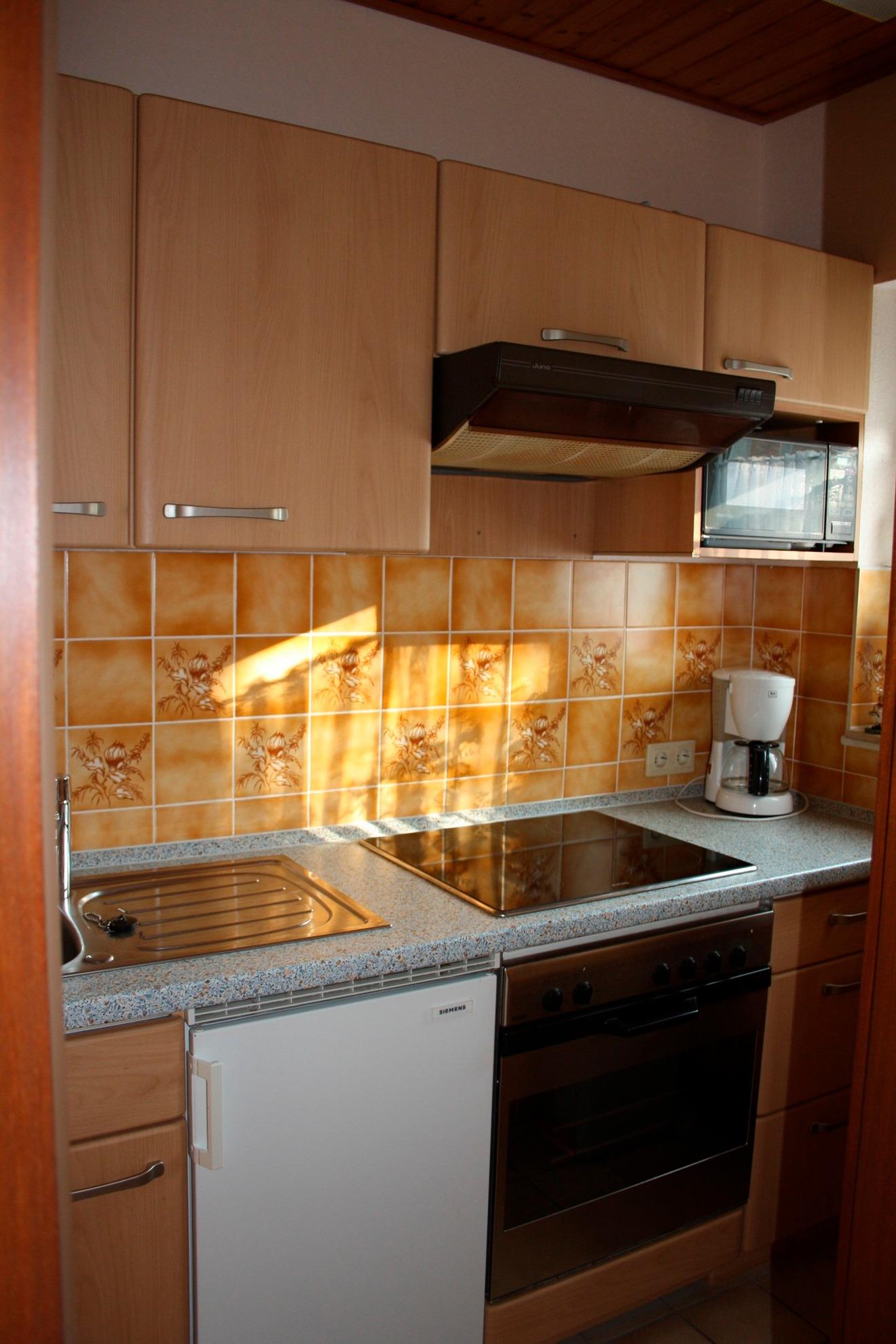 Die Küche ist mit einem Herd, einem Backofen, einer Mikrowelle, sowie einer Kaffeemaschine, einem Toaster und einem Kühlschrank mit Gefrierfach ausgestattet.