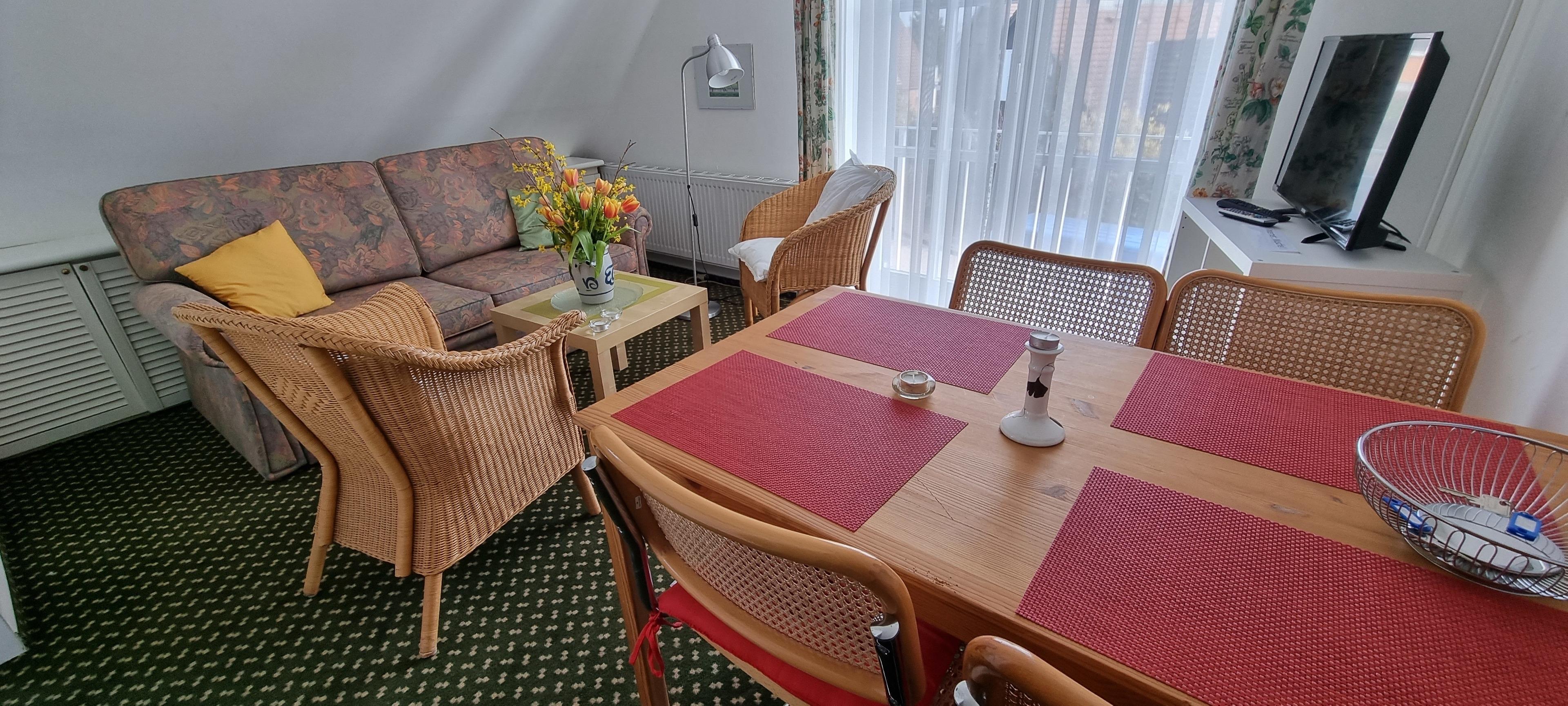 1 Schlafraum mit Doppelbett (kleines Kinderbett möglich), Wohnzimmer mit Doppelschlafcouch, Badewanne und Dusche