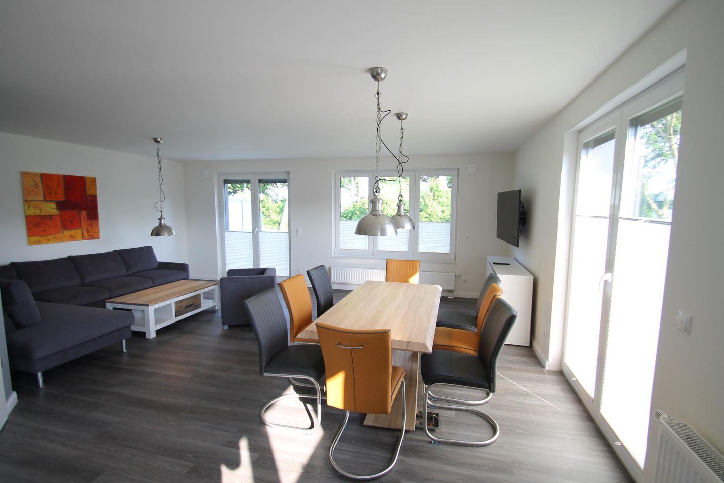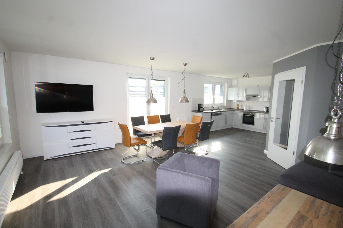 Moin, Moin und Herzlich Willkommen... Schöne Doppelhaushälfte in einer bevorzugten Wohnlage nahe dem Meer. Sie finden hier Platz für bis zu 8 Personen, mit viel Wohnqualität, komfortabel und stilsicher eingerichtet. Dieses Hausteil bietet für alle Jahreszeiten einen idealen Urlaubsrahmen. Die Wohnfläche (zirka 130 m²) verteilt sich wie folgt: Parterre: Entrée, Technikraum mit Waschmaschine und Trockner, Abstellraum, Duschbad, Wohnzimmer mit offener Küche und direktem Zugang zum Garten und zur Ostterrasse. Im OG befindet sich das schöne Vollbad. Schlafzimmer (1) mit Doppelbett (90x200 cm Matratzen) + TV, Schlafzimmer (2) mit Doppelbett (90x200 cm Matratzen), Schlafzimmer (3) mit Doppelbett (80x200 cm Matratzen) + TV, Schlafzimmer (4) im DG mit zwei Einzelbetten (90x200 cm Matratzen). Rollläden, W-LAN und 2 PKW-Stellplätze ergänzen die Komfortausstattung des Hauses. Und... vom Schlafzimmer im OG Teilmeerblick! Beide Doppelhaushälften sind gemeinsam eingezäunt. Zwei liebe Hunde sind herzlich willkommen.