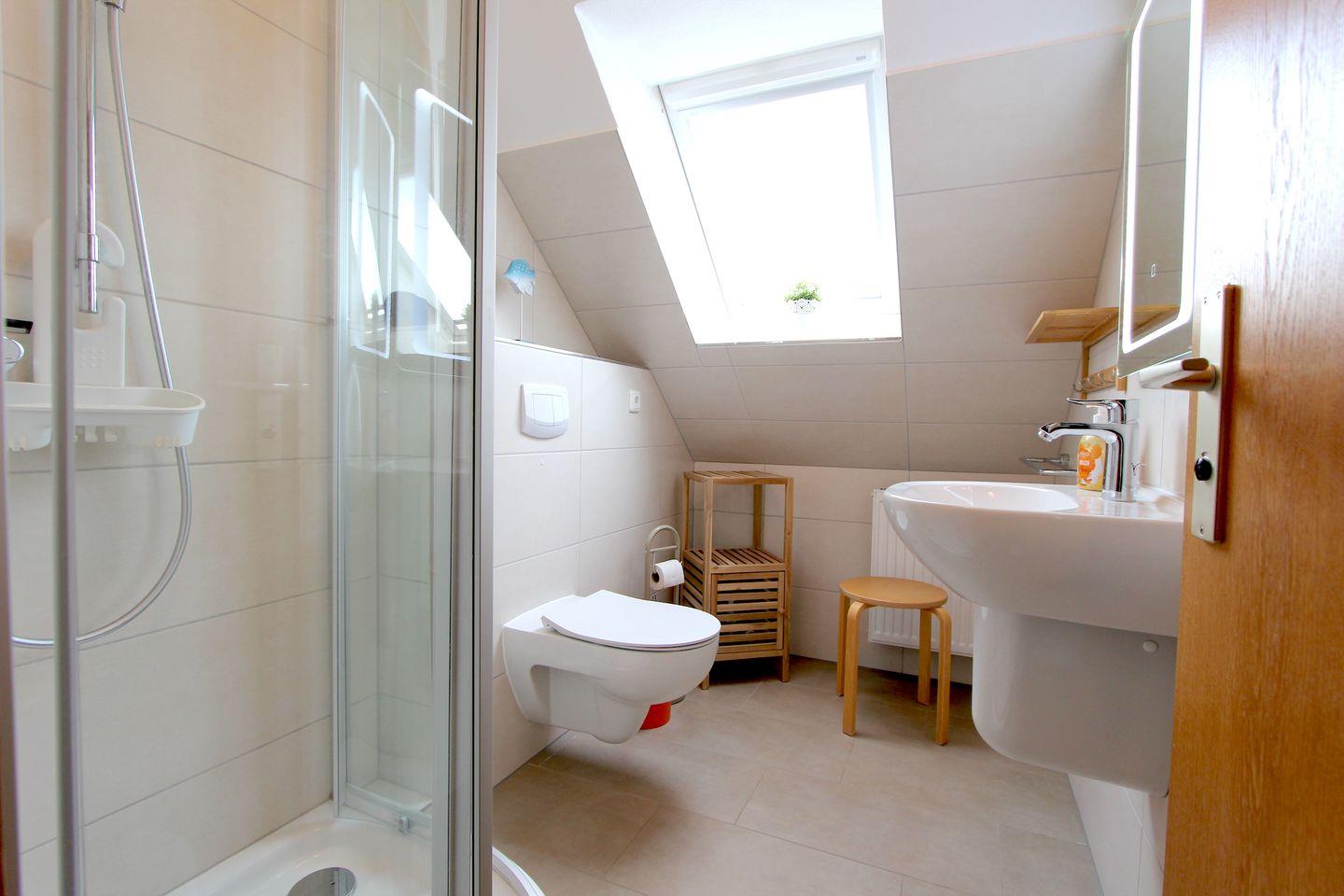 Das große Schlafzimmer hat ein Doppelbett in Komforthöhe und das moderne Badezimmer eine Dusche und genügend Ablagefläche für Ihre Kosmetikartikel.