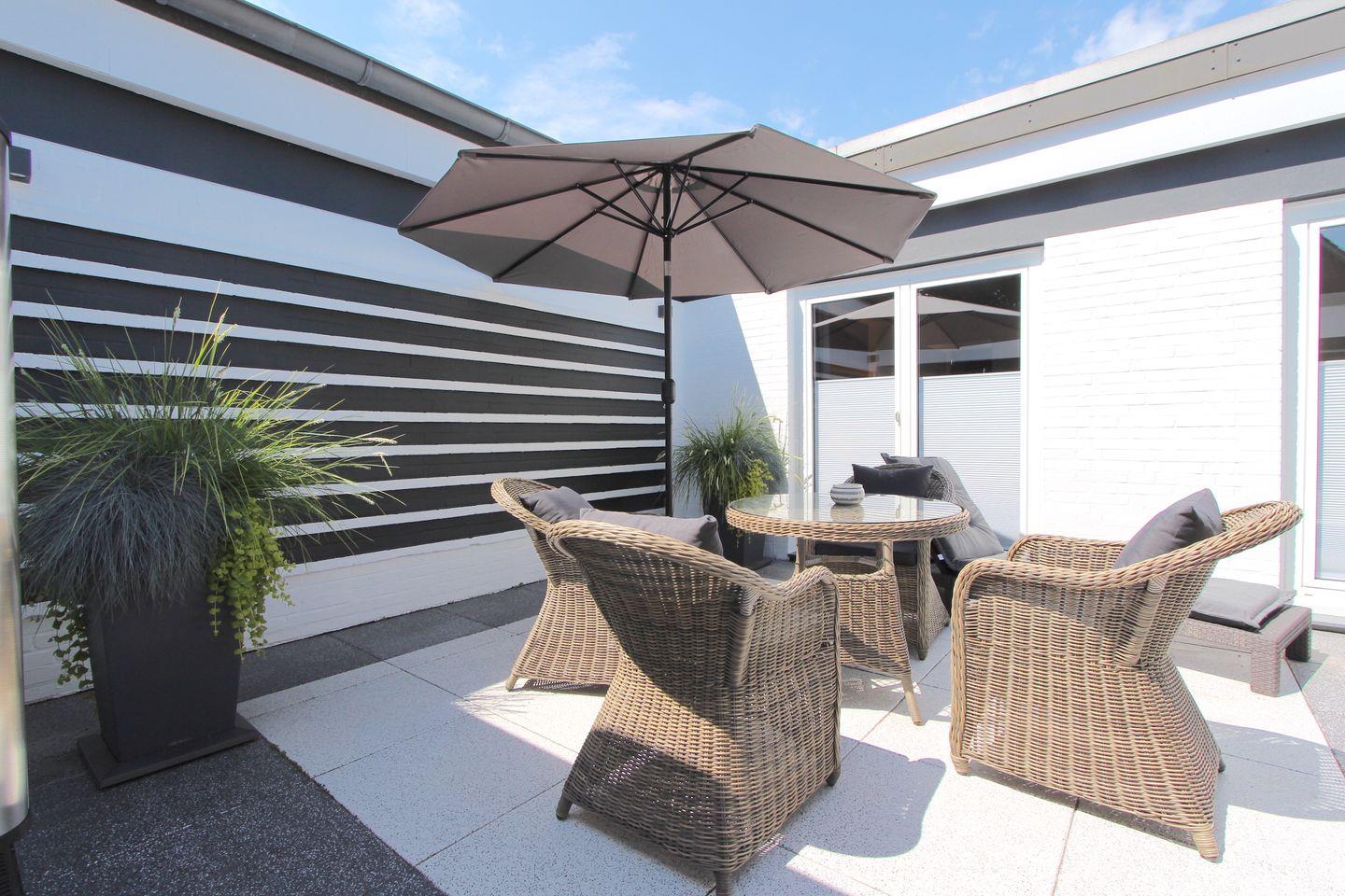 Im Außenbereich lädt eine private, möblierte Terrasse mit Gartenmöbeln und Sonnenschirm zum entspannten Verweilen ein. Dank des Carports sowie eines privaten Parkplatzes (inklusive Lademöglichkeit für Elektroautos) gestaltet sich Ihre Anreise auch mit dem eigenen Fahrzeug angenehm unkompliziert.