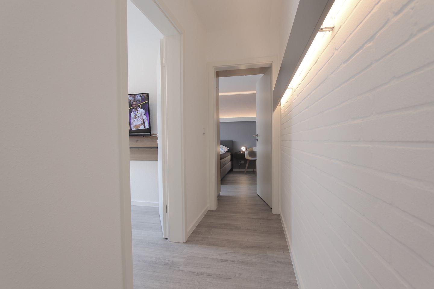 Das Ferienhaus bietet mit einer Wohnfläche von 69 m² ausreichend Platz für bis zu drei Personen. Es verfügt über zwei separate Schlafzimmer, was sowohl Familien mit Kind als auch Paaren oder kleineren Gruppen höchsten Komfort ermöglicht. Die Schlafbereiche sind mit Vinylboden ausgestattet und bieten Ihnen Sichtschutz an allen Fenstern, sodass Sie Privatsphäre und erholsame Nächte genießen können. Das Hauptschlafzimmer ist mit einem Boxspringbett (180 x 200 cm) und einem großen Kleiderschrank ausgestattet, in dem sich auch ein TV Gerät befindet. Das kleinere Schlafzimmer ist mit einem Einzelbett (90 x 200 cm) und einem Kleiderschrank und ebenso mit einem TV ausgestattet. Im offen gestalteten Wohn- und Essbereich erwartet Sie eine gemütliche Sofaecke mit großem Esstisch, Kabel-TV (drei Geräte mit Bildschirmgrößen von 44 bis 55 Zoll) sowie eine HiFi-Anlage für entspannte Abende.