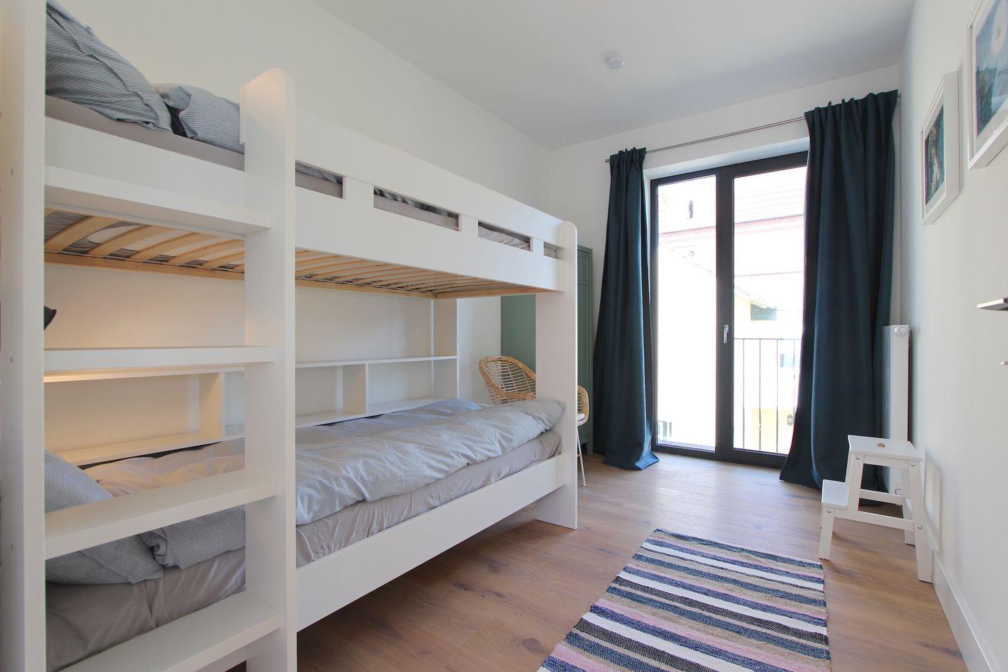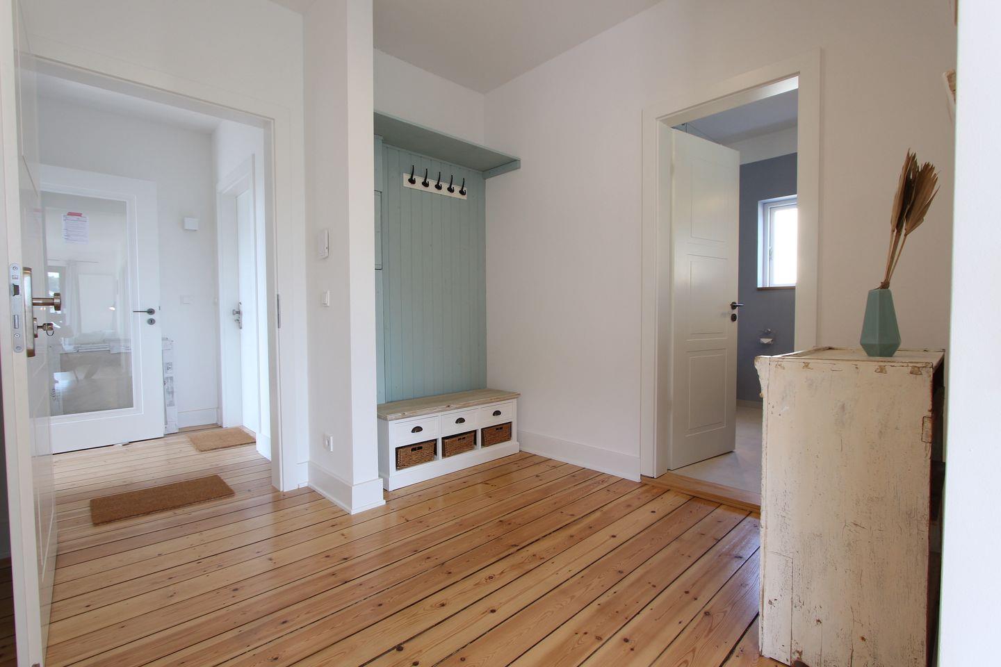 Diese vollständig in 2022 sanierte ca. 68qm große und modern eingerichtete Ferienwohnung im 1. OG, mit kombiniertem Wohn- und Essbereich, überzeugt durch eine stilvolle Einrichtung und bietet Platz für eine Familie mit 2 Erwachsenen und 2 Kindern. Im Wohnbereich erwartet Sie ein bequemes Sofa, sowie ein Smart-TV-Flachbildfernseher. Der Esstisch bietet ausreichend Platz für die ganze Familie. Die offene Küche ist modern und gut ausgestattet. Ihnen stehen Annehmlichkeiten wie z. B. ein Backofen, ein Kühlschrank, ein Geschirrspüler sowie eine Kapsel-Kaffeemaschine zur Verfügung. Ein separates Schlafzimmer erwartet Sie mit einem komfortablen Doppelbett (2x 90x200 cm) und einem Kleiderschrank. Das weitere, separate Schlafzimmer ist mit einem Etagenbett (je 90x200 cm) ausgestattet. Beide Schlafzimmer lassen sich angenehm abdunkeln. Das hell geflieste Badezimmer mit Fenster verfügt neben einem WC und einem Waschbecken über eine Dusche. Der möblierte Balkon eignet sich ideal, um dort viele schöne Urlaubsstunden zu verbringen. Insgesamt liegt das Objekt in bester zentraler Lage, das Auto kann auf dem dazugehörigen Parkplatz bleiben, denn bis zum Sandstrand sind es nur 6 Gehminuten.