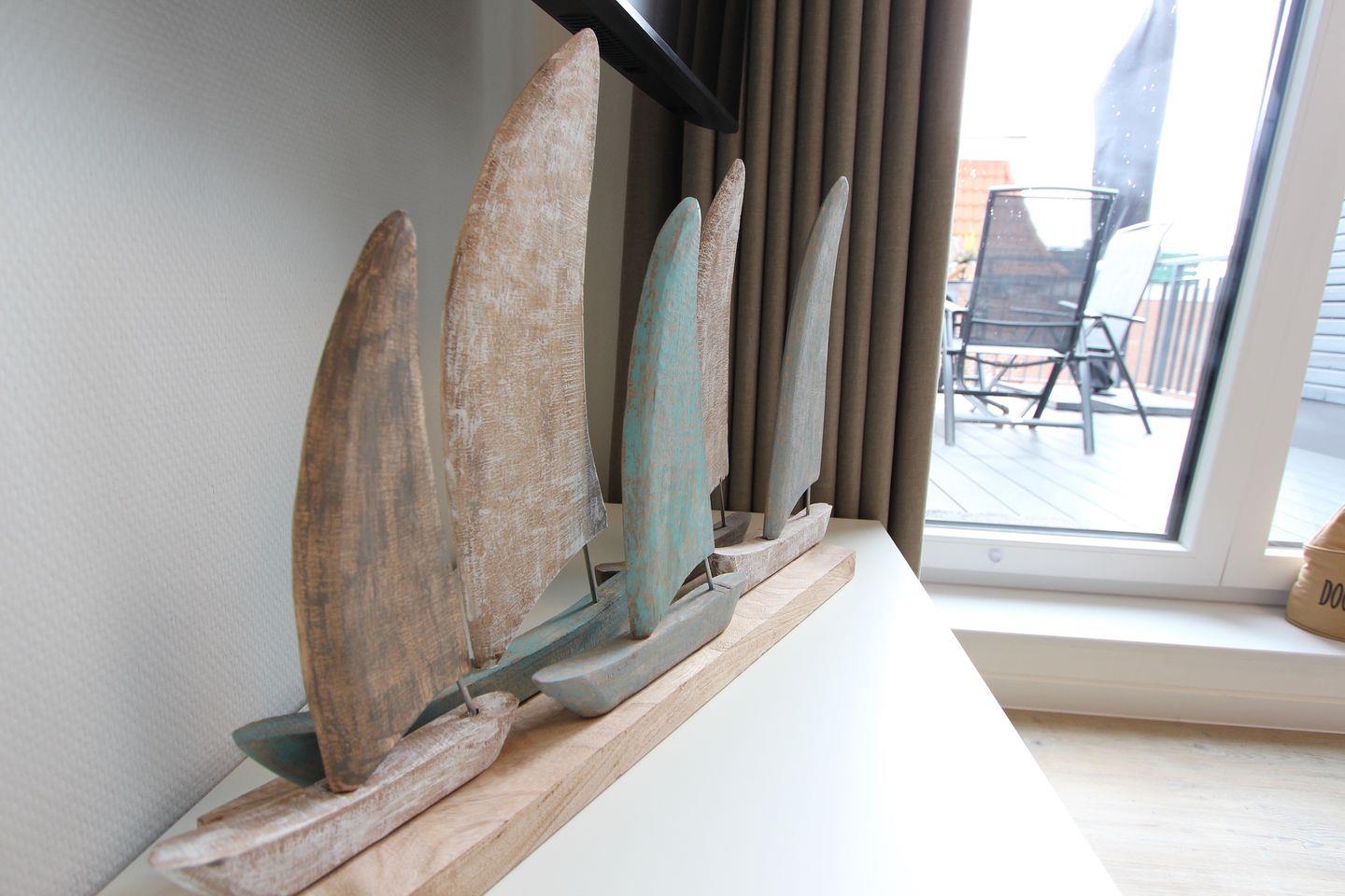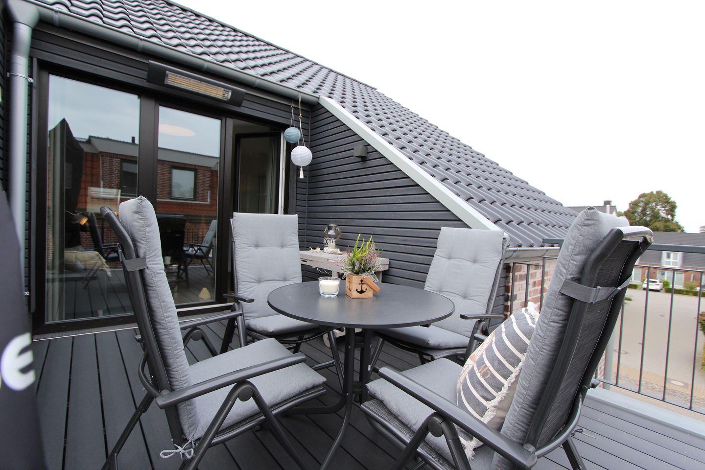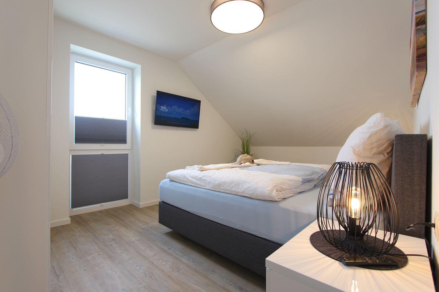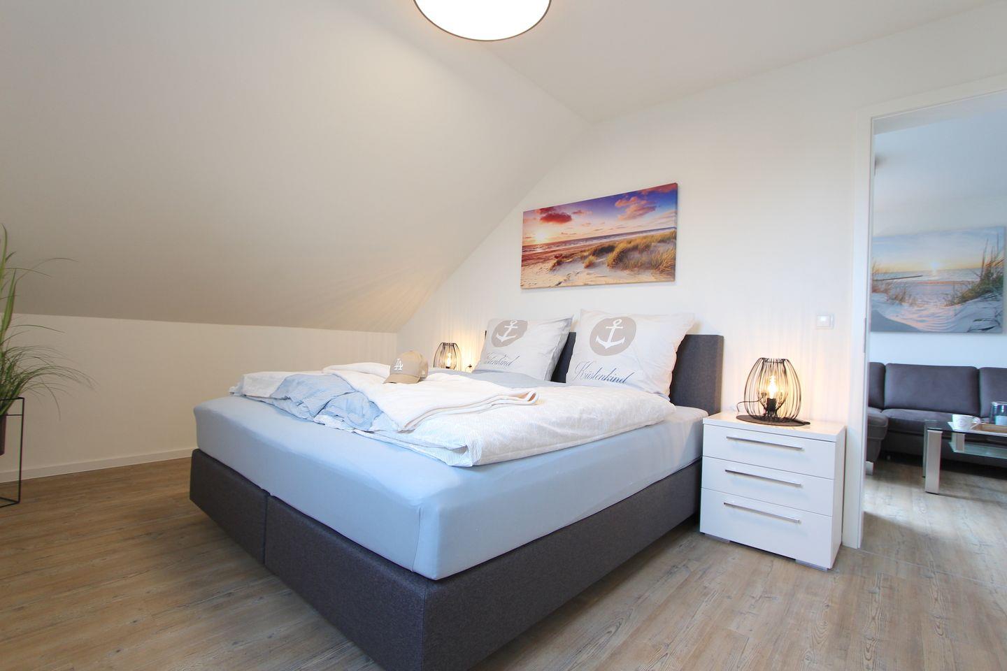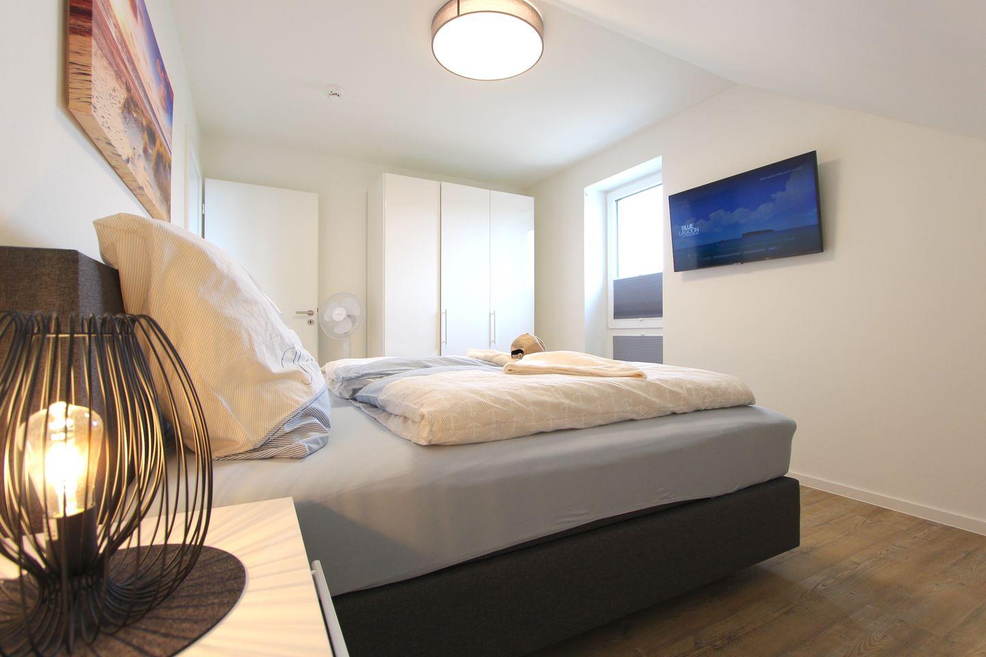 Im Wohn-Schlafbereich mit Verdunkelungsmöglichkeit können Sie sich in einem hochwertigen Boxspringbett (180 x 200 cm) zur Nachtruhe begeben. Das großzügige Duschbad mit eigener Sauna verspricht Wellness-Feeling und sorgt für Wärme und Entspannung, besonders in der kühlen Jahreshälfte. Die möblierte Dachterrasse eignet sich ideal, um dort viele schöne Urlaubsstunden zu verbringen. Um Ihnen auch im Urlaub den Zugriff auf Nachrichten und Neuigkeiten zu ermöglichen ist die Wohnung mit WLAN ausgestattet.