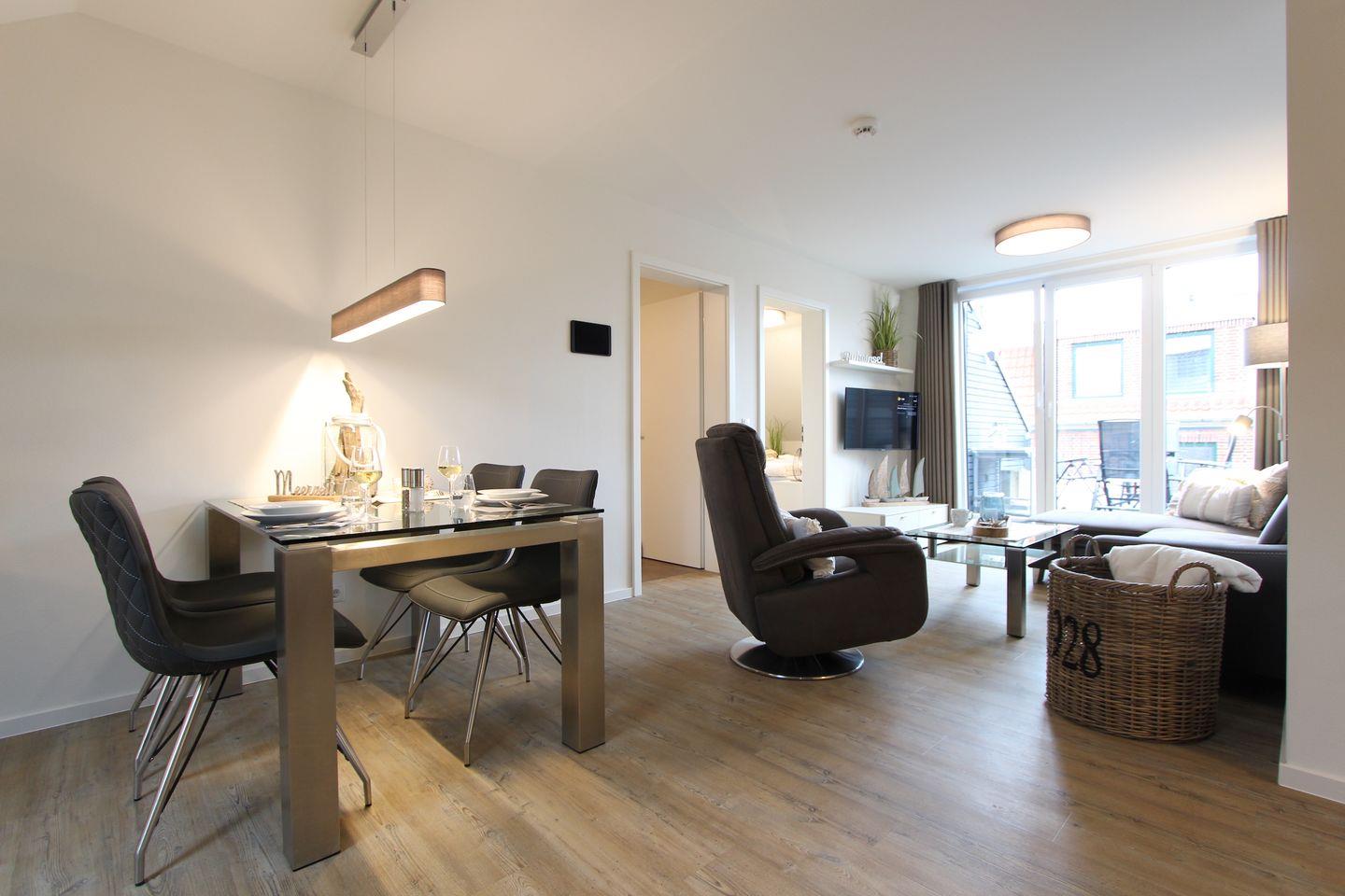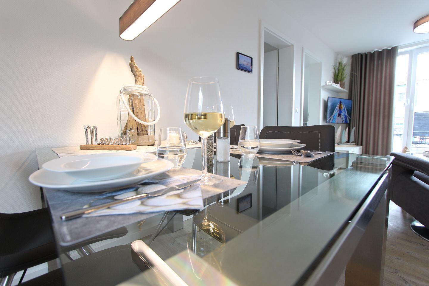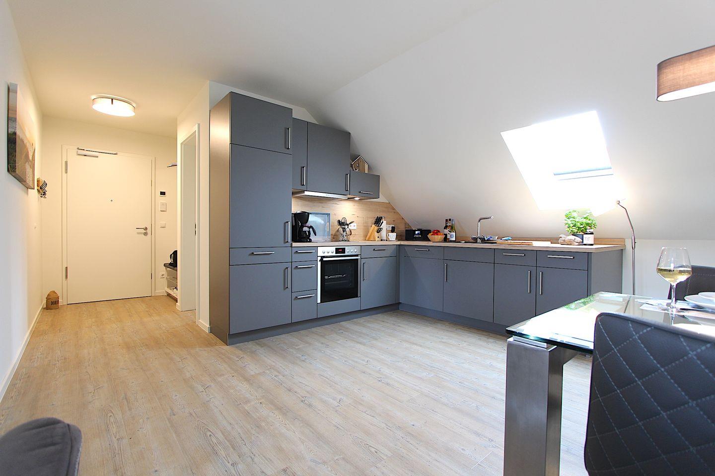 Diese in 2022 gebaute ca. 68 qm große und modern eingerichtete Ferienwohnung im 2. OG ist bequem mit dem Aufzug zu erreichen. Der kombinierte Wohn- und Essbereich, überzeugt durch eine stilvolle Einrichtung und bietet Platz für 2 Personen. Im Wohnbereich erwartet Sie ein bequemes Sofa, ein Fernsehsessel sowie ein Smart-TV-Flachbildfernseher. Das Zubereiten der Mahlzeiten wird Ihnen in der offenen, gut ausgestatteten Küche sicherlich Freude bereiten. Ihnen stehen Annehmlichkeiten wie z. B. ein Backofen, ein Kühlschrank, ein Geschirrspüler sowie eine Kaffeemaschine zur Verfügung.
